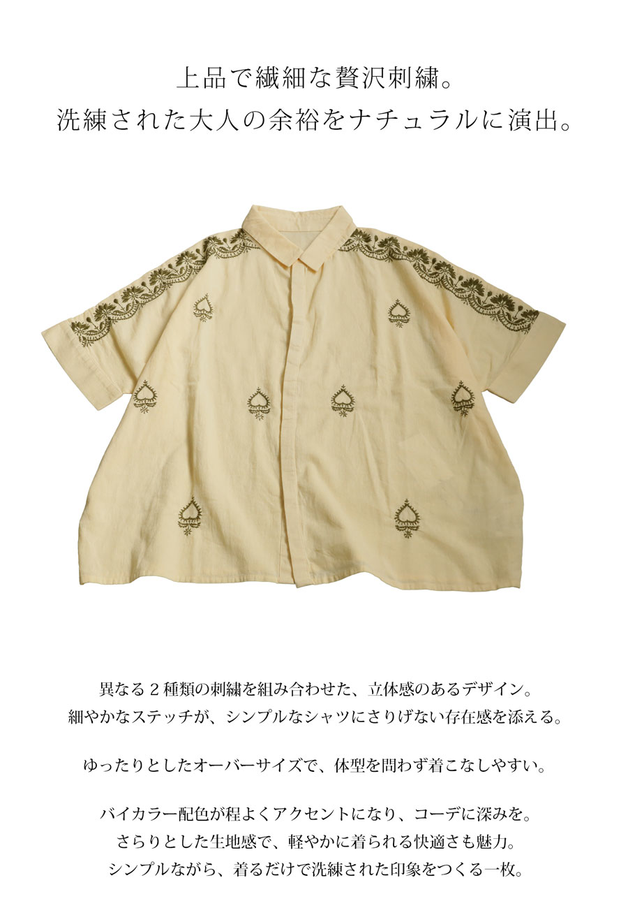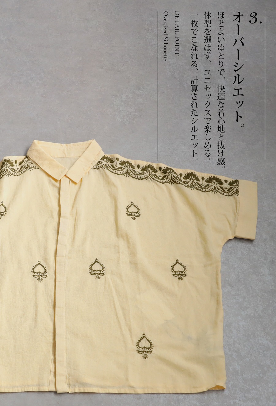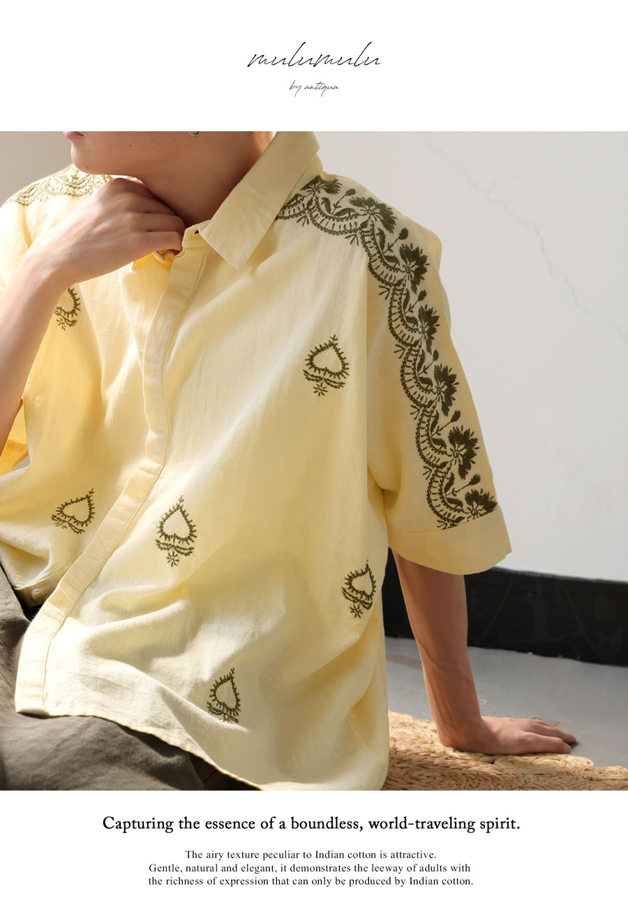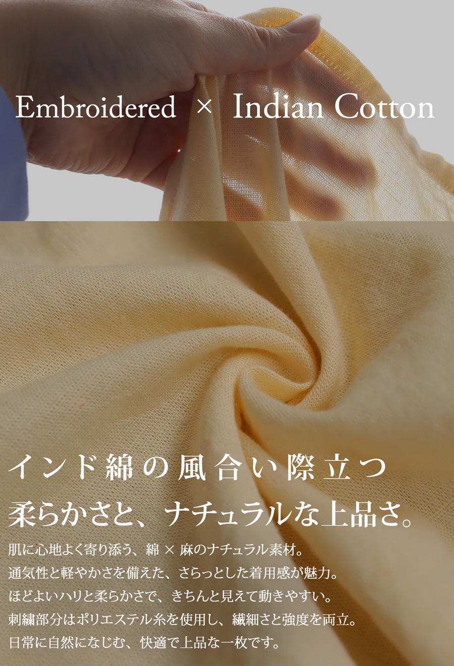繊細な刺繍が際立つ、インド綿素材の上品なシャツ。