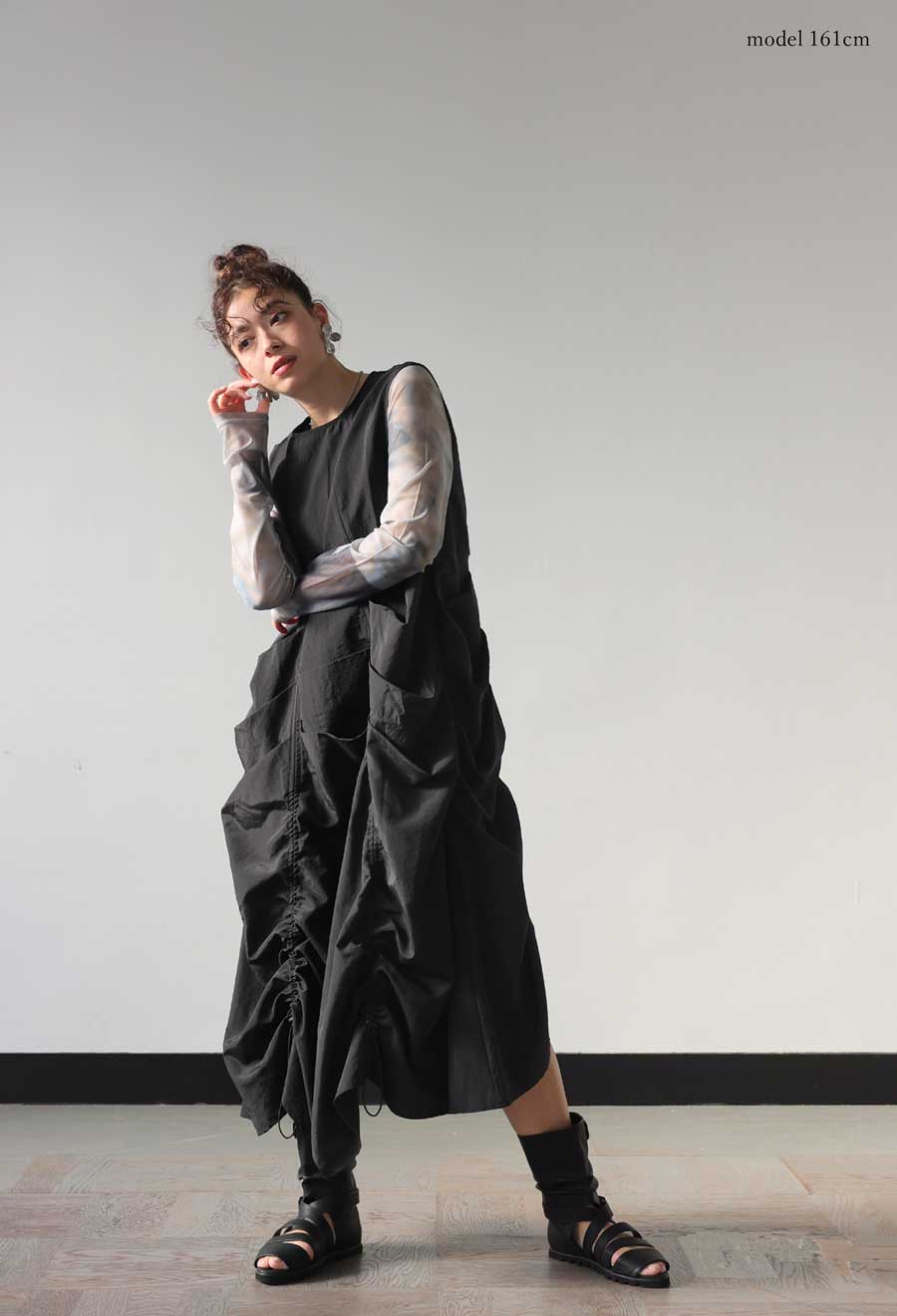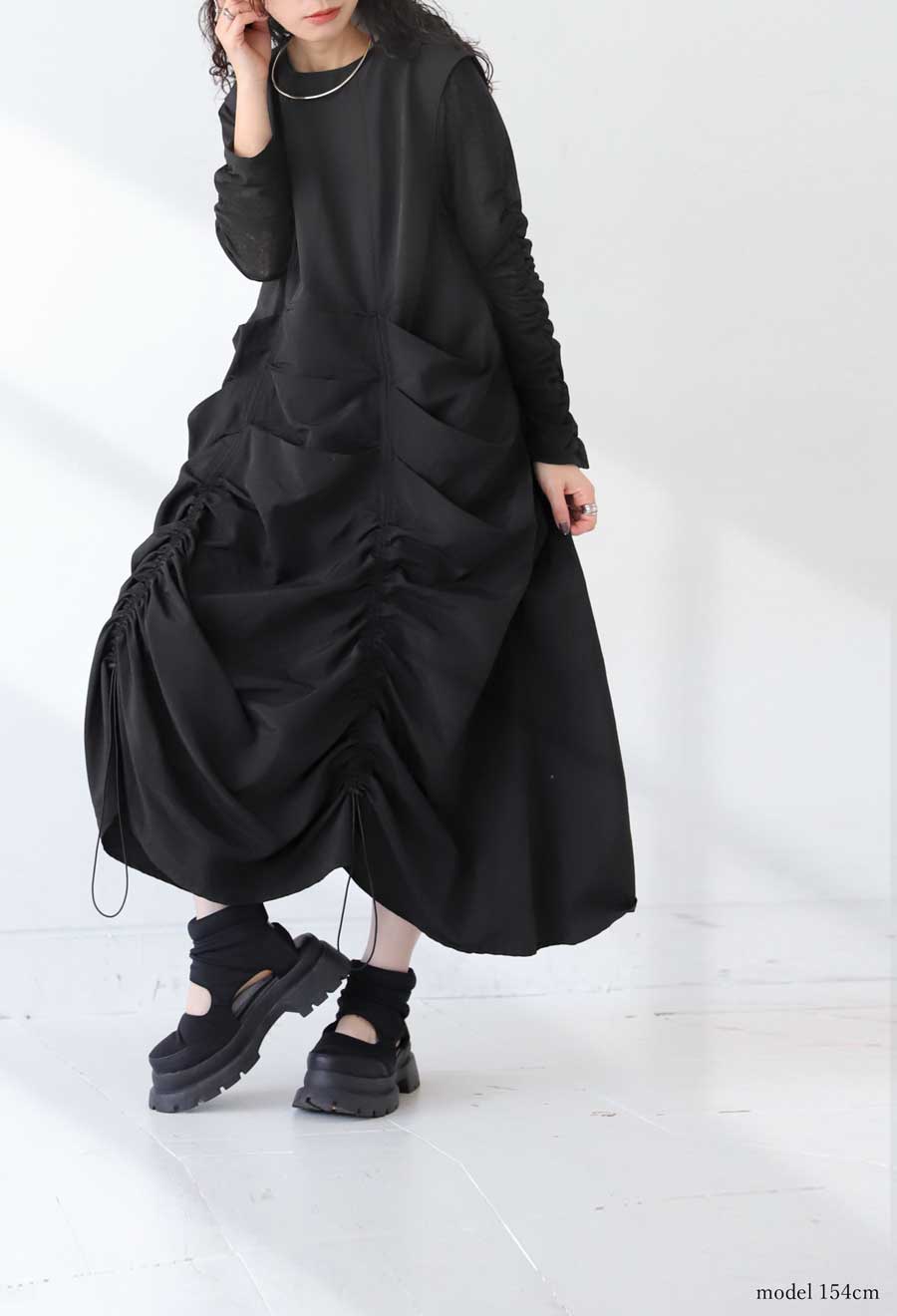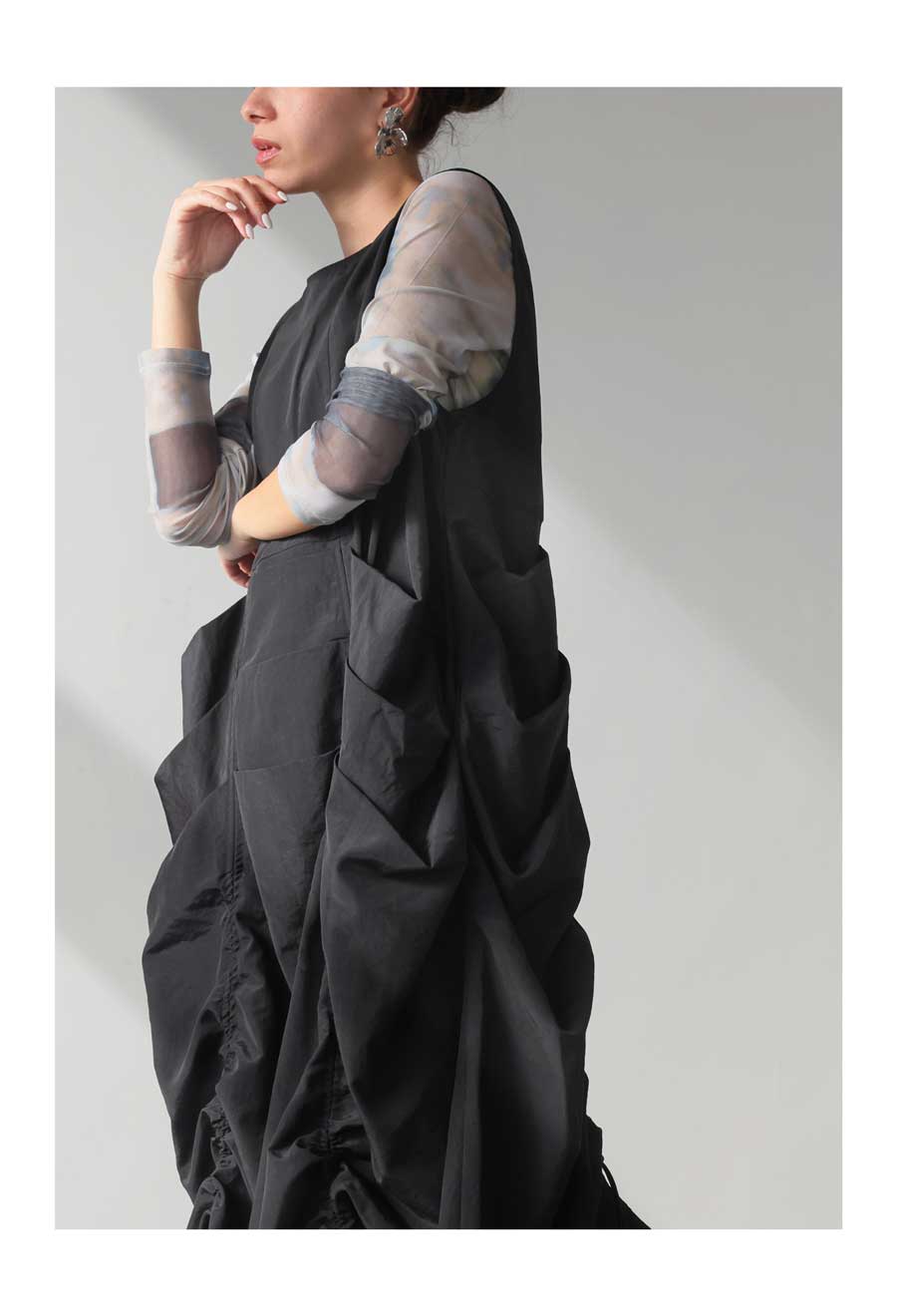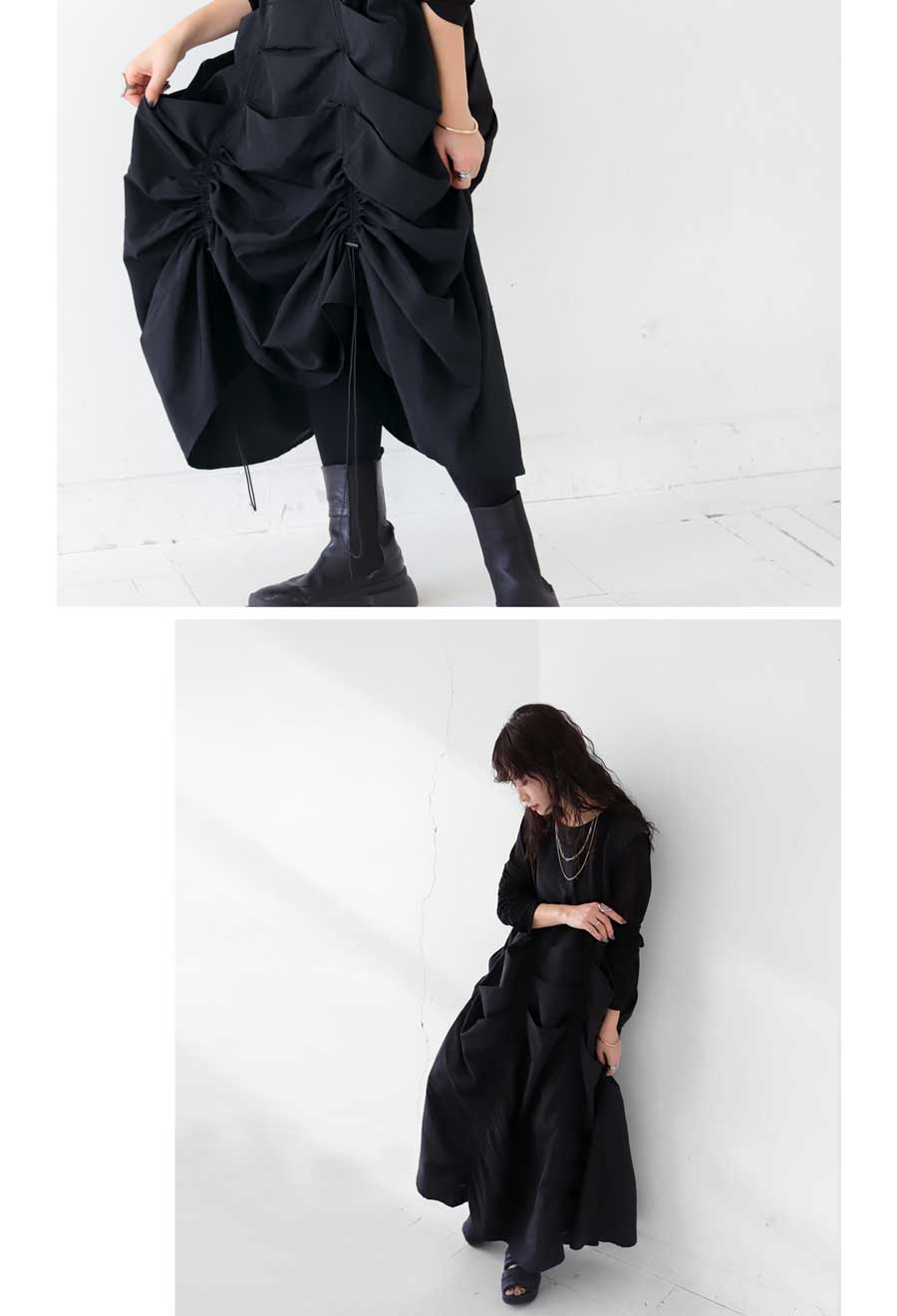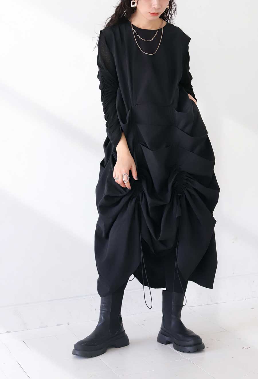 ・モード感溢れるギャザーデザイン。