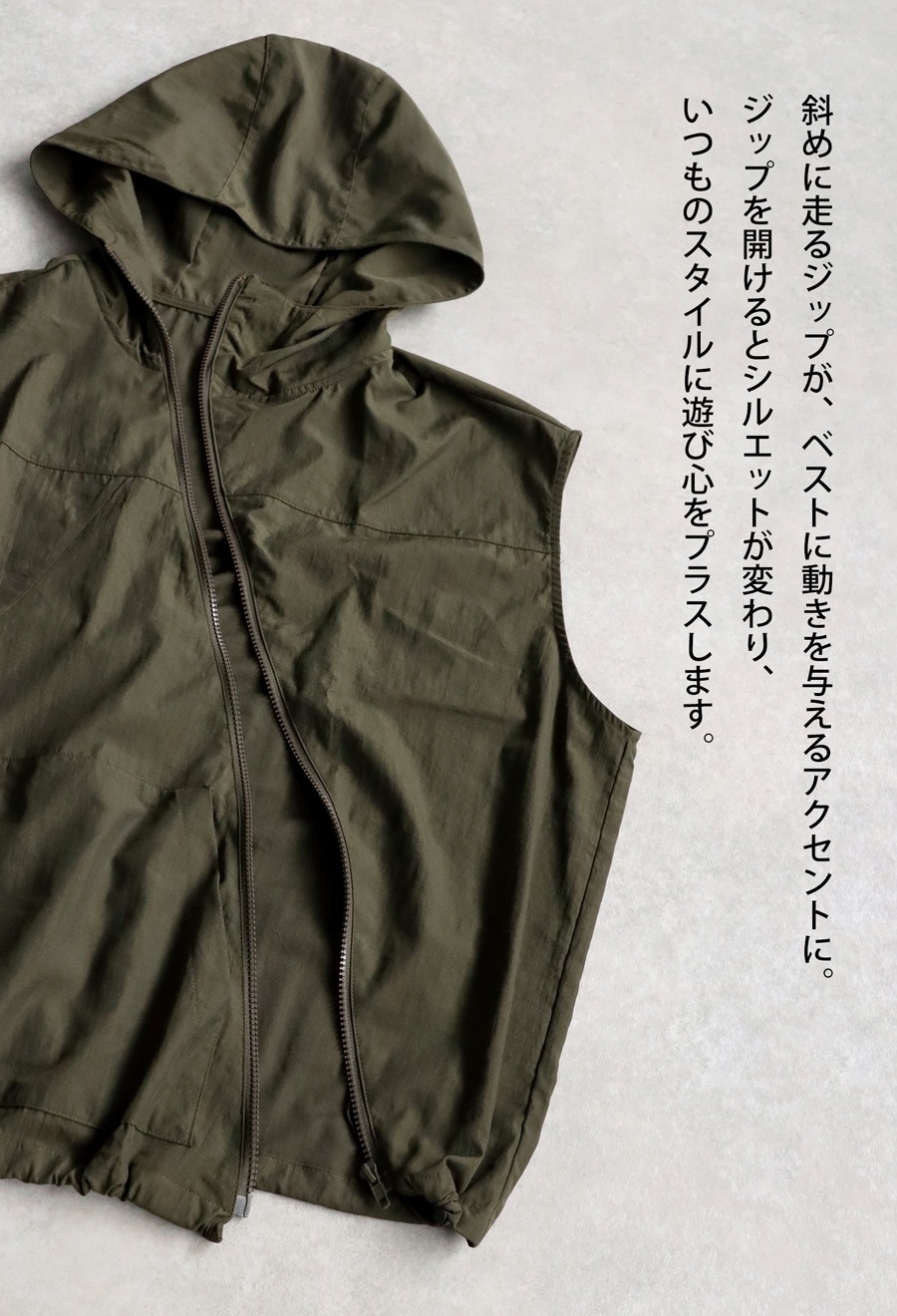 いつものスタイルにひとさじの個性をプラスしてくれる、アシンメトリーデザインのジップアップベストが登場。