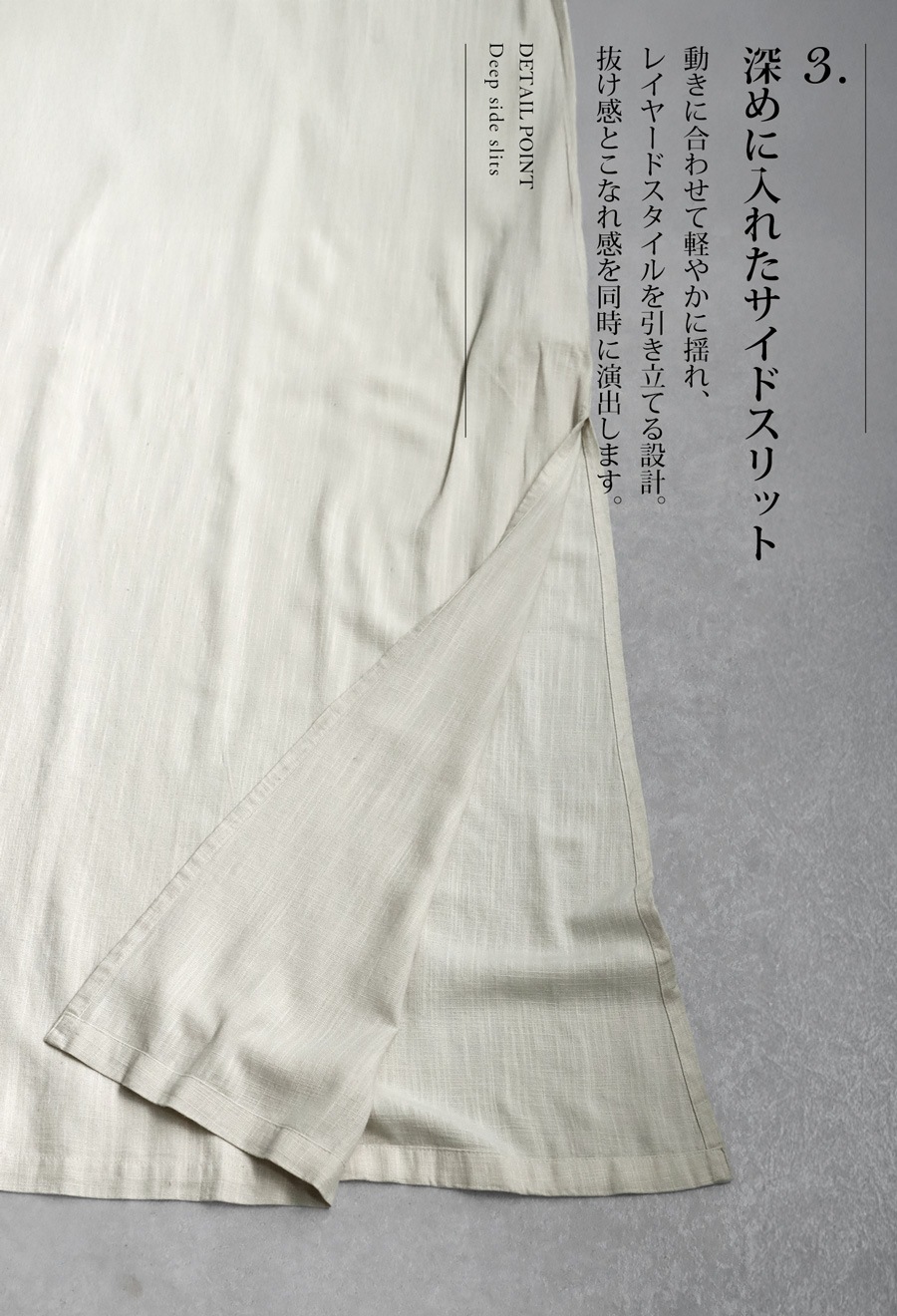 滑らかな落ち感が美しいレーヨン×リネン混素材を使用し、軽やかでナチュラルな風合いを実現。