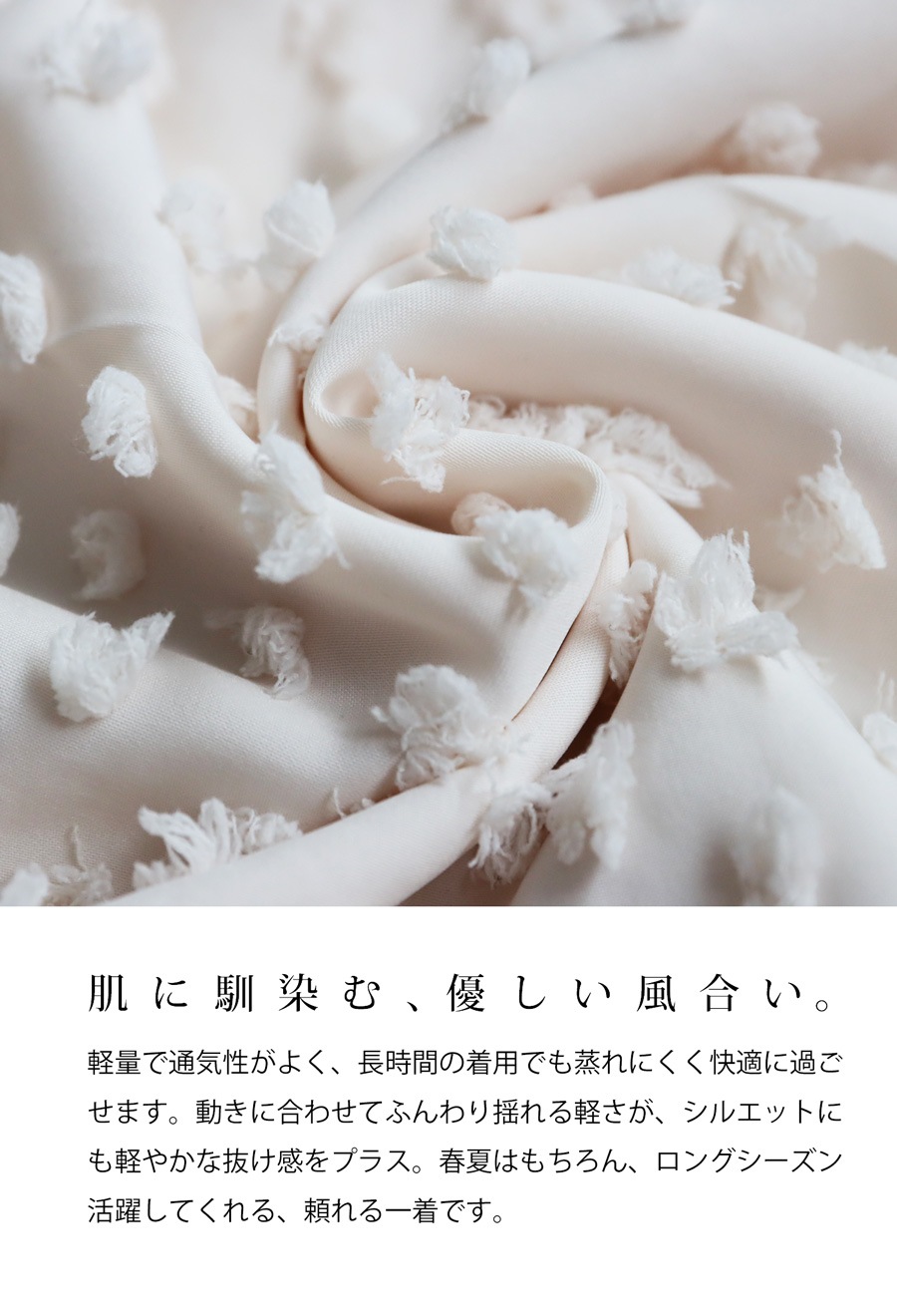 軽やかで通気性のある生地感が、ロングシーズン快適な着用感を叶え、動くたびにふんわり揺れるシルエットが印象的です。