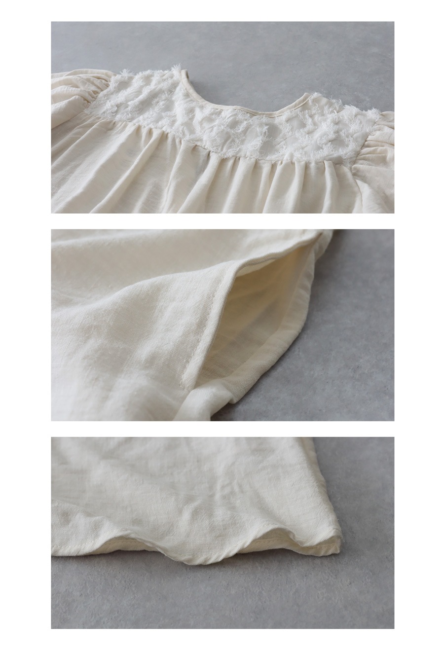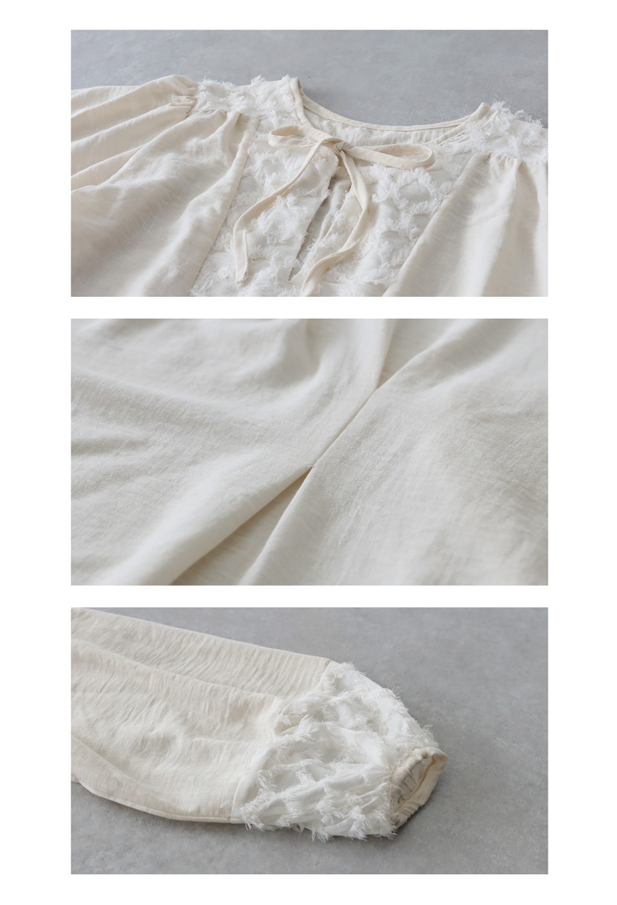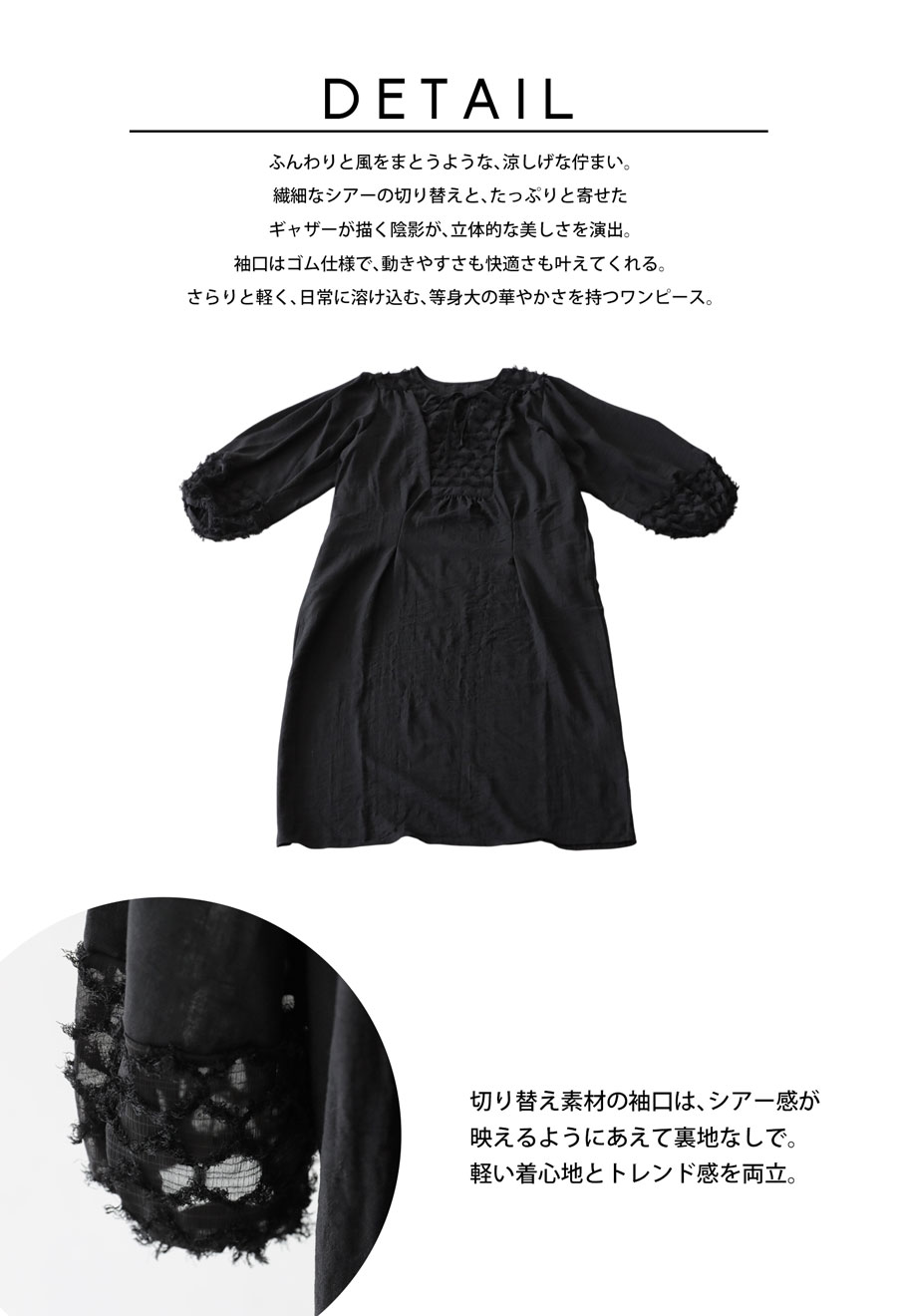 切替部分の立体的な刺繍風素材や、ギャザーによる陰影が、着るだけで華やかに。