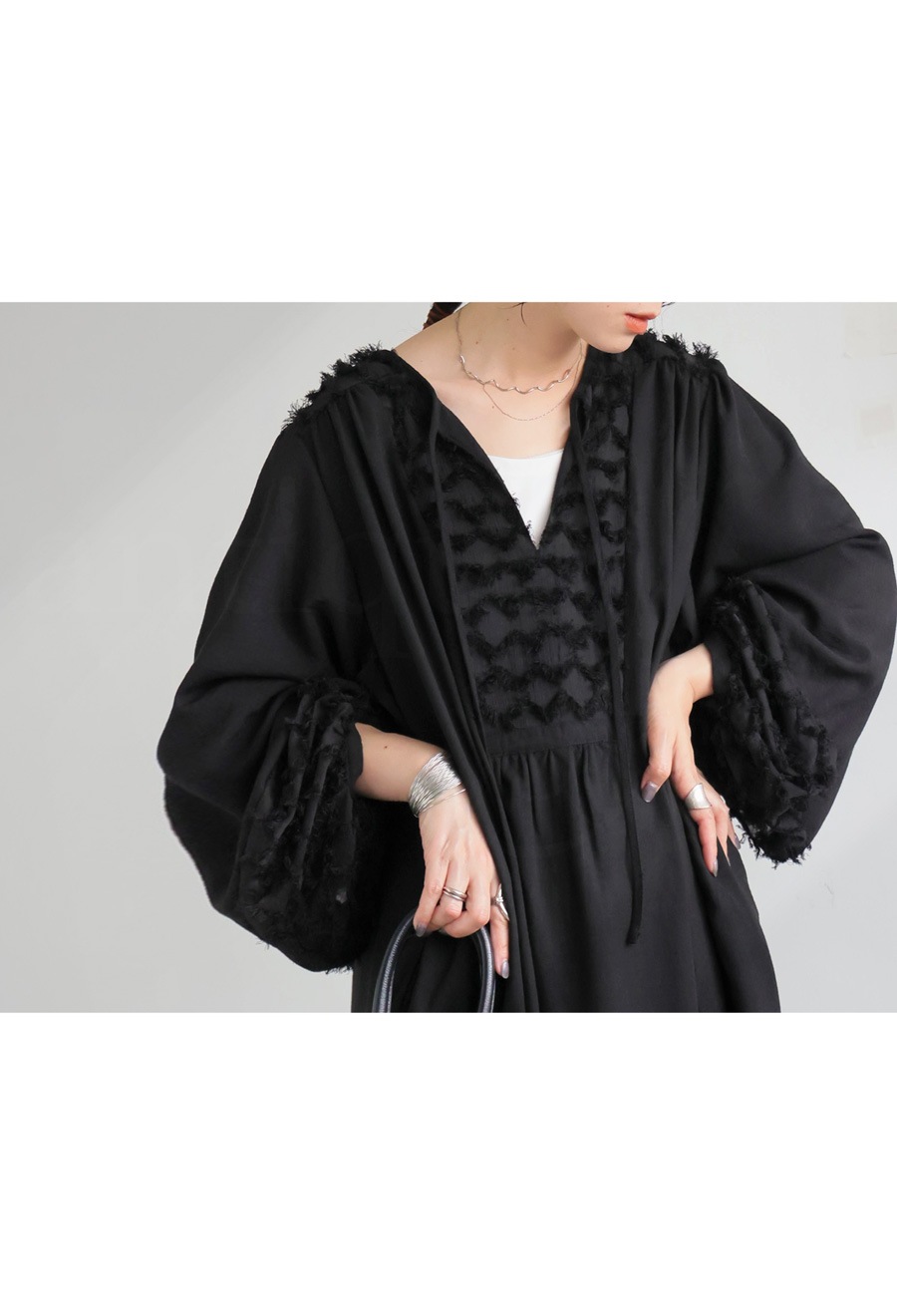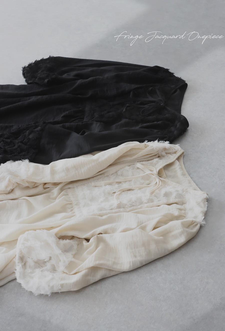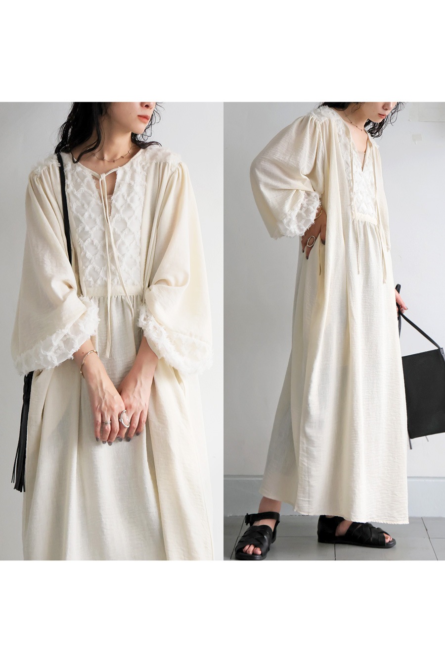 切替部分の立体的な刺繍風素材や、ギャザーによる陰影が、着るだけで華やかに。
