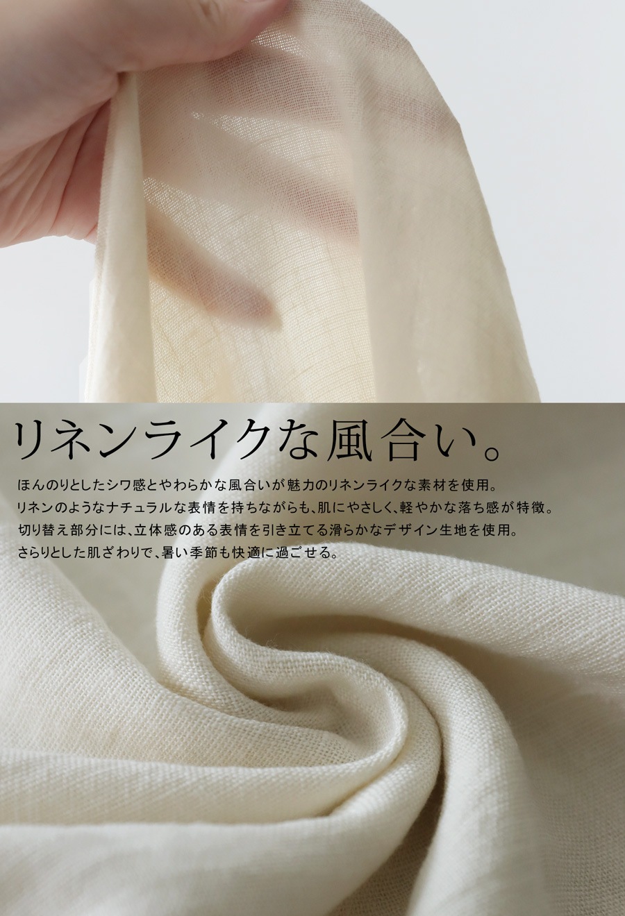 リネンのようなナチュラルな表情を持つ生地は、軽やかで肌なじみが良く、春や秋にも快適な着心地を叶えます。