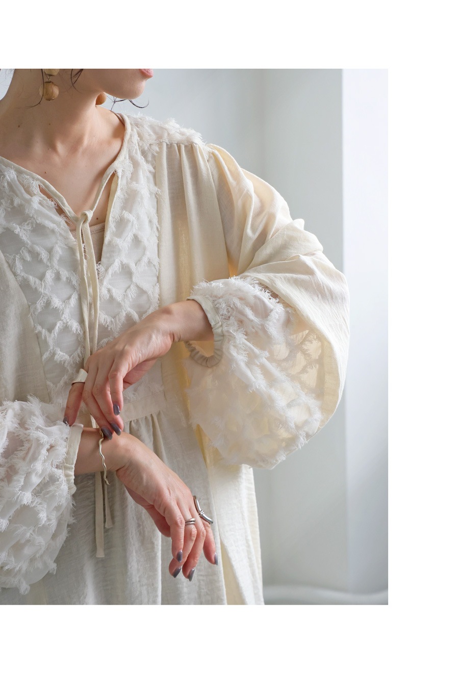 袖と前後のヨーク部分には、ほんのり透けるシアーな素材を切り替えて使用し、繊細な陰影と軽やかな表情を演出。