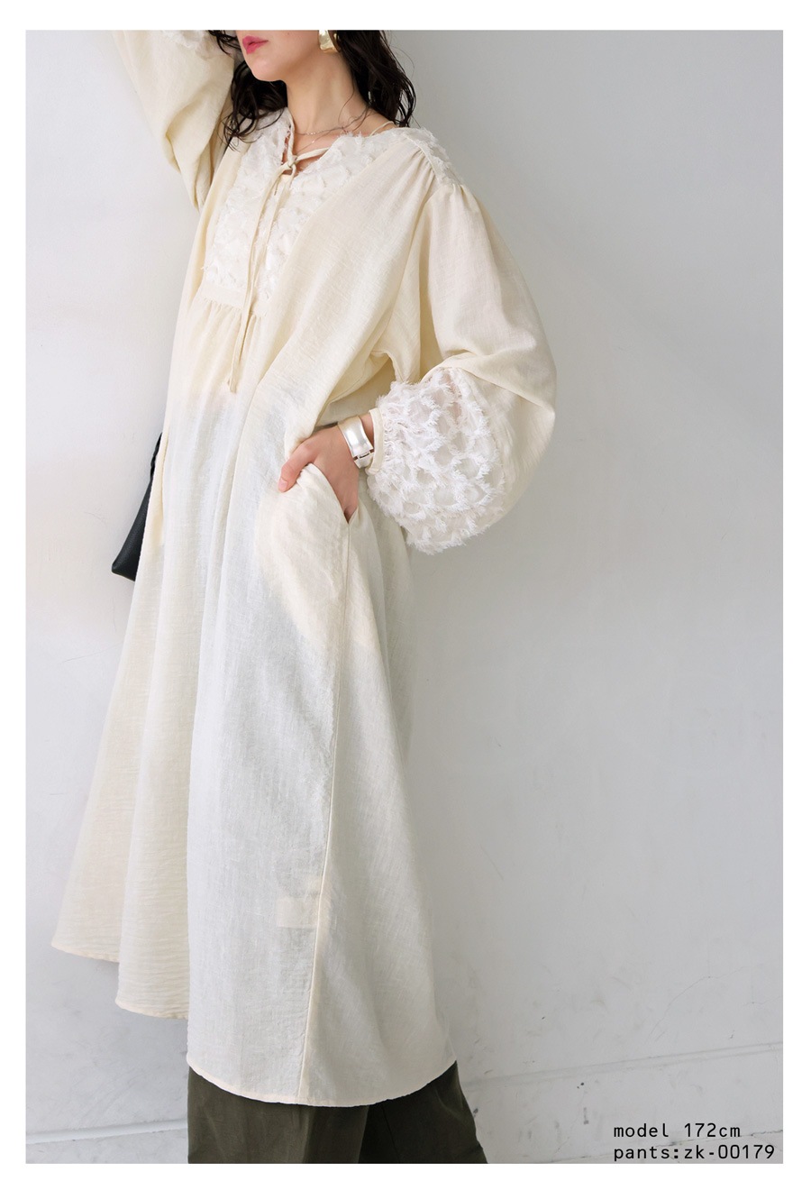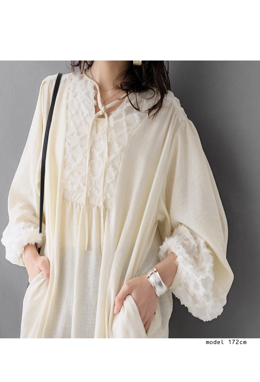 襟元にはリボン付きで、結んで甘く、垂らして抜け感を出すなどアレンジ自在。