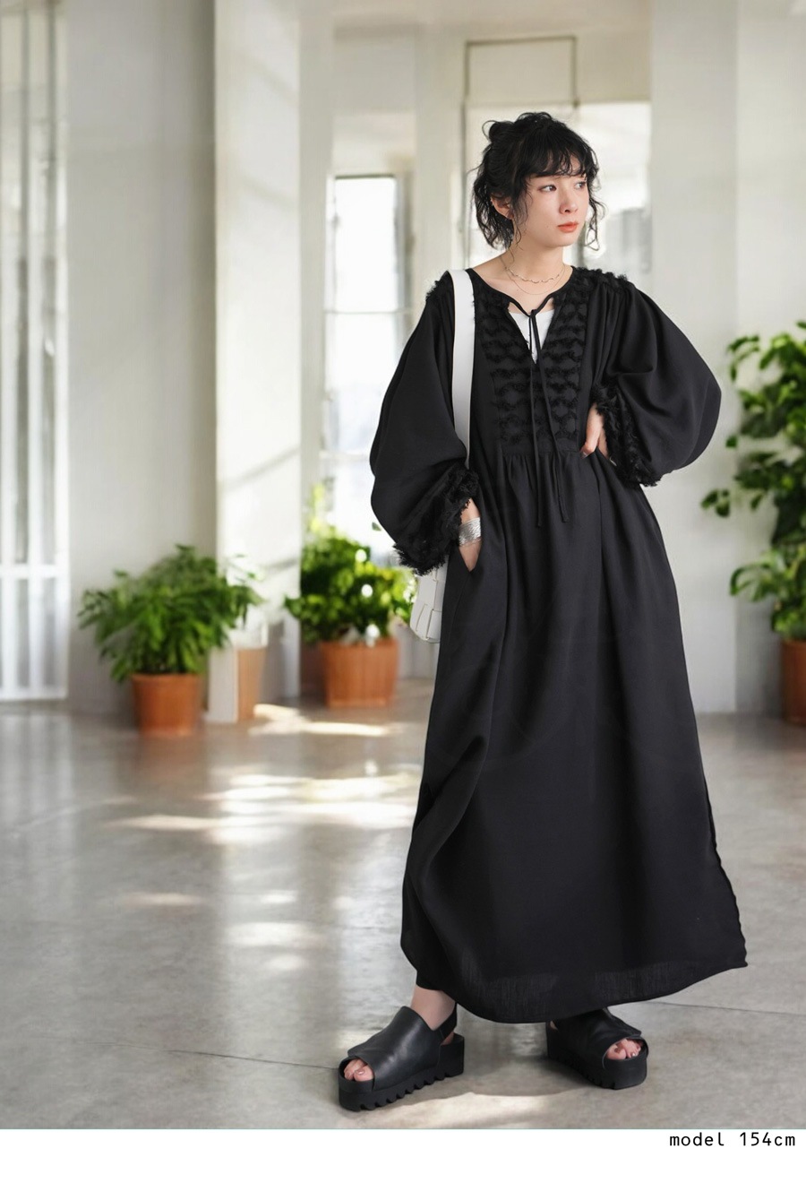 涼やかな風合いと女性らしい華やかさを両立した、リネンタッチ素材の長袖ギャザーワンピース。