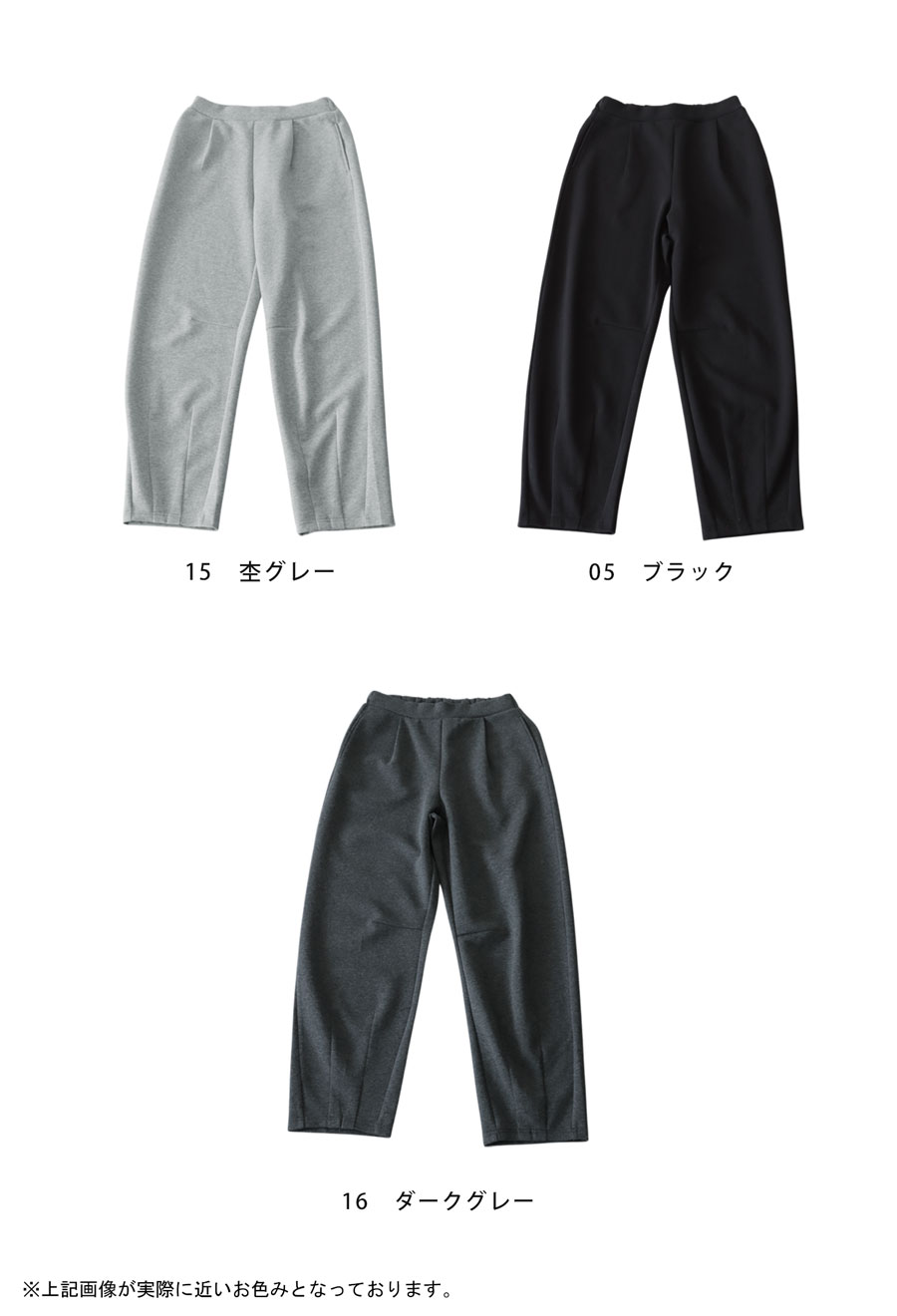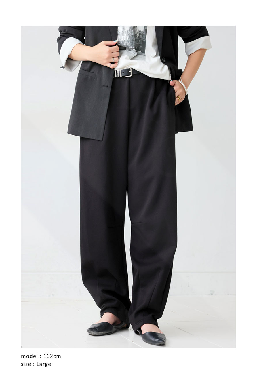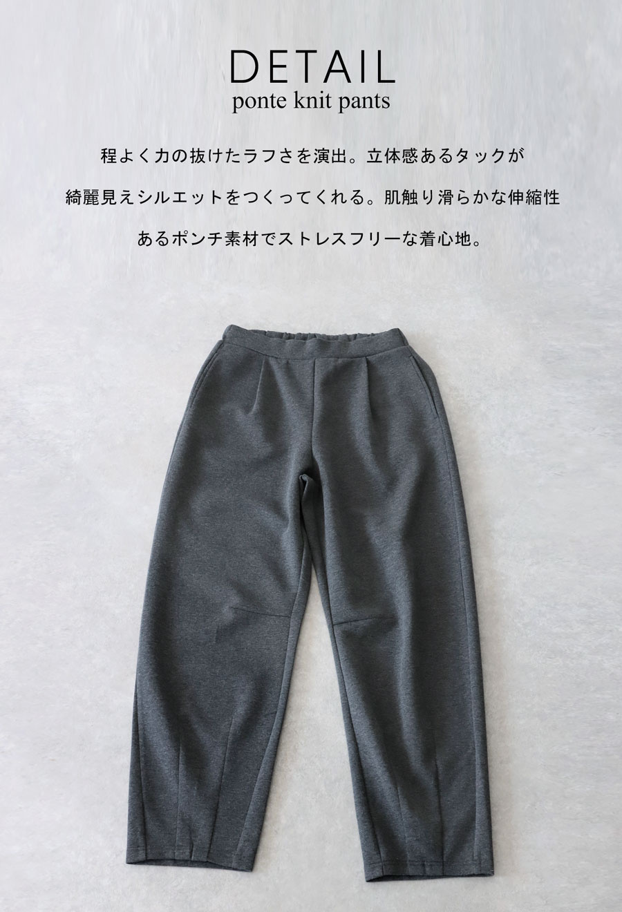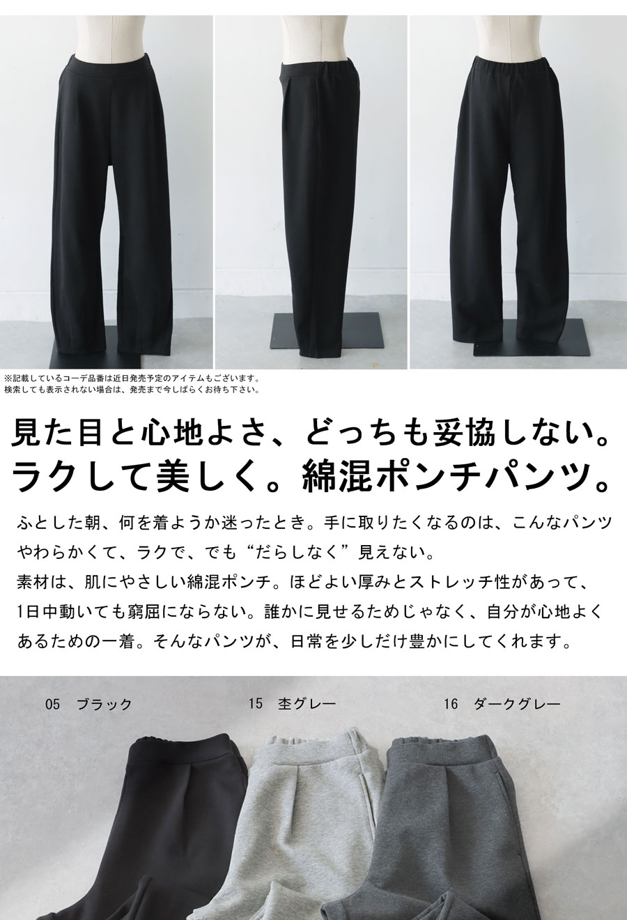前タックがつくる端正なラインで、ラクにきれい見えする綿混ポンチ素材のパンツです。