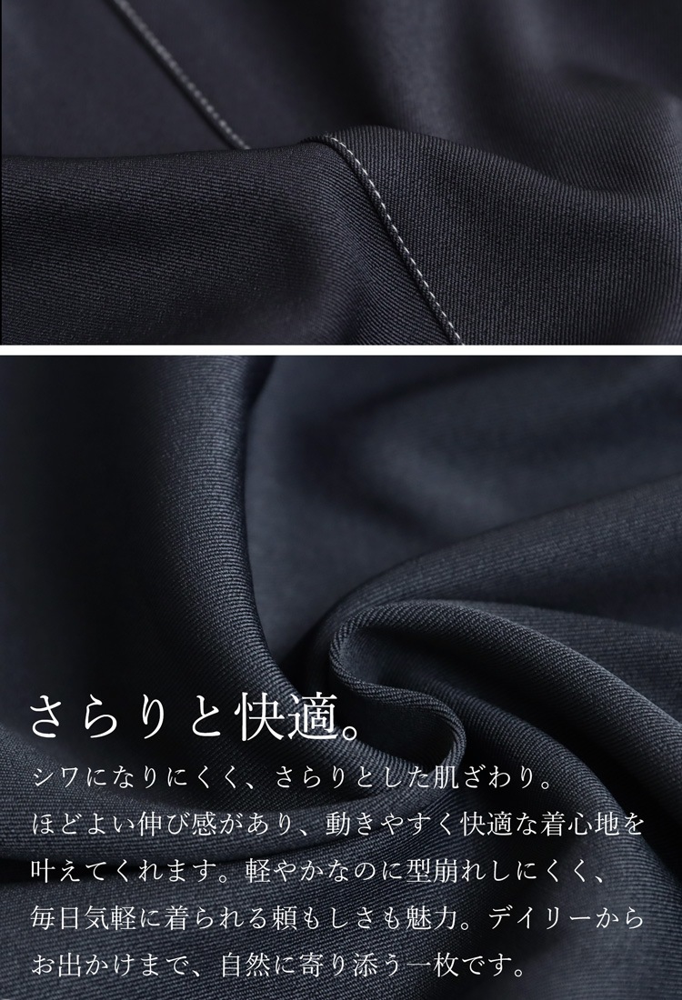 シワになりにくい生地感と、ほどよく伸びるストレッチ性が、忙しい毎日にも嬉しいポイント。