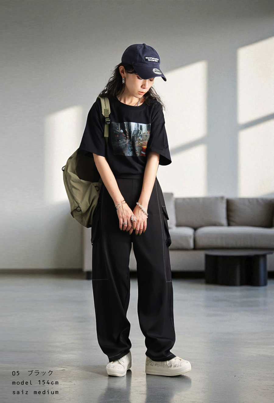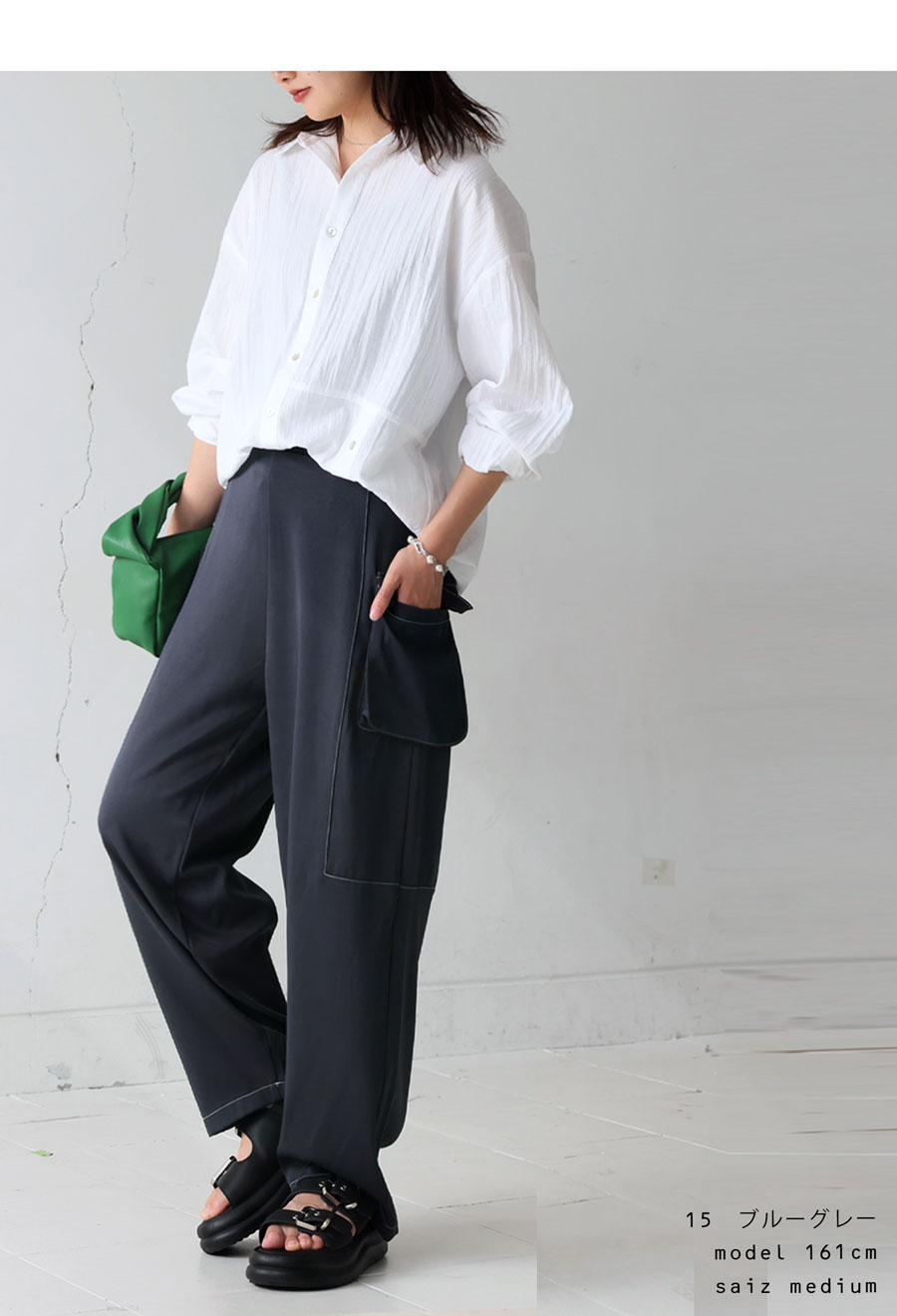 足元はスニーカーでもサンダルでも合わせやすく、季節問わずロングシーズン着用可能です。
