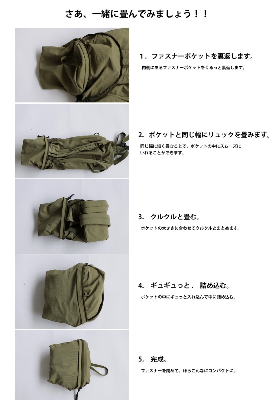 リュックを使わないときにはコンパクトに収納でき、バッグの中に入れておくのもラクラク。