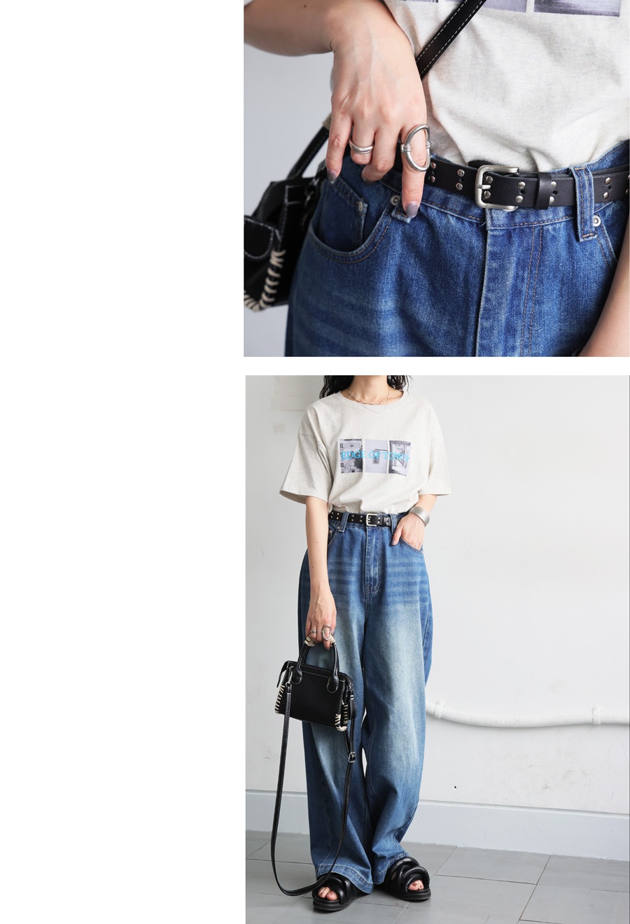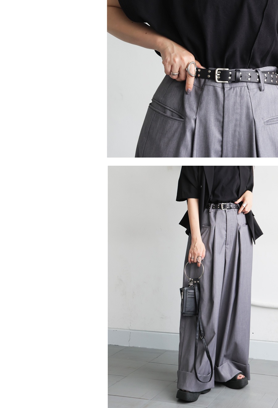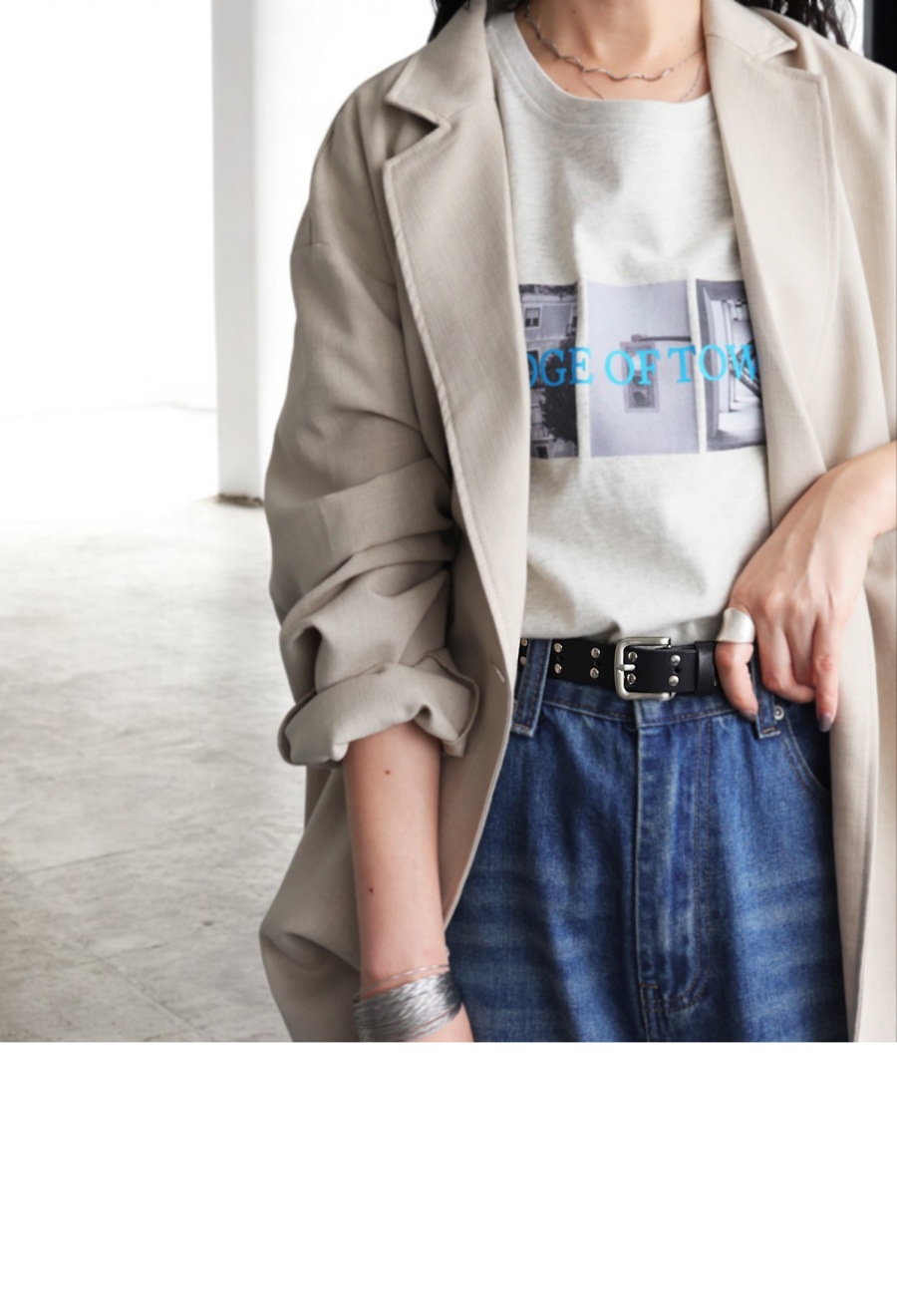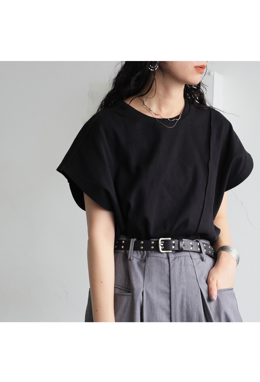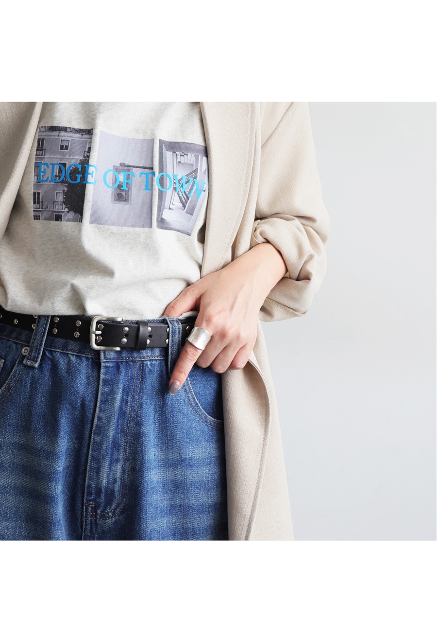 シンプルなコーデのアクセントとしてもおすすめのスタッズベルト。