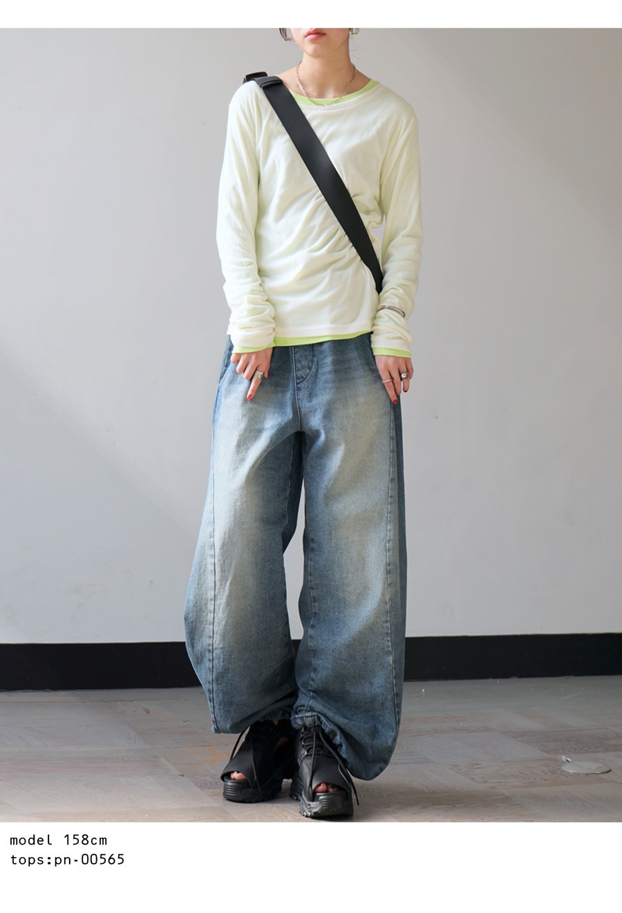 丸みを描くカーブラインとふっくらとしたバルーンシルエット(バレルレッグ)が魅力で、自然に体型カバーを叶えます。