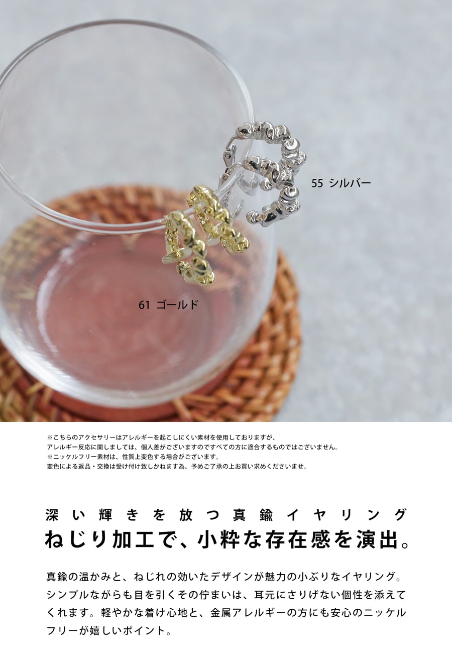 カラーは、落ち着いた艶感のあるシルバー(銀・ぎん・Silver)と、肌なじみの良いゴールド(金色・きん・Gold)の2色をご用意。