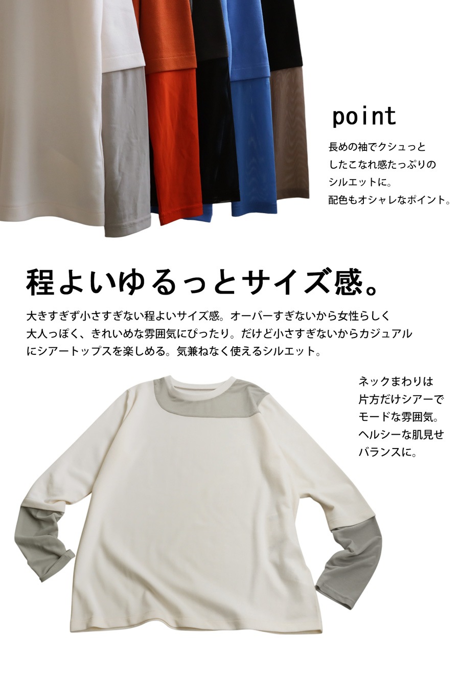 肩まわりや袖の一部に透け感のあるシアー切り替えを取り入れ、さりげない抜け感を演出。