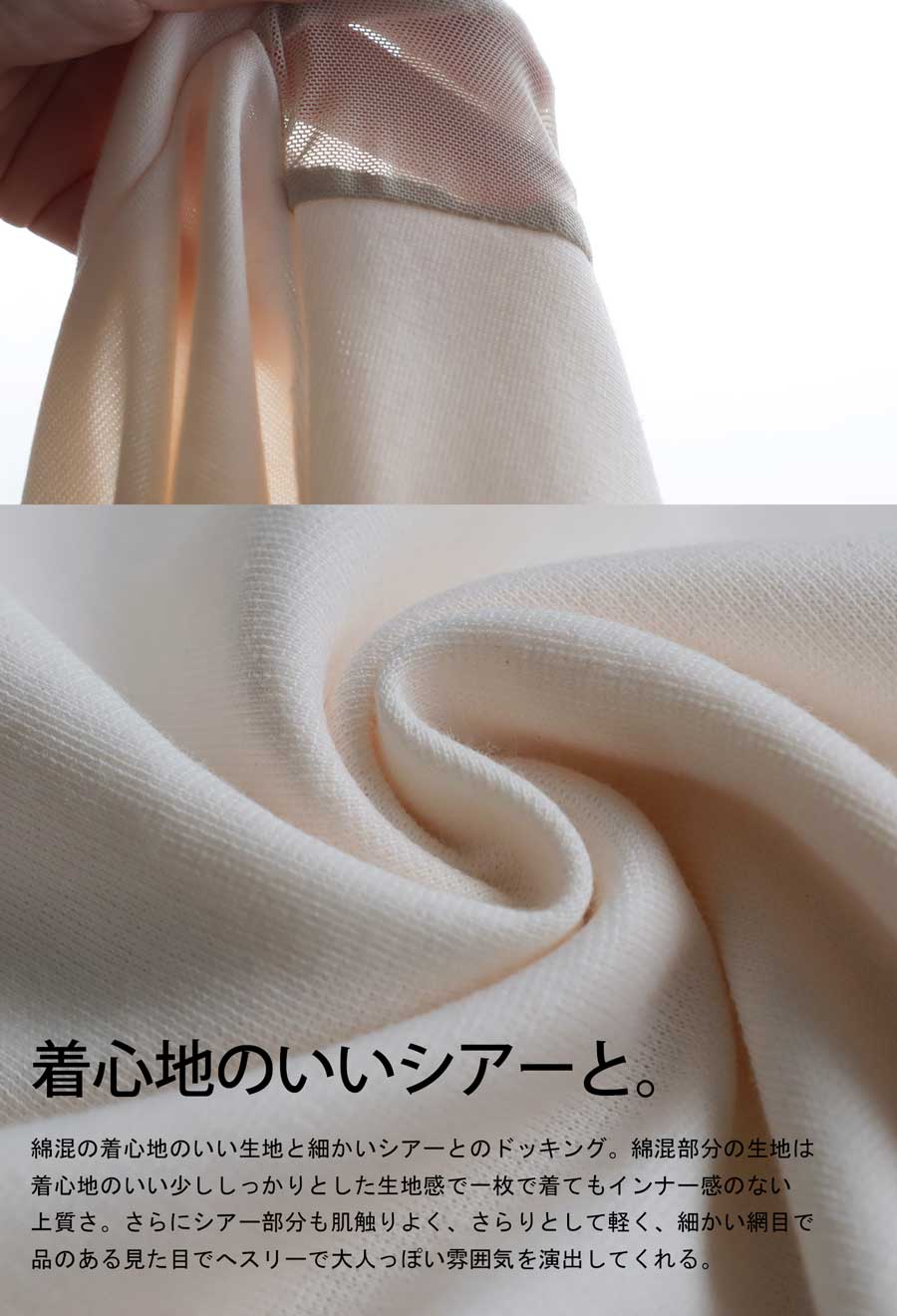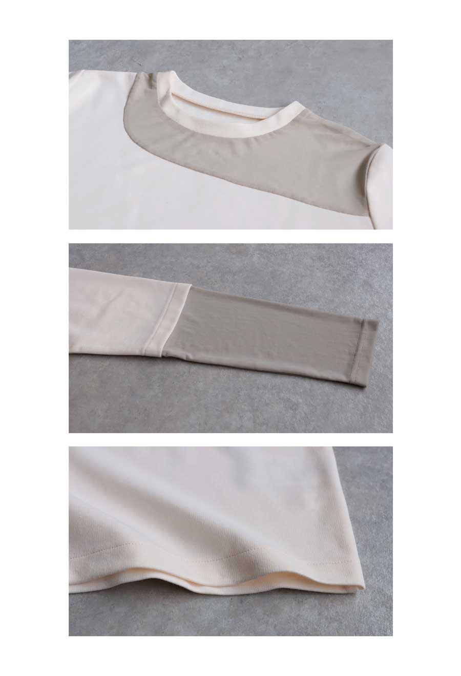素材は肌ざわりの良いカットソー素材をベースに、シアー部分も柔らかくストレスフリーな着用感。