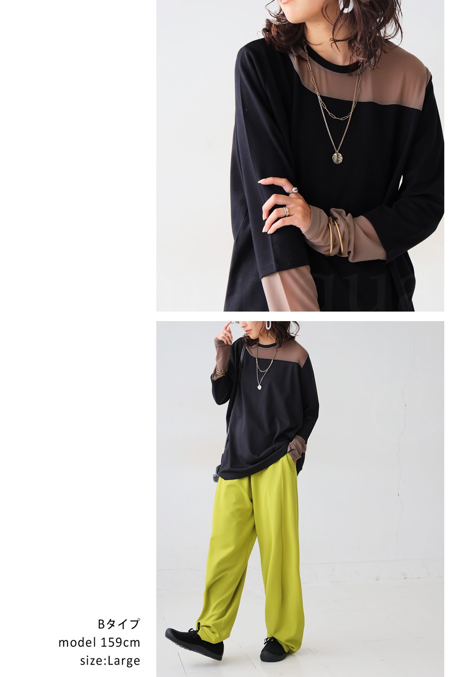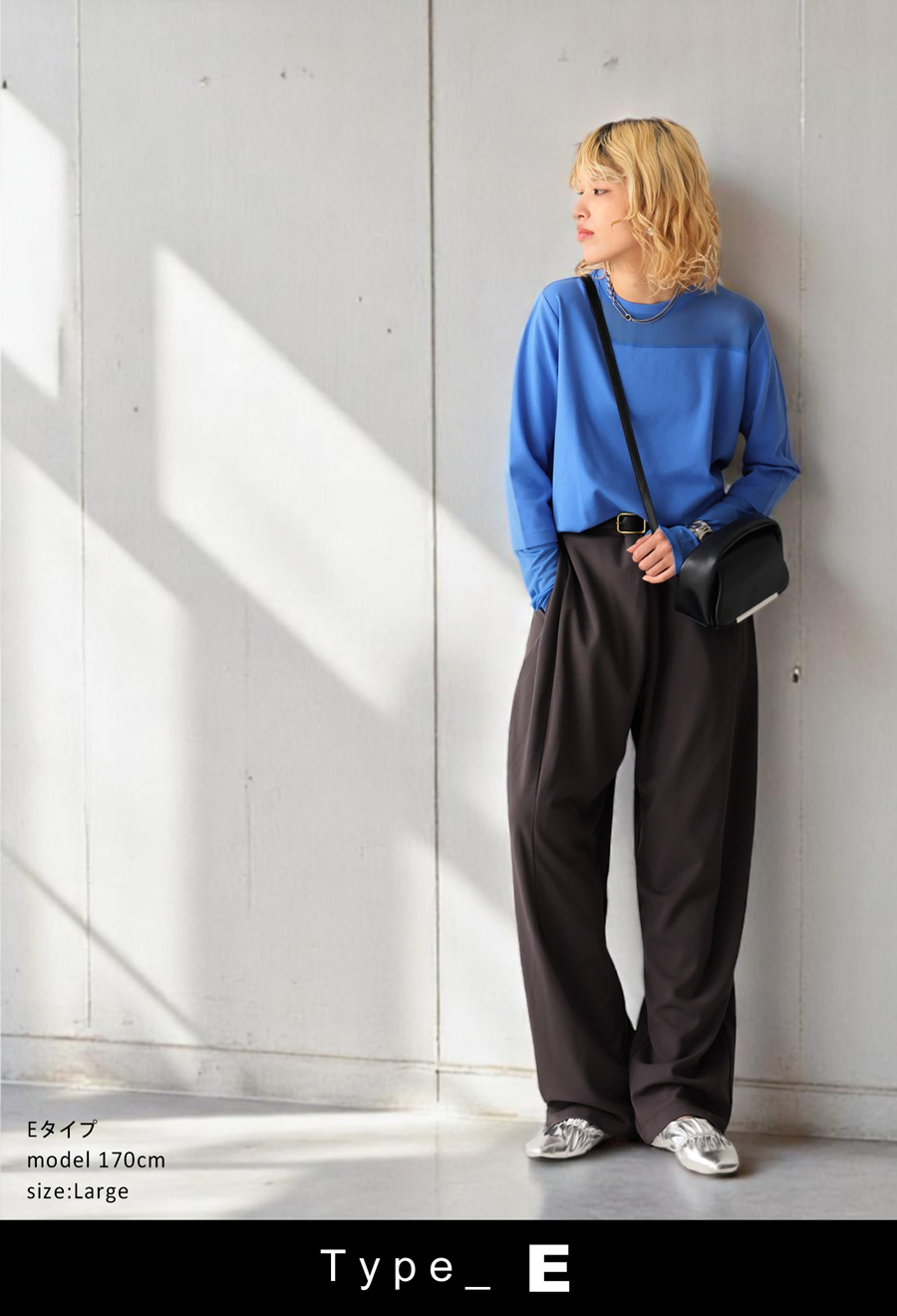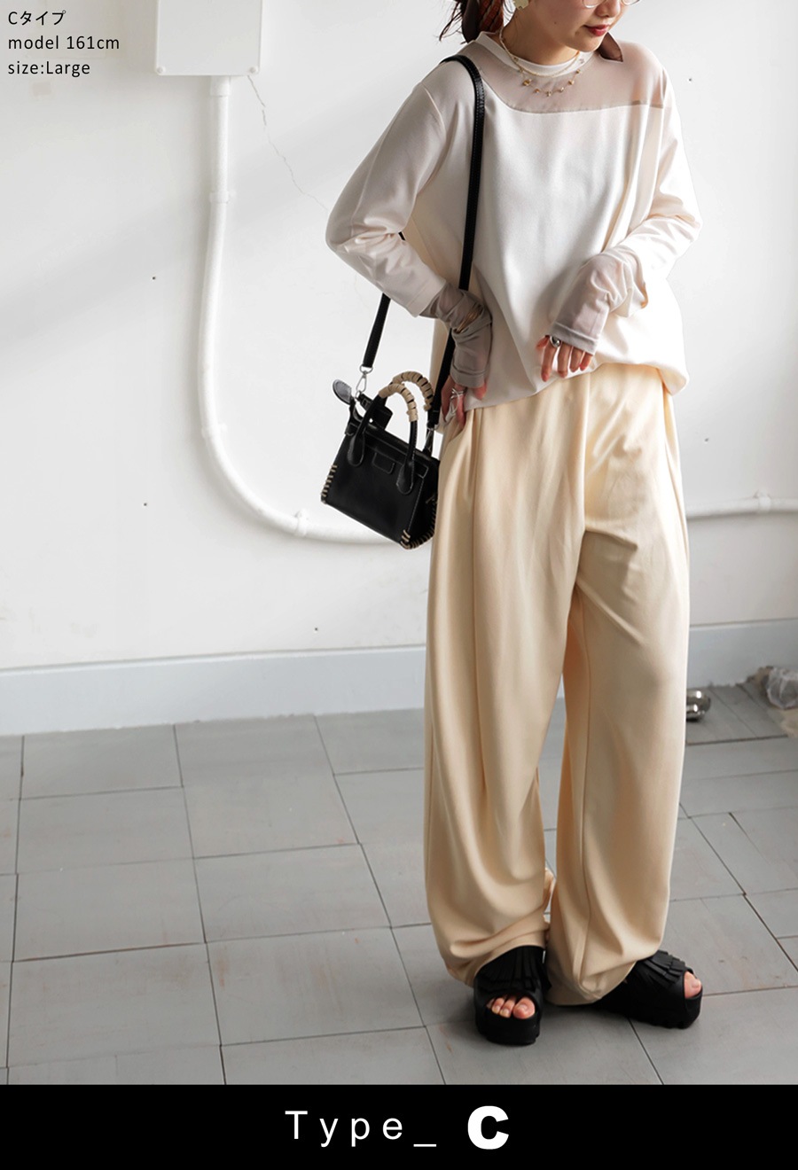 レイヤード風の絶妙な透け感トップスに、脚のラインを美しく魅せるルーズパンツを組み合わせた、今っぽさ満載の上下セットが新登場。