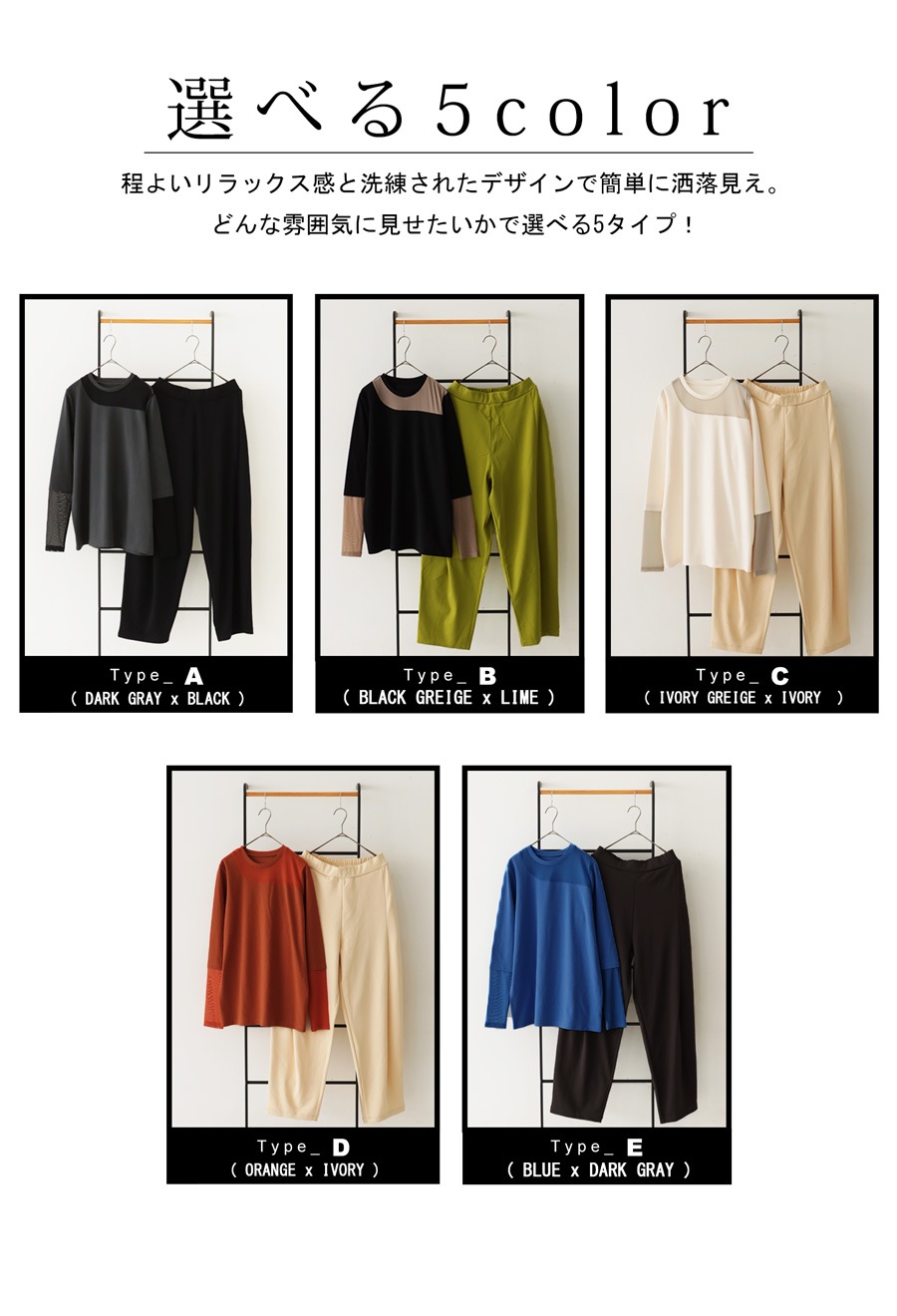 さらに、カラーは雰囲気の異なる全5色展開(A:ダークグレー×ブラック/B:ブラックグレージュ×ライム/C:アイボリーグレージュ×アイボリー/D:オレンジ×アイボリー/E:ブルー×ダークグレー)からお選びいただけます。
