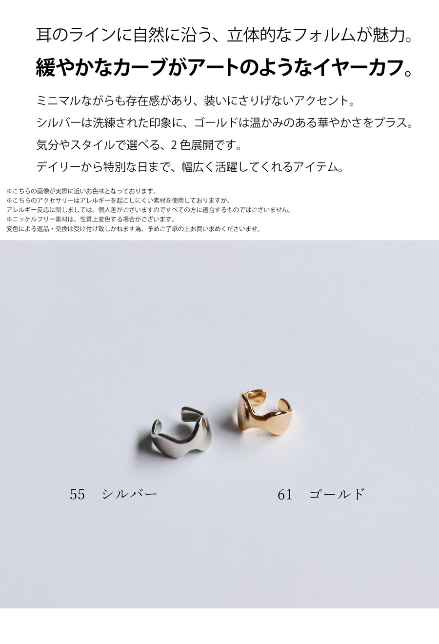耳のラインにやさしく沿う、美しい立体カーブが目を引くイヤーカフが登場しました。