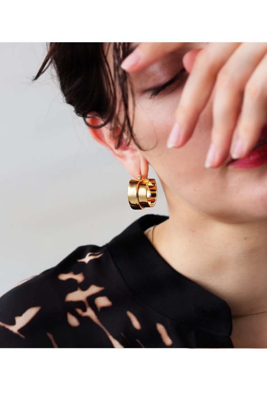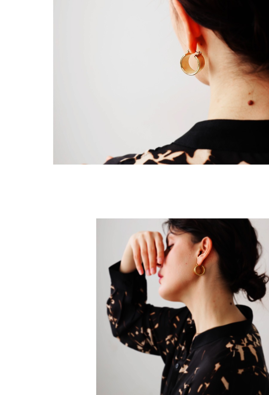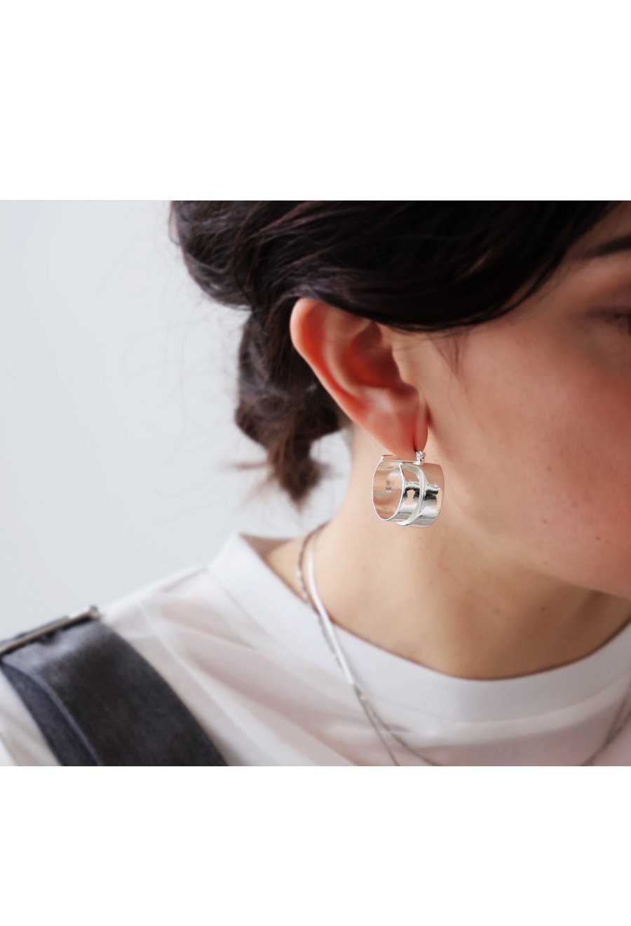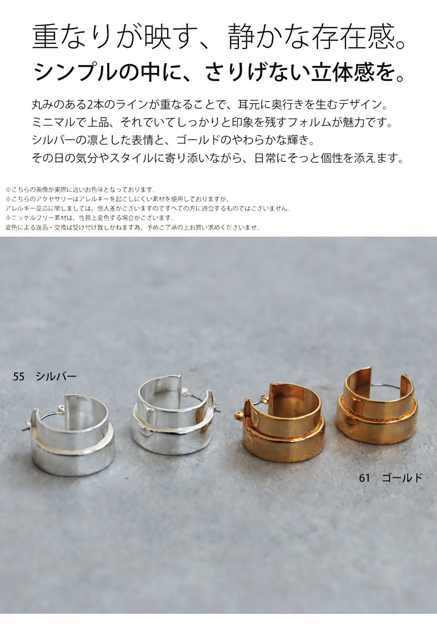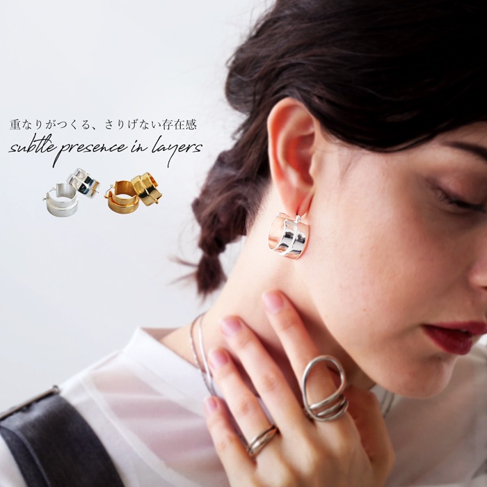 重なり合う2本のラインが生む立体感が、耳元に静かな存在感を与えるデザインピアスです。