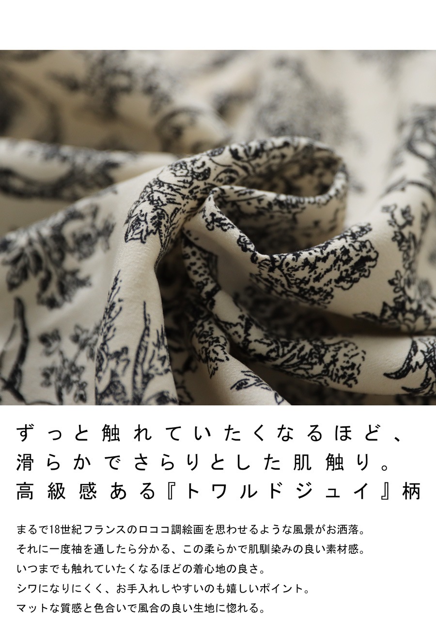 まるで絵画のような美しい柄が目を惹く、トワルドジュイ柄のロングワンピース。