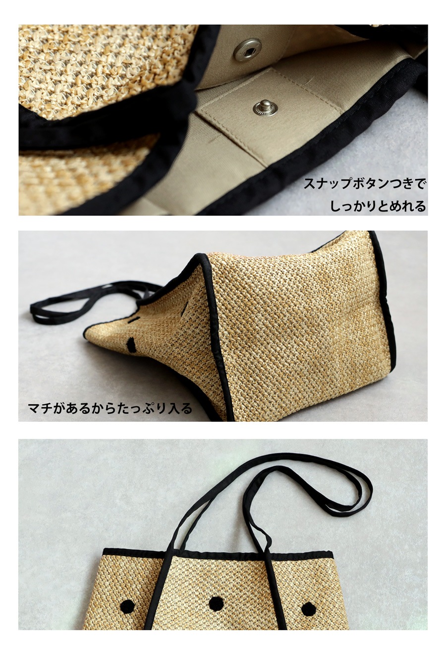 肩掛けしやすい長めの持ち手や、内ポケット・スナップボタン付きの開口部など、使いやすさにもこだわりました。