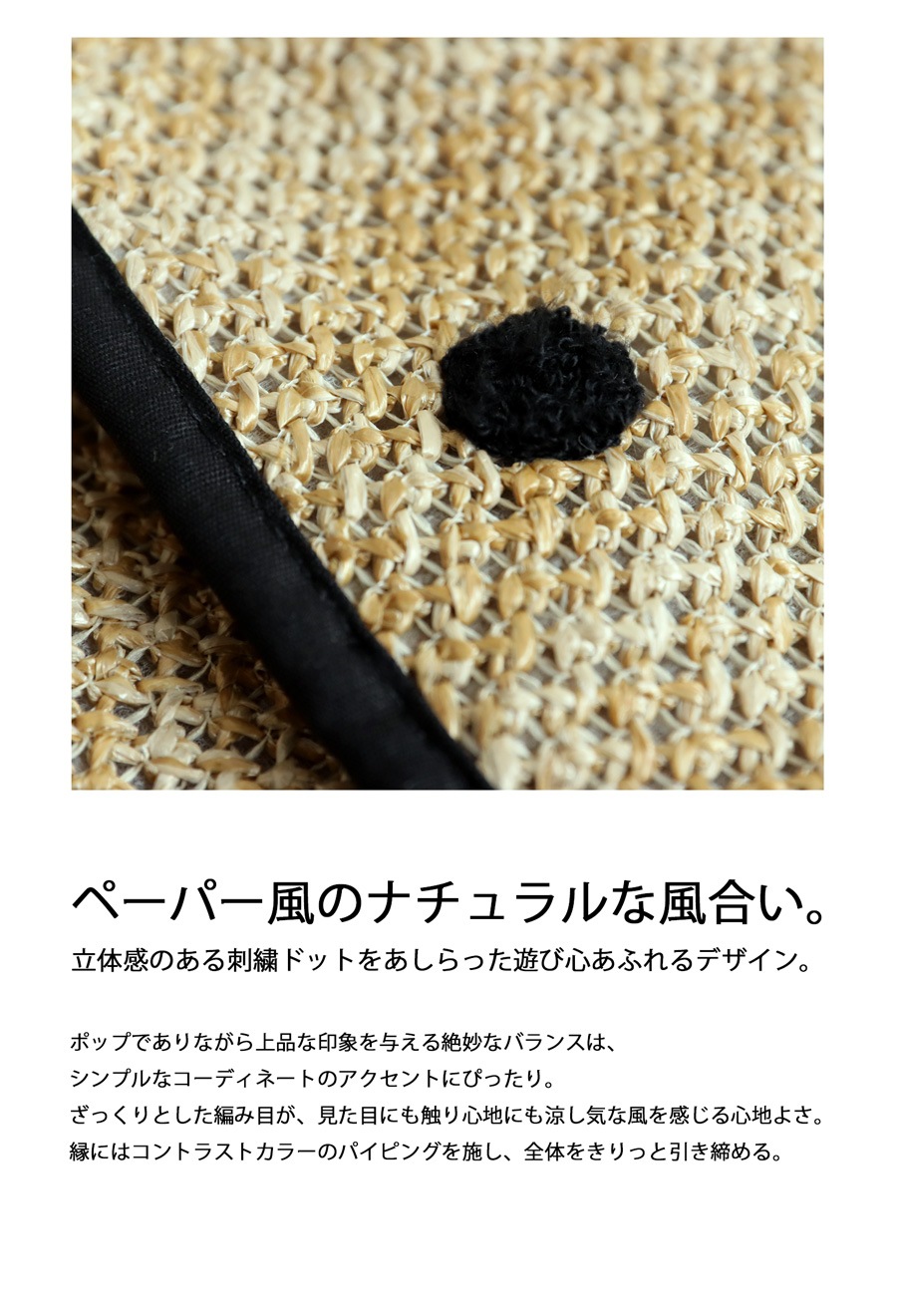 ナチュラルなペーパー風素材に、立体感のある刺繍ドットを施したデザインは、視線を引き付けながらもどこか品の良さを感じさせる絶妙なバランス。