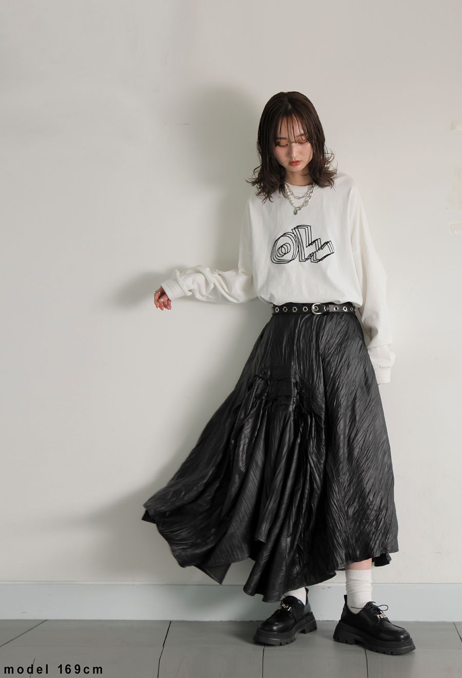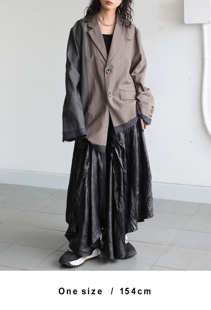 モードな雰囲気を纏いつつも、無地で落ち着いた印象にまとまっているため、幅広いスタイリングに対応可能。