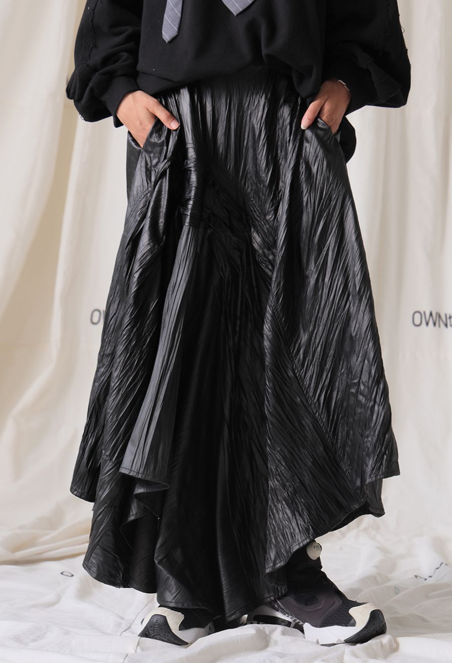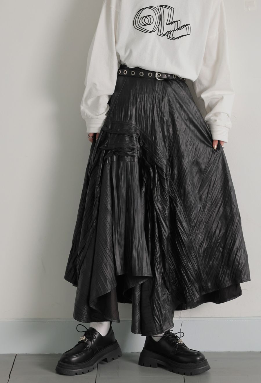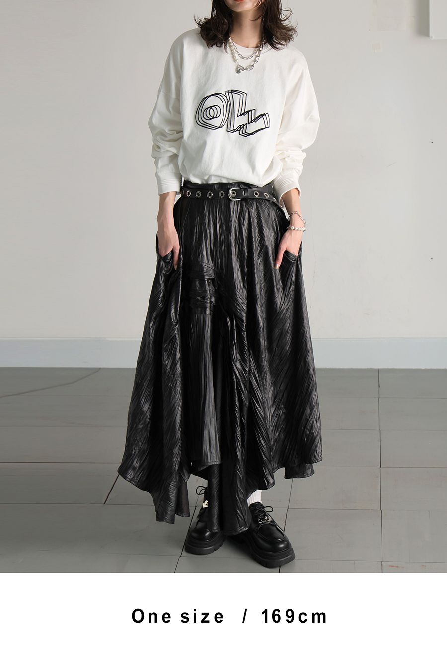 高級感と個性をあわせ持つ、印象的なアシメタックデザインのロングスカートです。