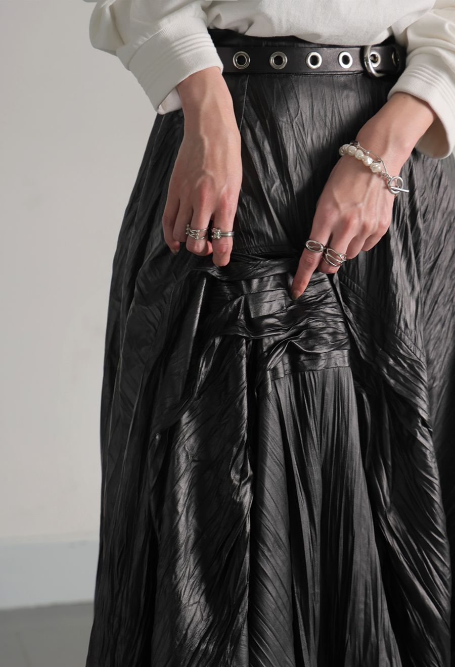 ロング丈で落ち感のあるフレアシルエットが、動きに合わせてエレガントな揺れを演出します。