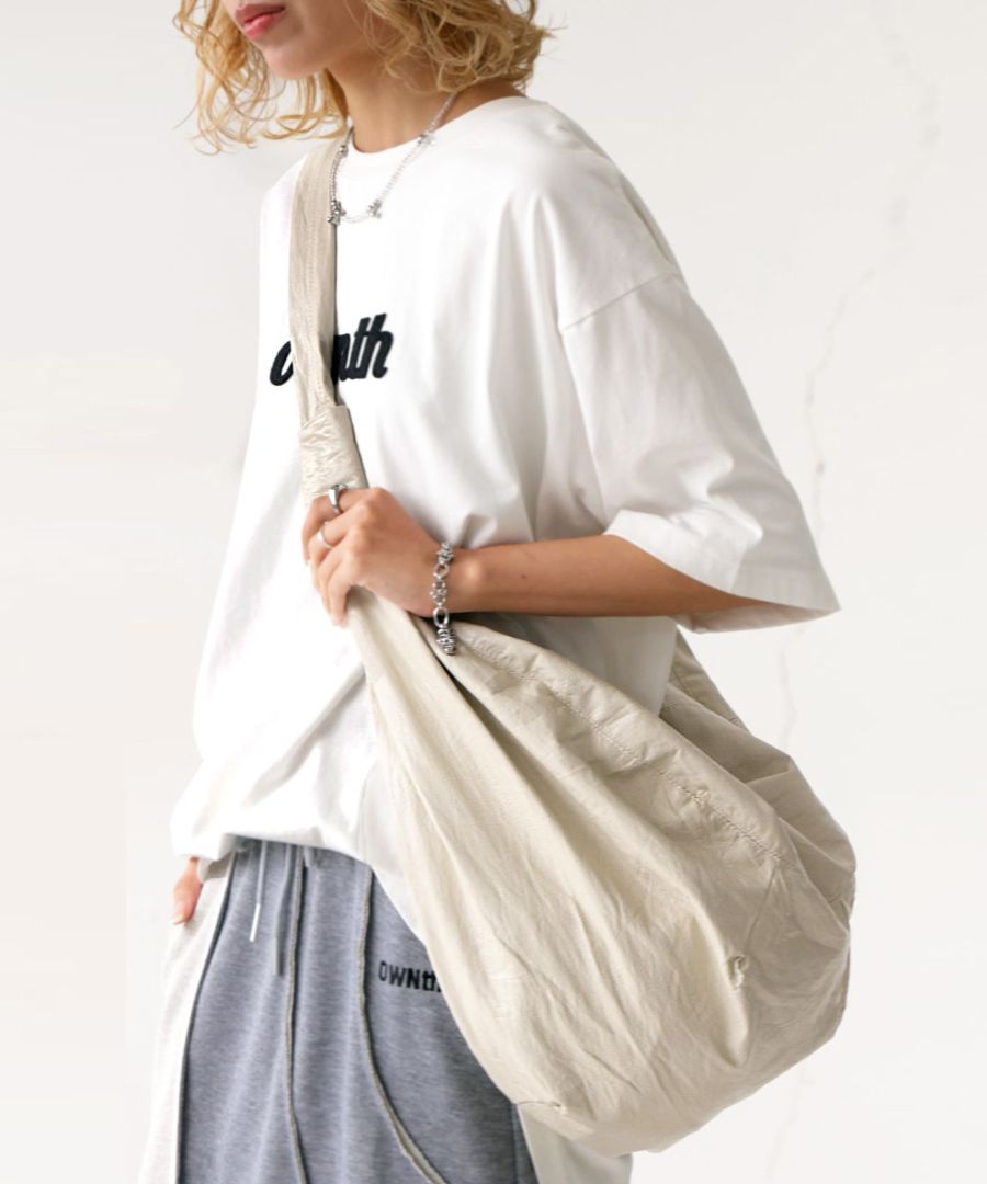 丸みを帯びたフォルムがやさしい印象を与える「フェイクレザーラウンドショルダーバッグ」。