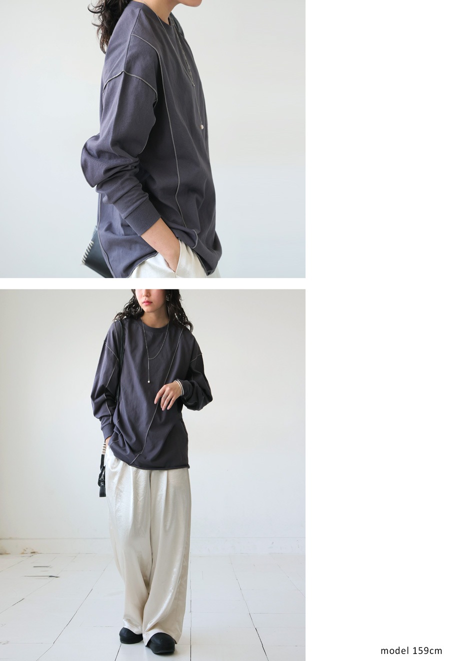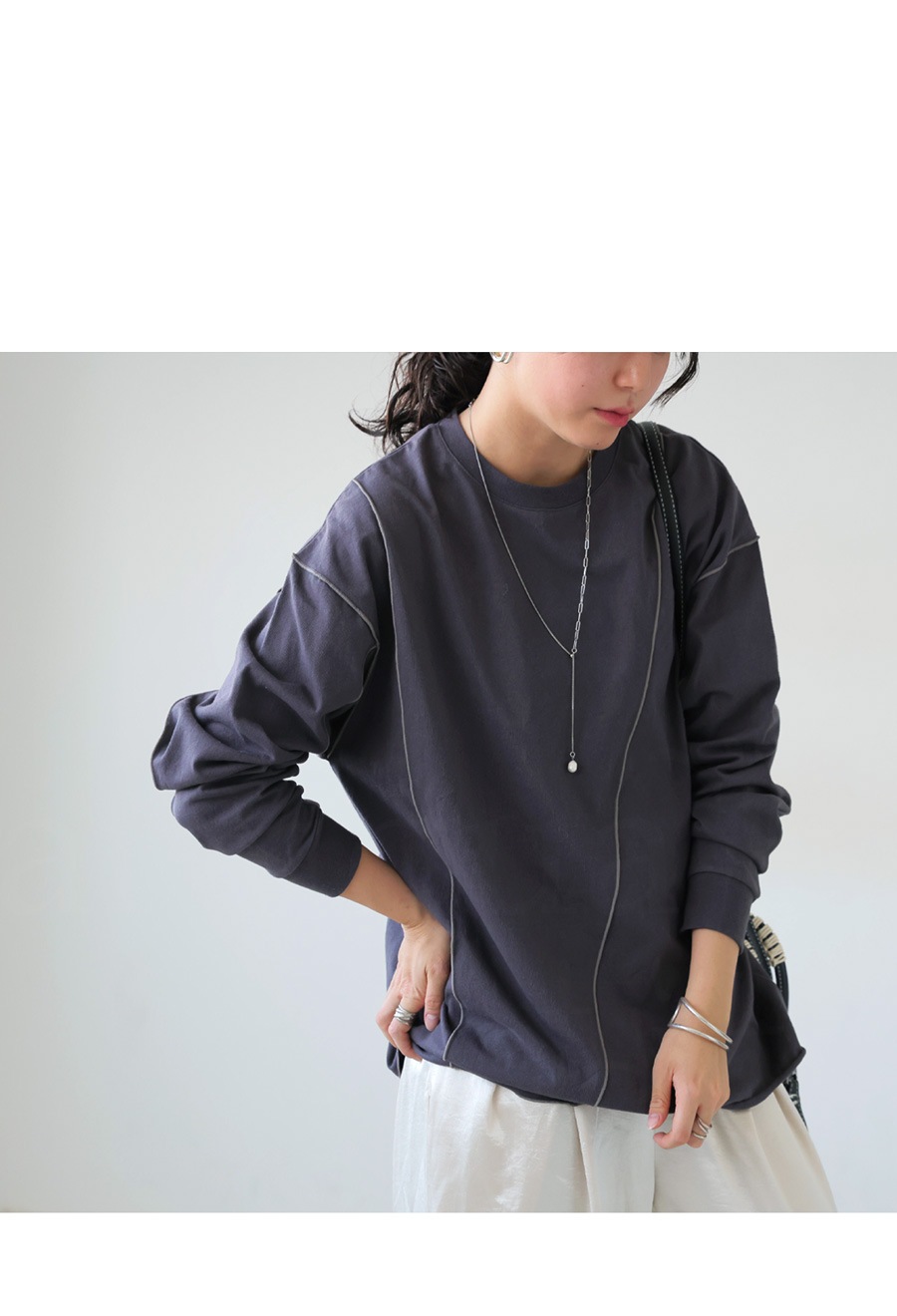 首元はベーシックなクルーネックで、どんなアイテムにも合わせやすく、レイヤードにもぴったり。
