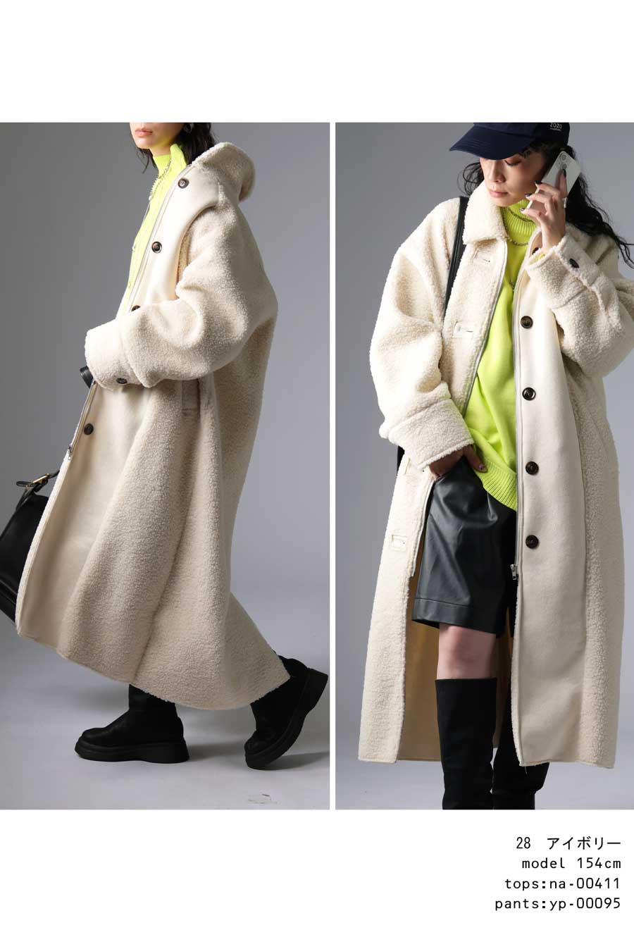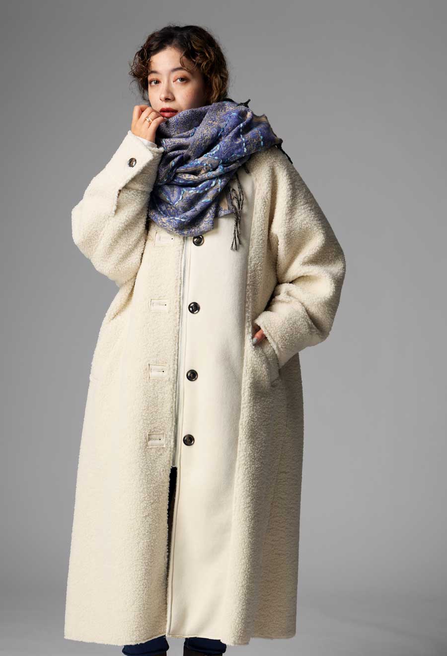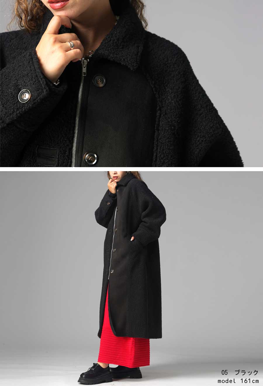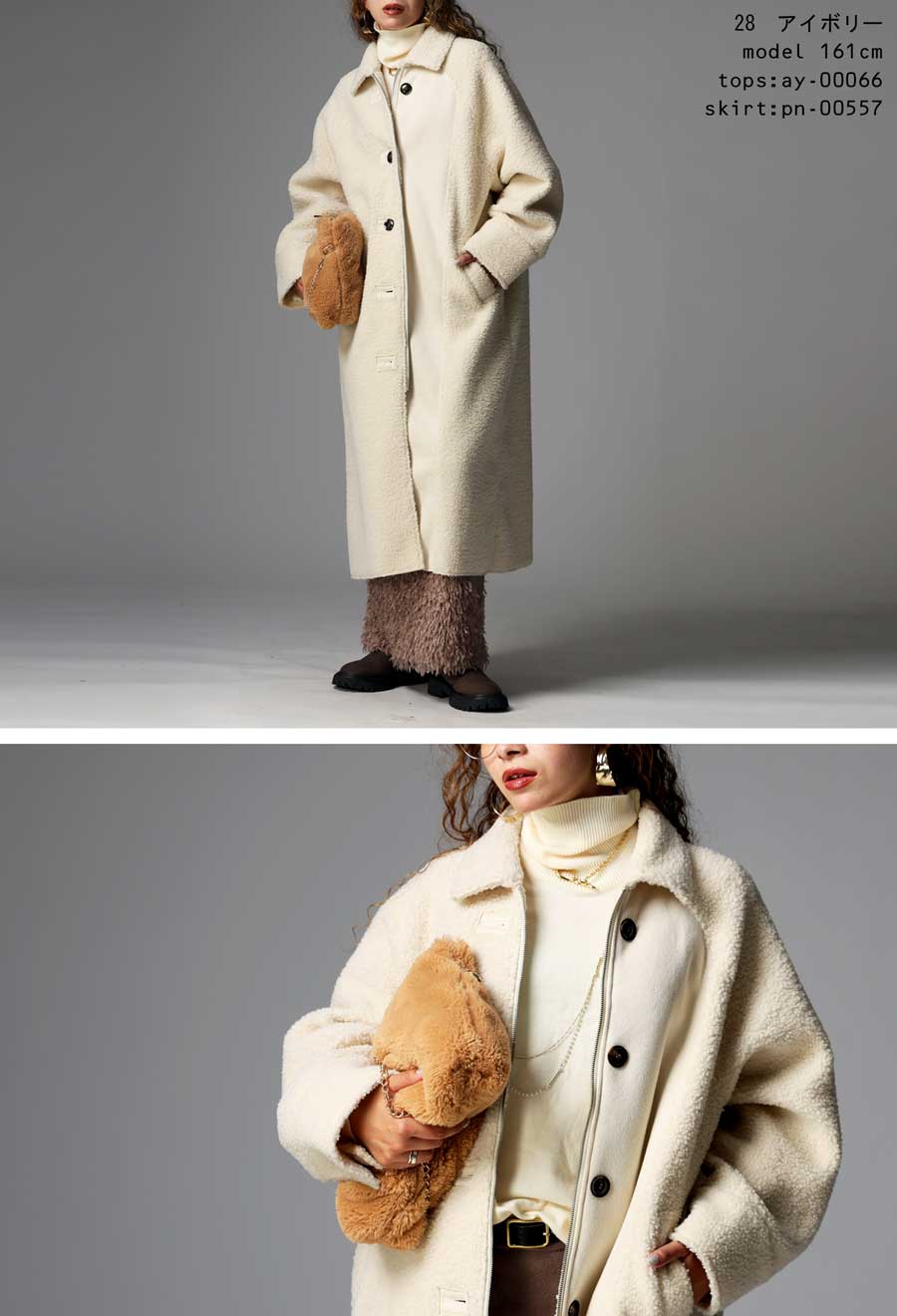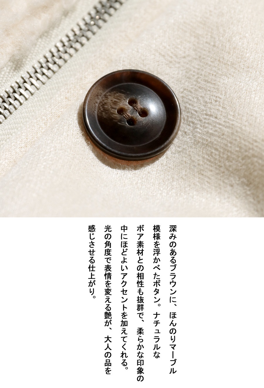 ふんわりとしたボアの表情と、しっとりとしたフェイクムートンの質感を同系色でまとめ、シンプルながらも奥行きのある一着に仕上げています。