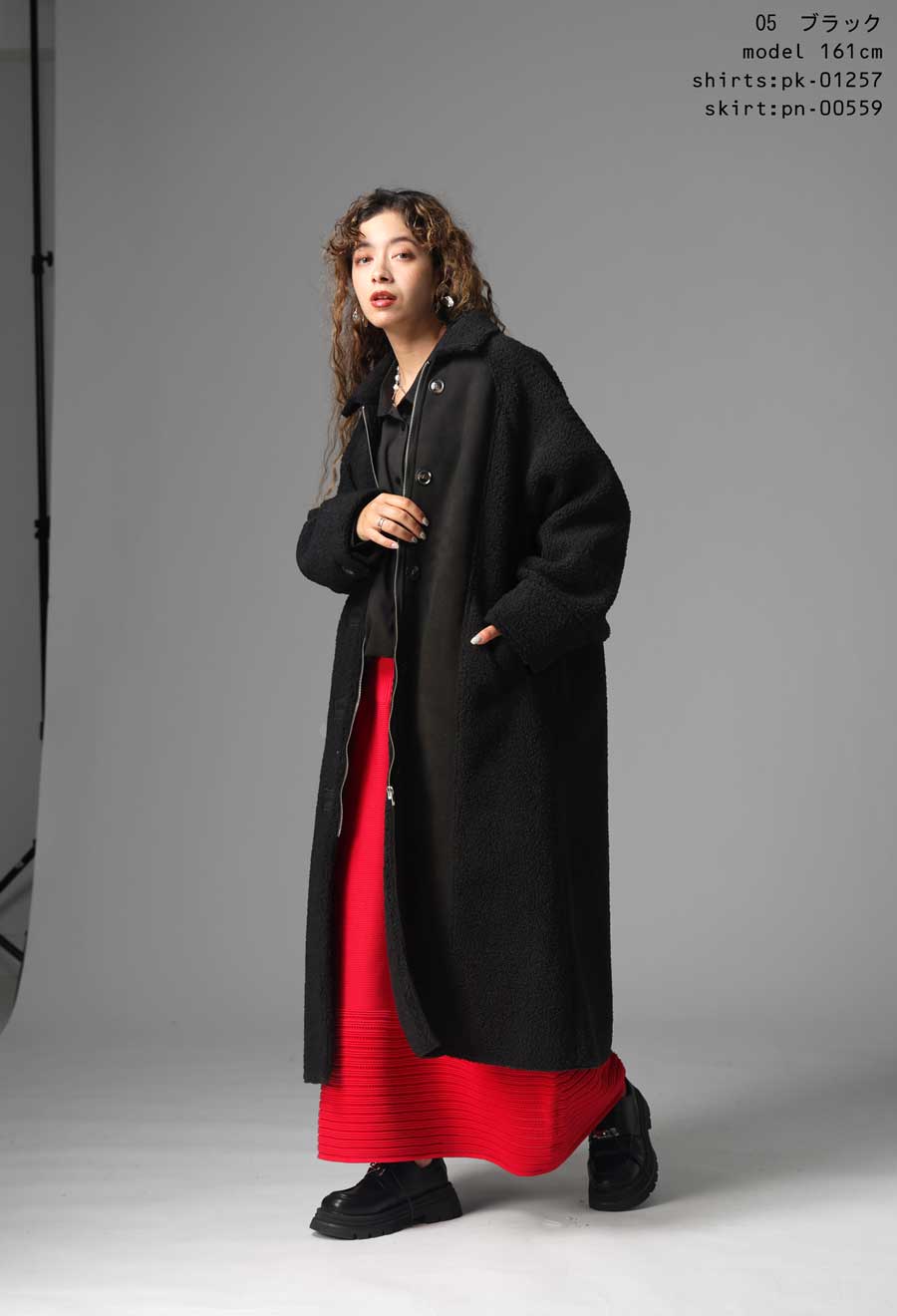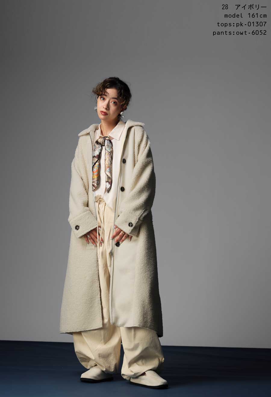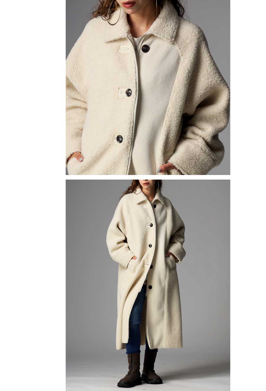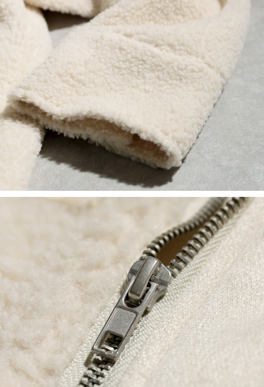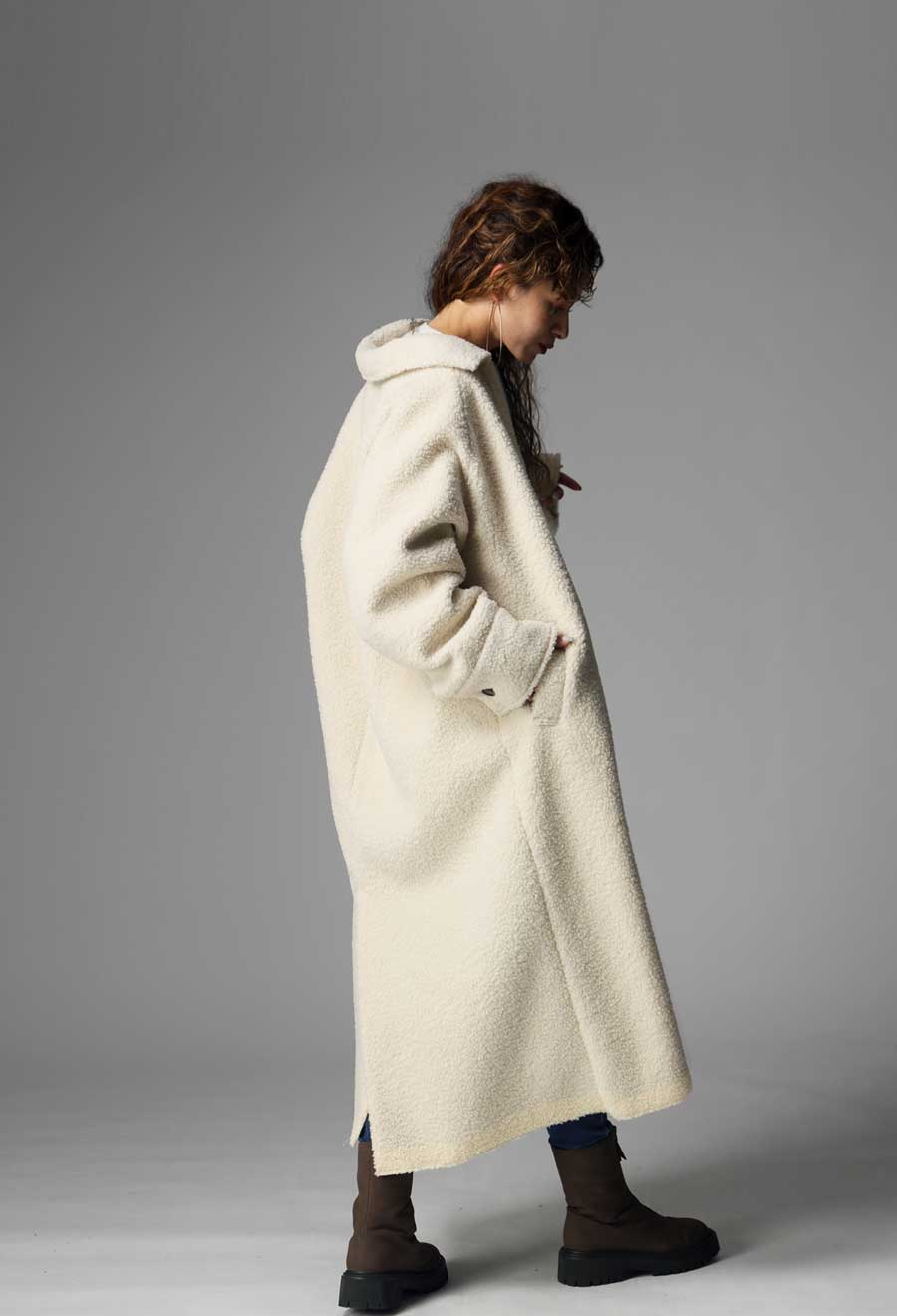 ふんわりとしたボアの表情と、しっとりとしたフェイクムートンの質感を同系色でまとめ、シンプルながらも奥行きのある一着に仕上げています。