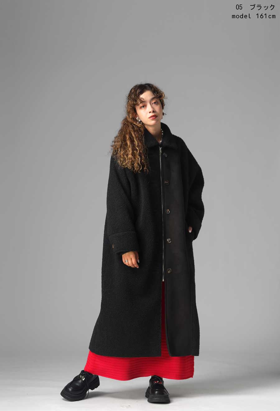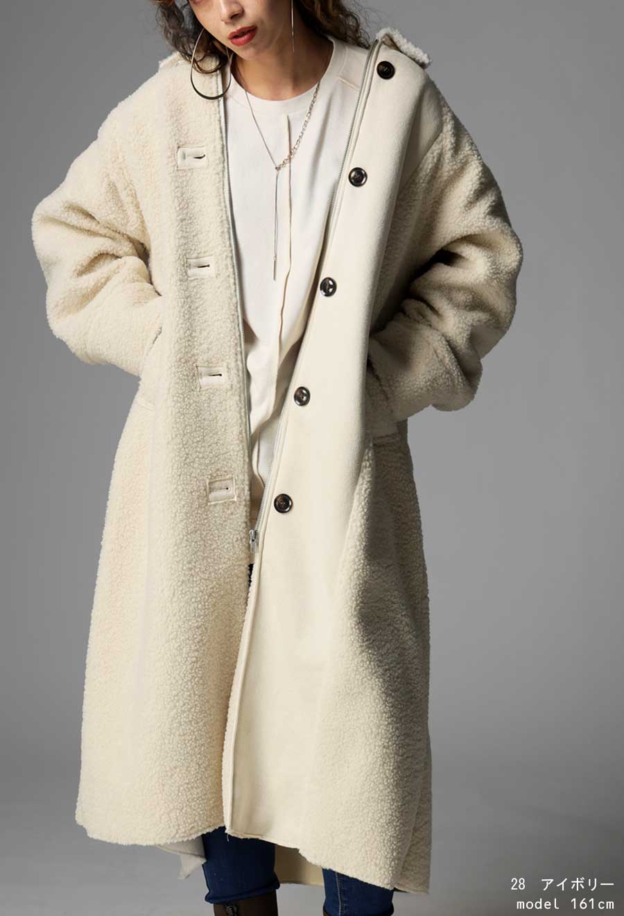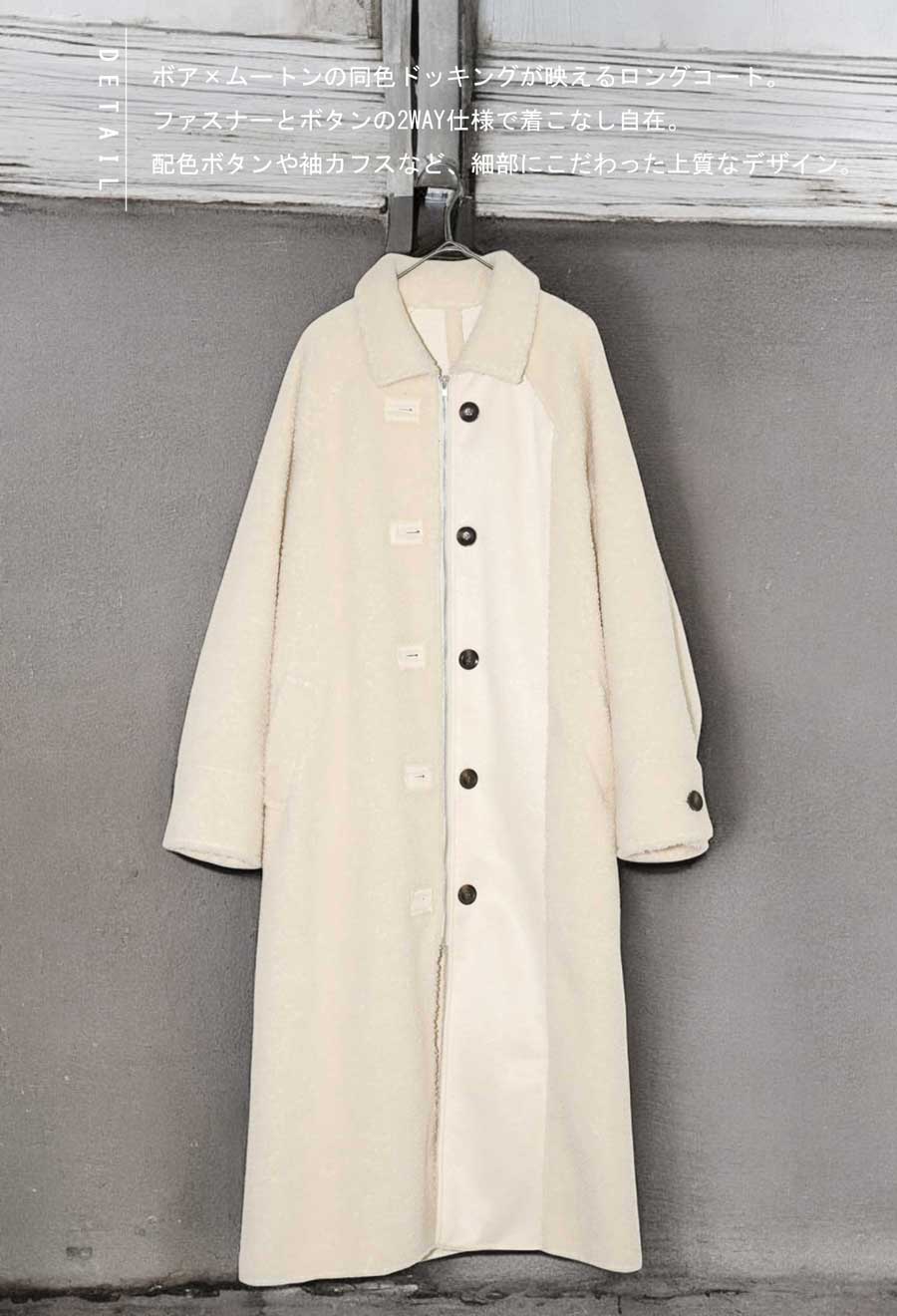 異素材の絶妙なコントラストが目を惹く、ボア×ムートンのドッキングロングコートが登場しました。