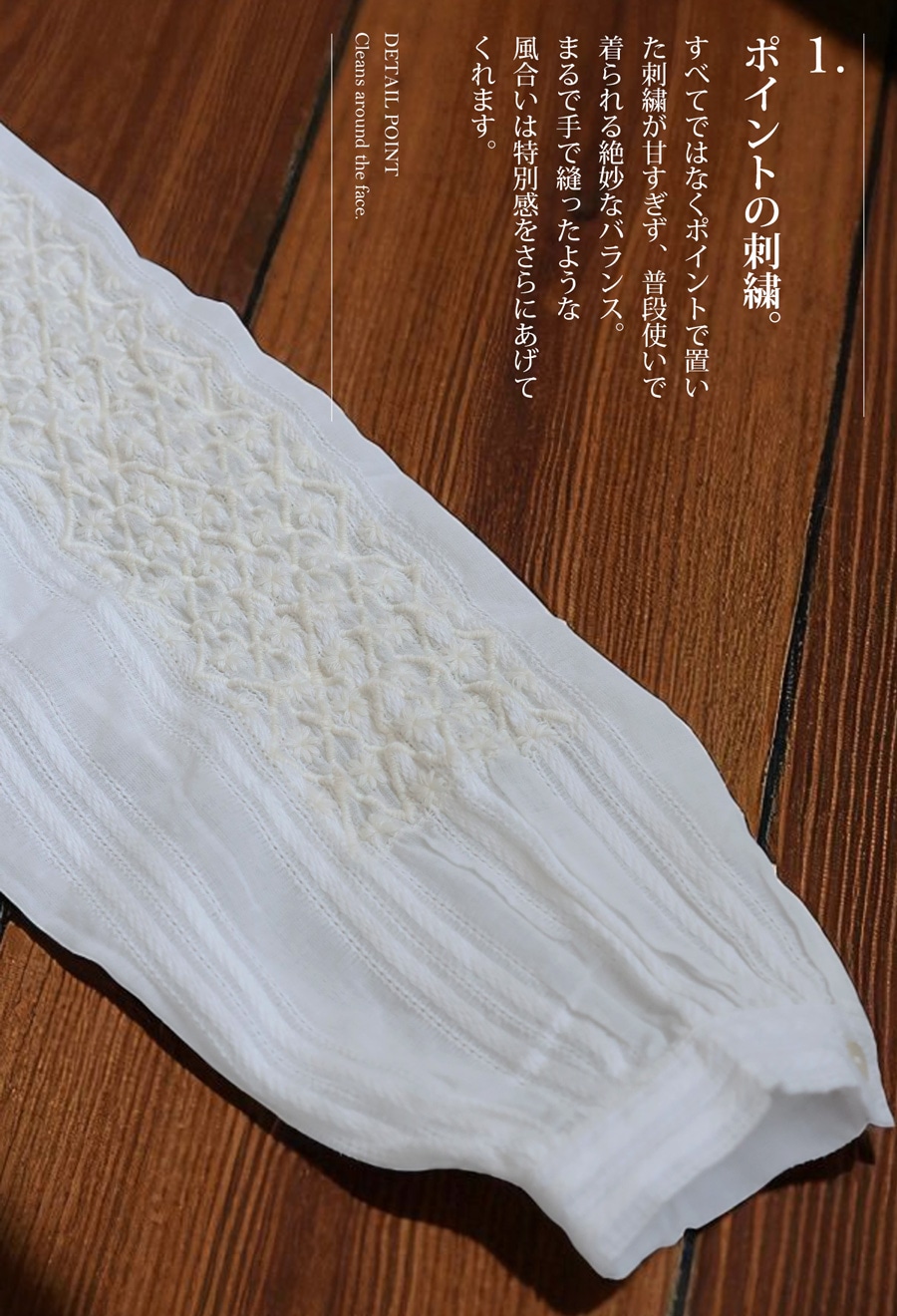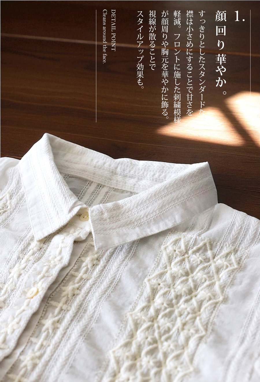 甘さを抑えたレギュラーカラー(シャツ襟)と、顔まわりを華やかに見せる胸元の刺繍で、視線を上に集めるスタイルアップ効果も狙えます。