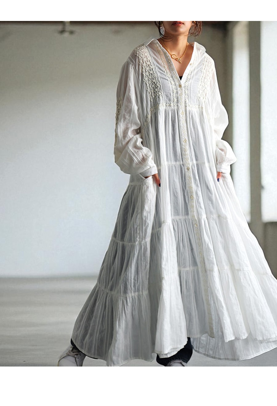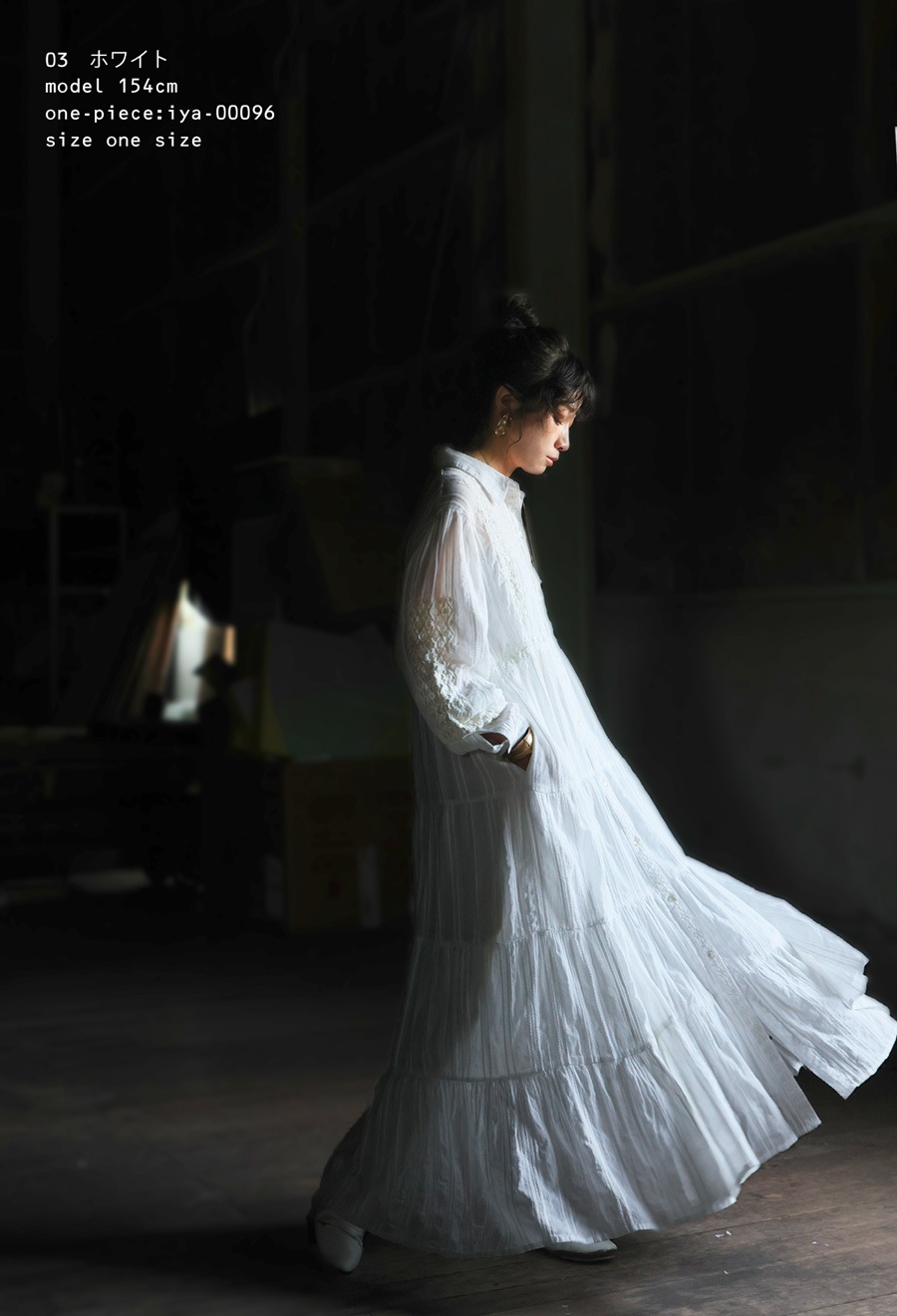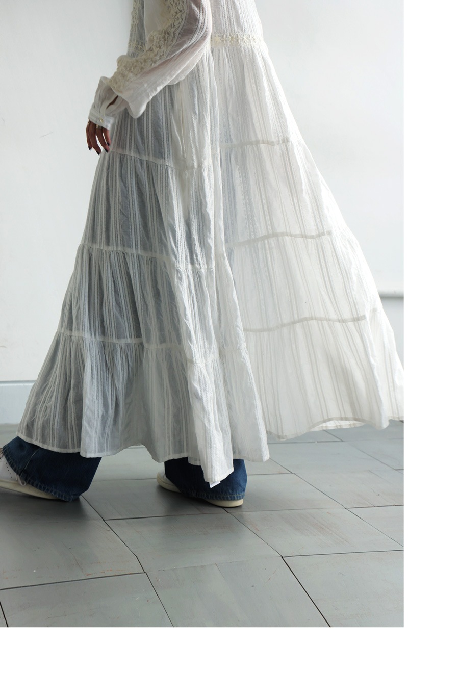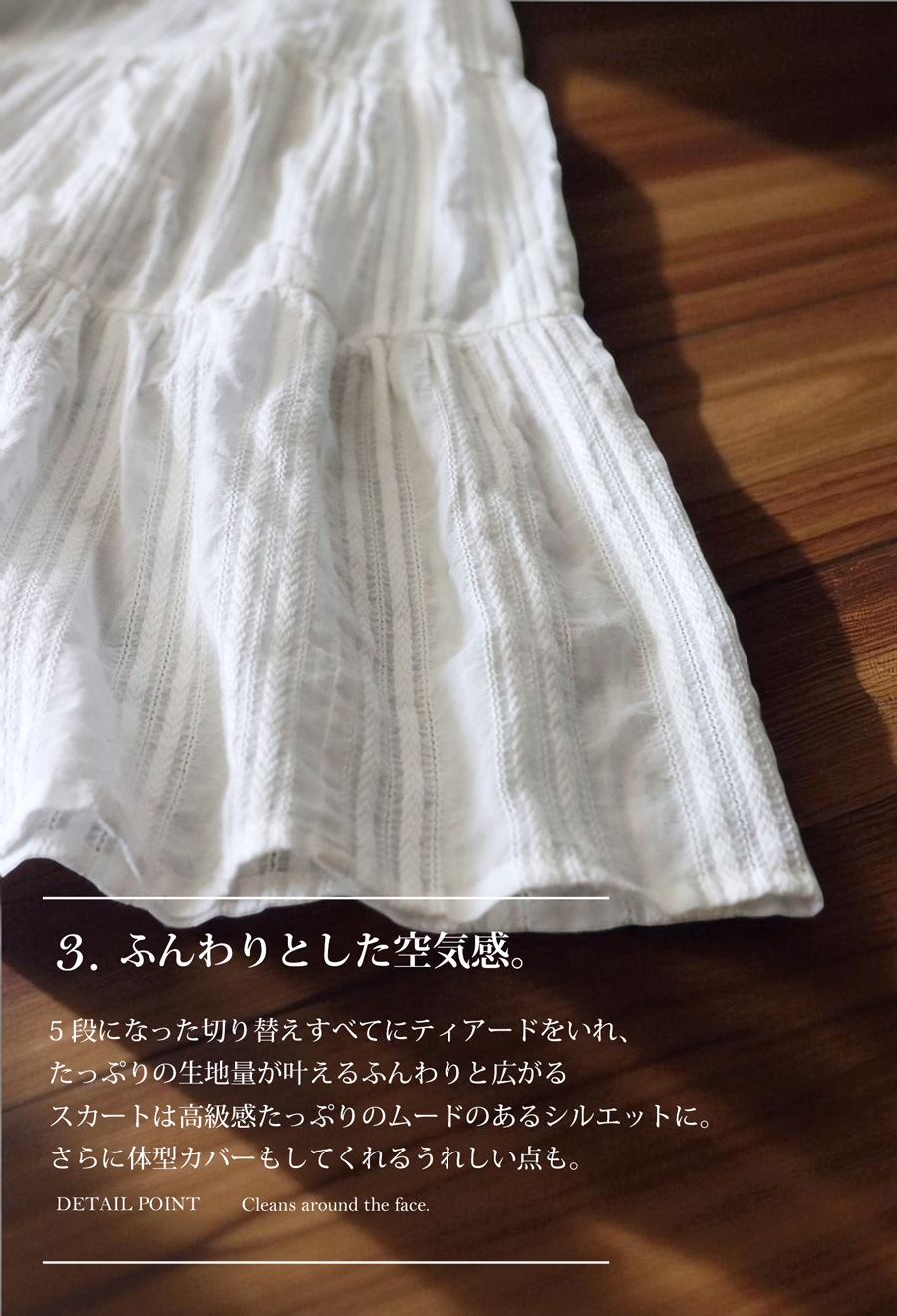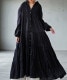 5段ティアードの切り替えとたっぷりの生地量が、動くたびに揺れて空気をはらむようなニュアンスを演出します。