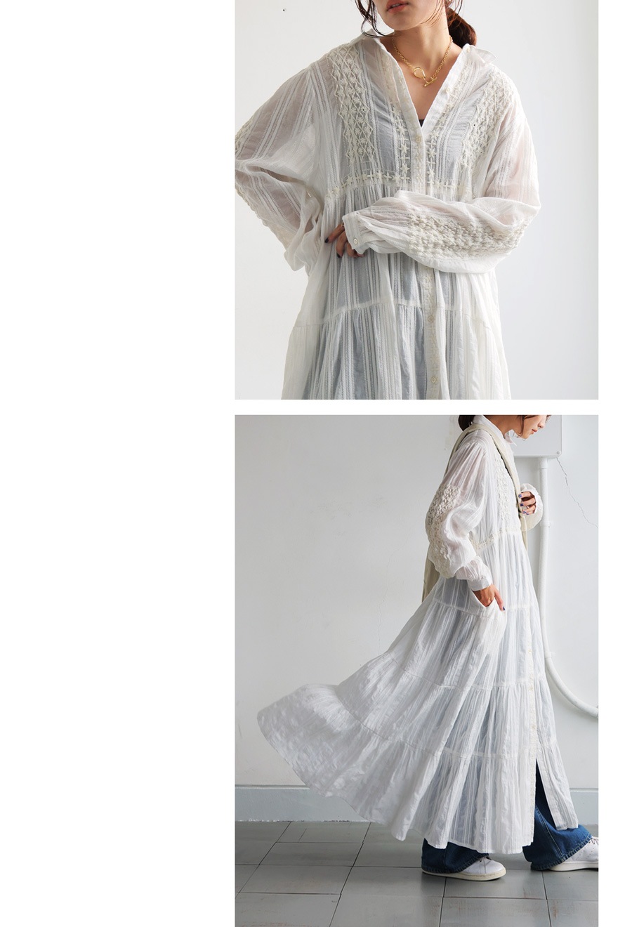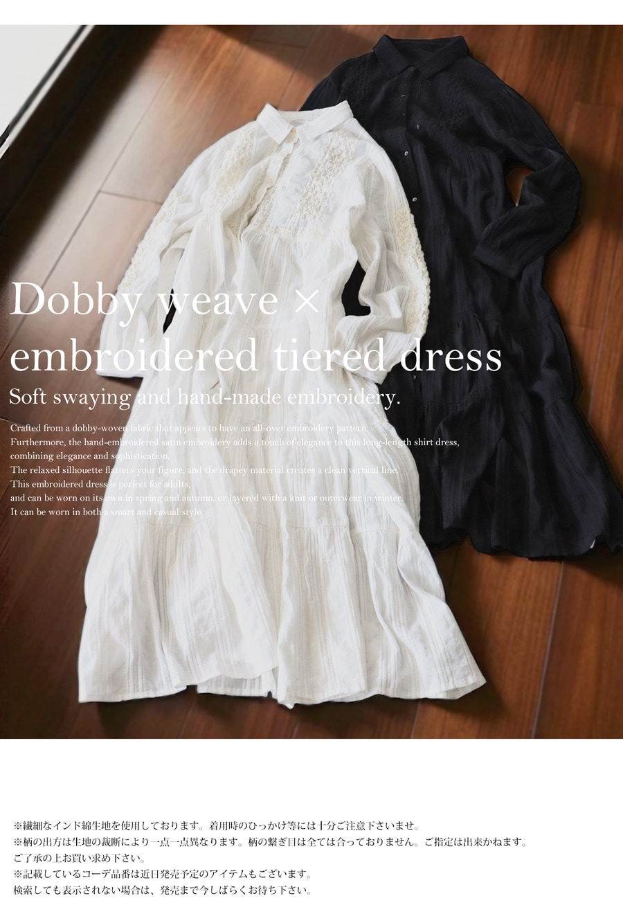 どちらも素材の繊細な凹凸感と刺繍ディテールが際立つ、ニュアンスのある表情に仕上がっています。