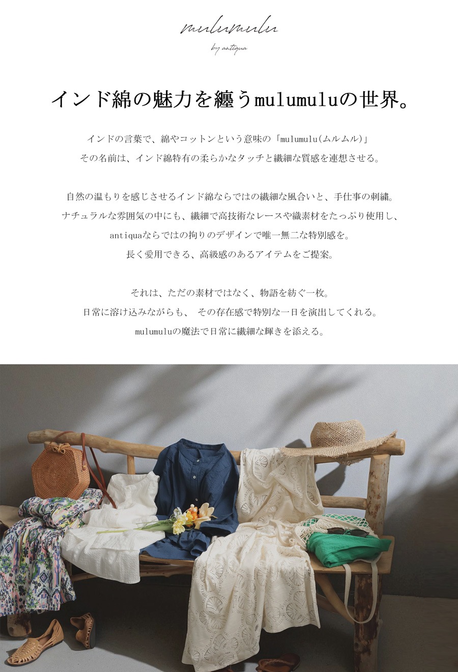 インド綿ならではの繊細な風合い、手仕事の刺繍にフォーカスを当てたantiqua発のブランド『mulumulu(ムルムル)』