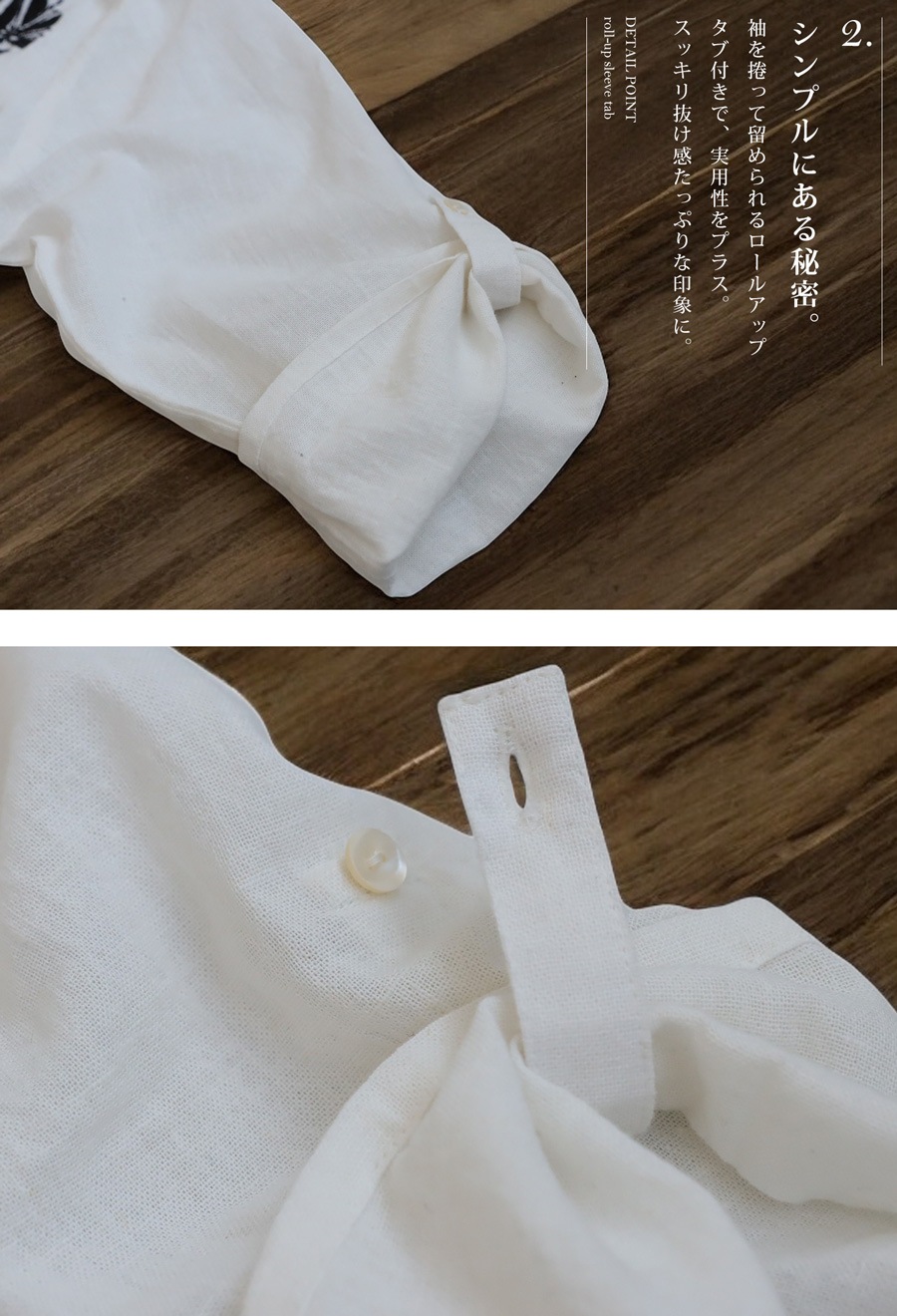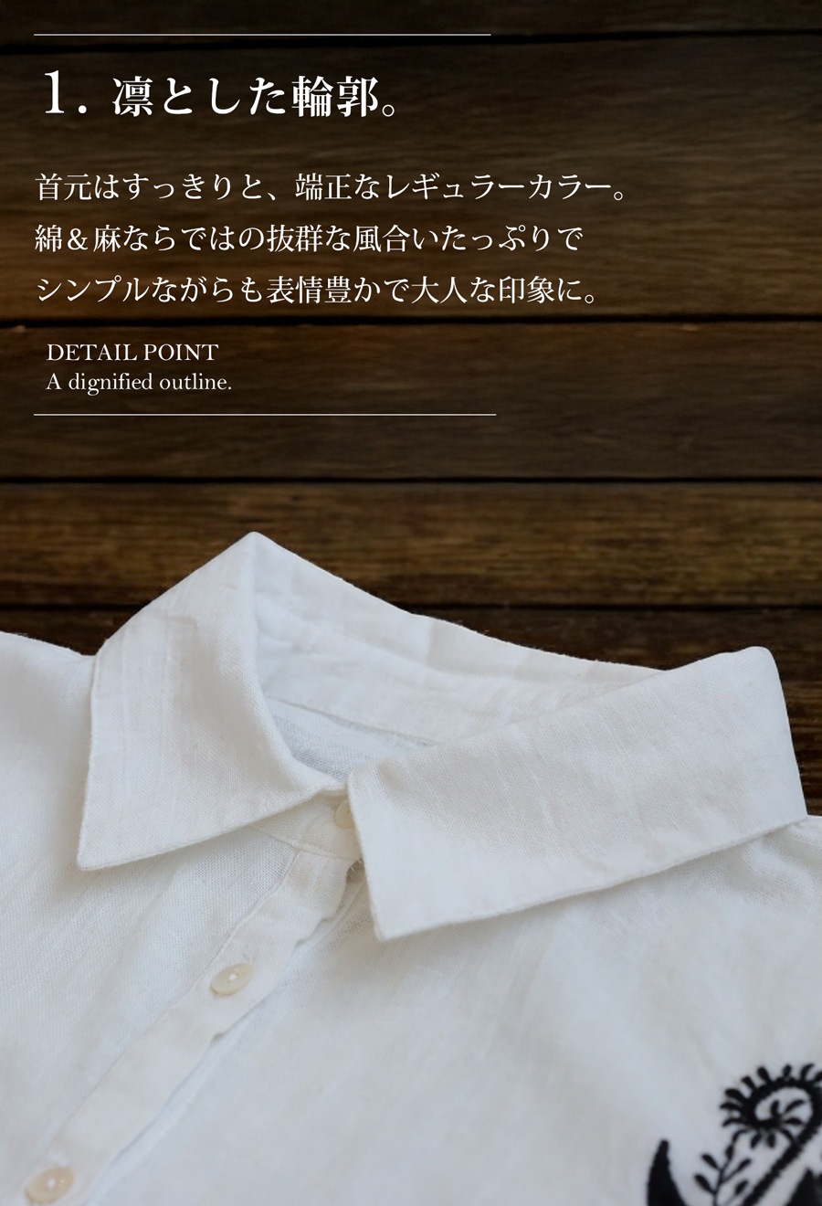 首元はきちんと感のあるレギュラーカラー、袖にはさりげなくタックを施し、立体的なフォルムに。