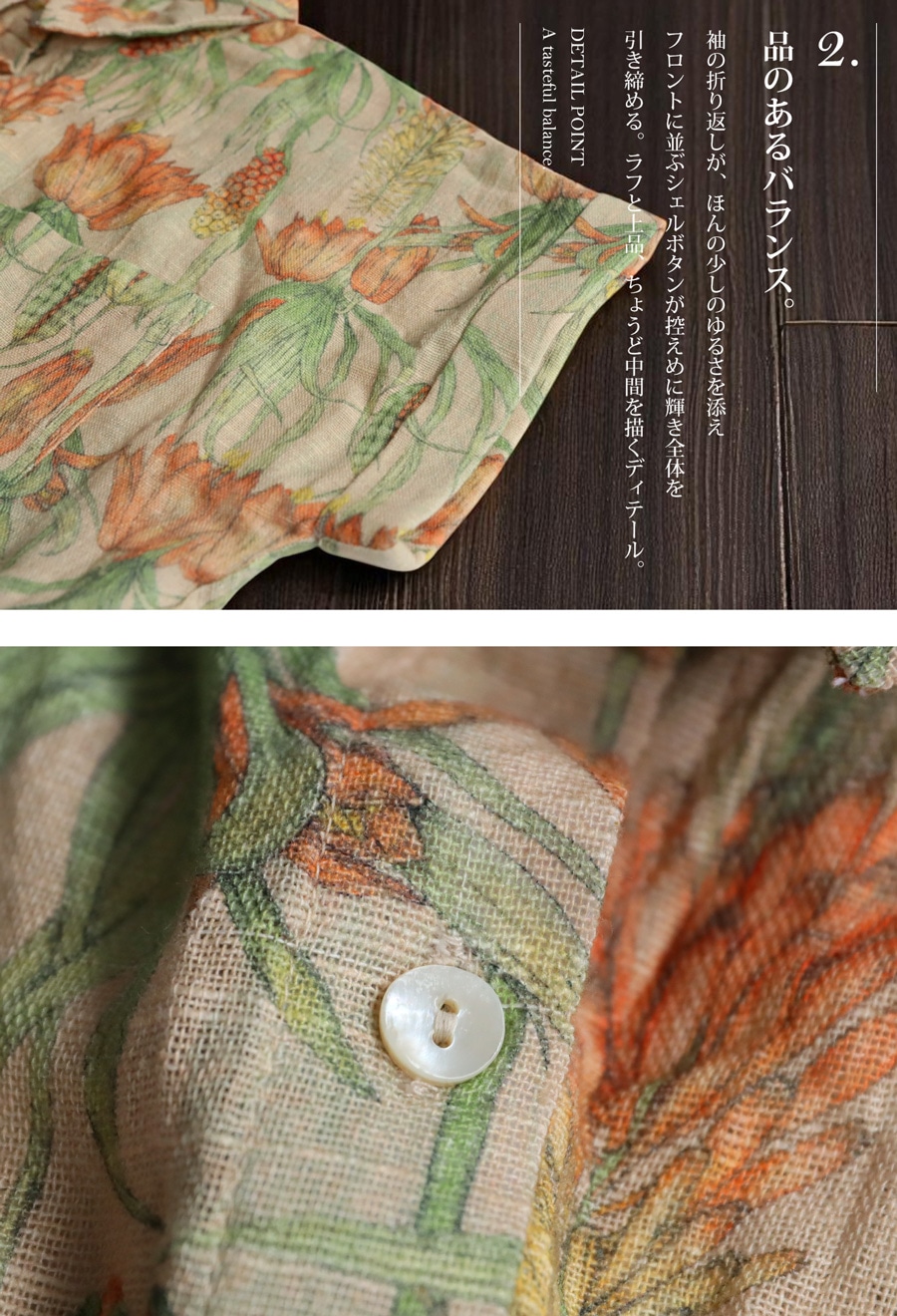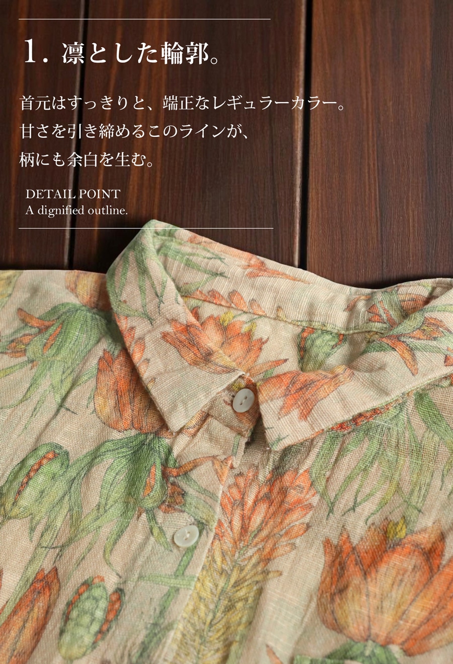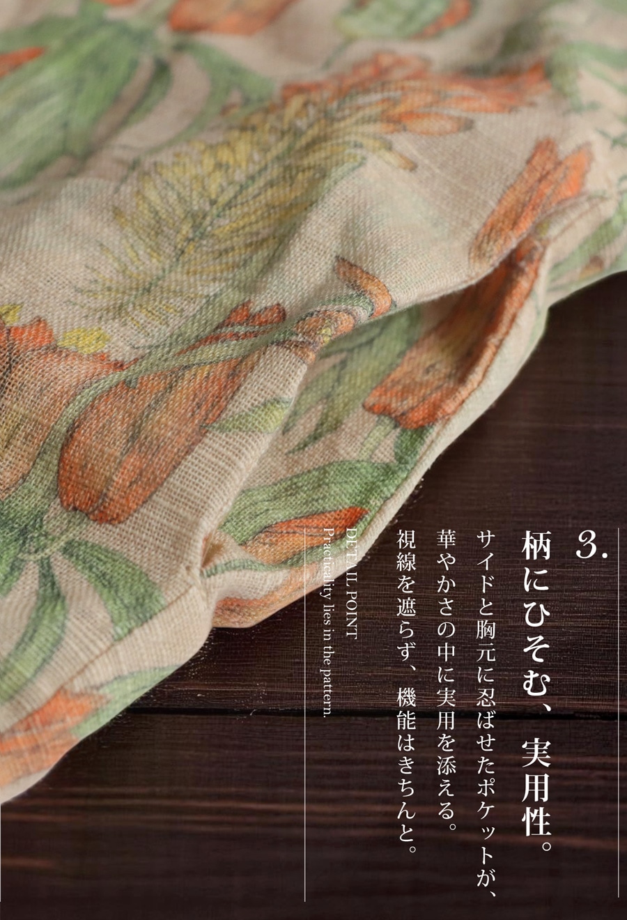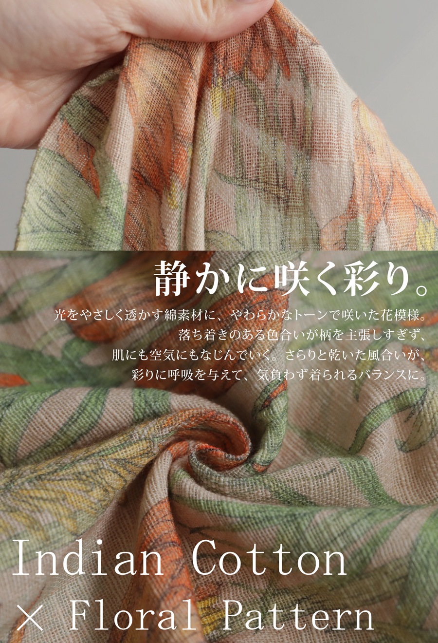 綿100%ならではの軽やかさと、繊細な透け感が魅力の生地に、柔らかなタッチの花模様をのせて、どこか懐かしさと新鮮さが同居するような仕上がりに。
