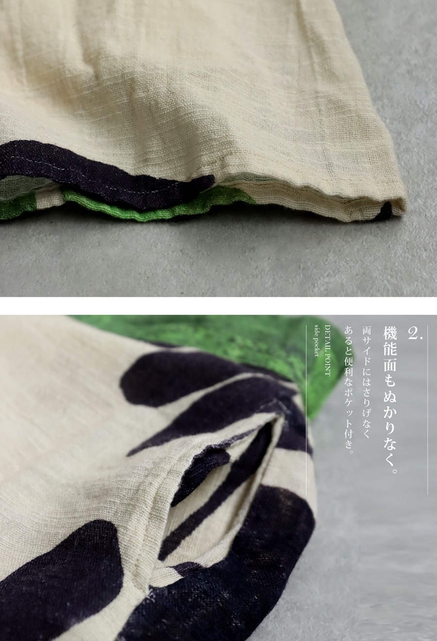カラーは生成り(アイボリー・生成・きなり・Ivory)をベースに、グリーン(緑・グリーン・Green)、ネイビー(紺・こん・ネイビーブルー・Navy)、レッド(赤・レッド・Aka)などの自然を想起させる配色で構成されています。