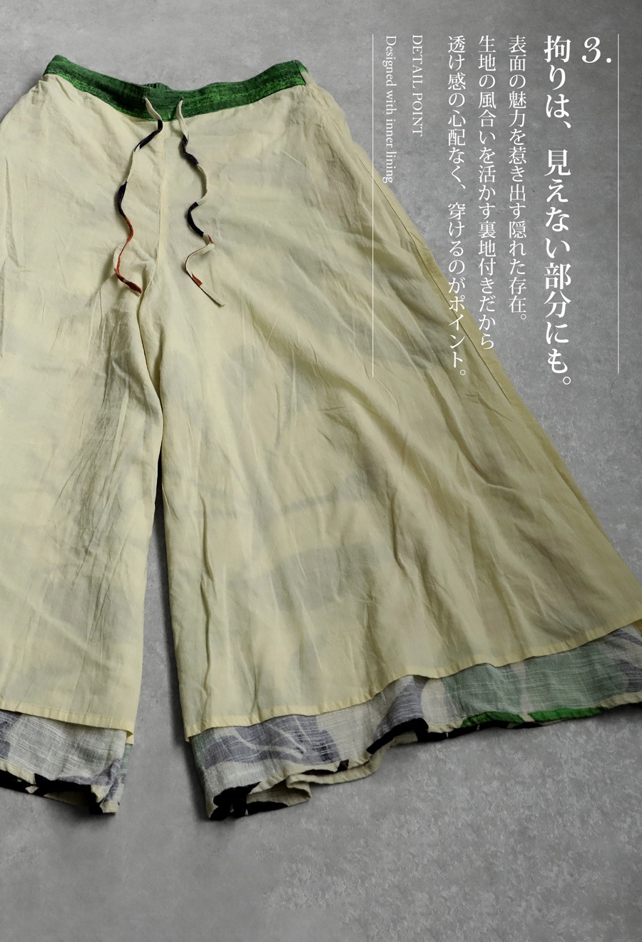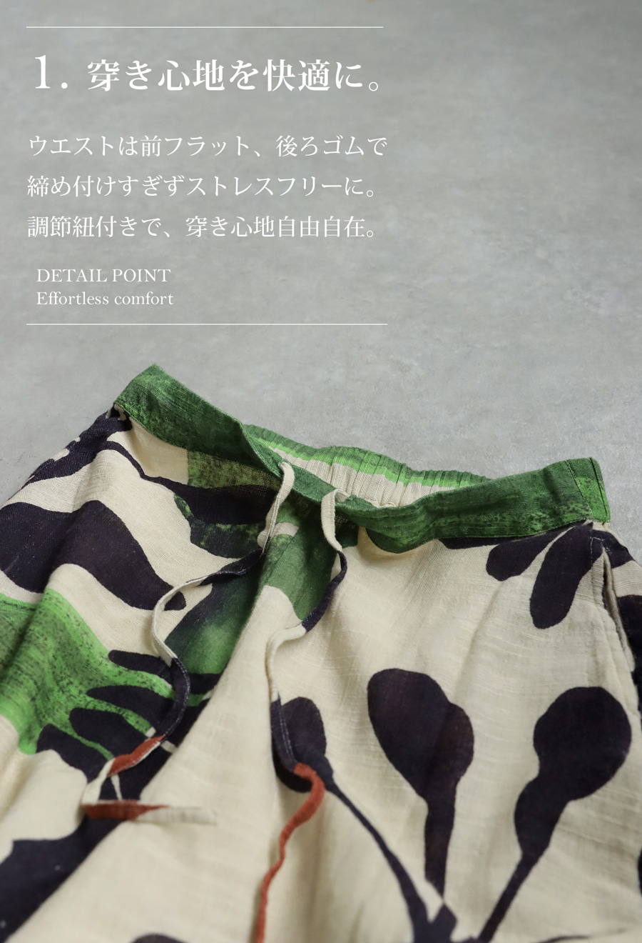 ウエストは後ろゴム仕様でストレスフリーな穿き心地に仕上げました。内側には調節可能な紐を備えており、サイズ感も自在に調整可能です。
