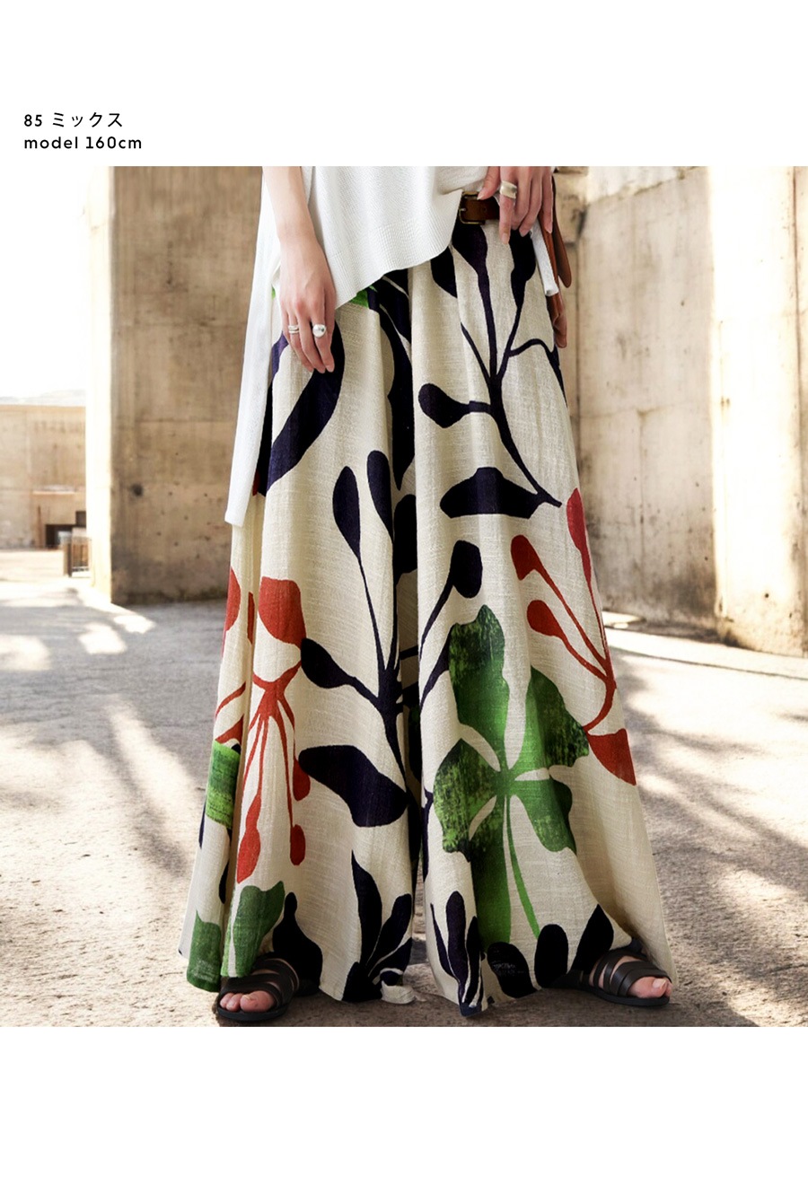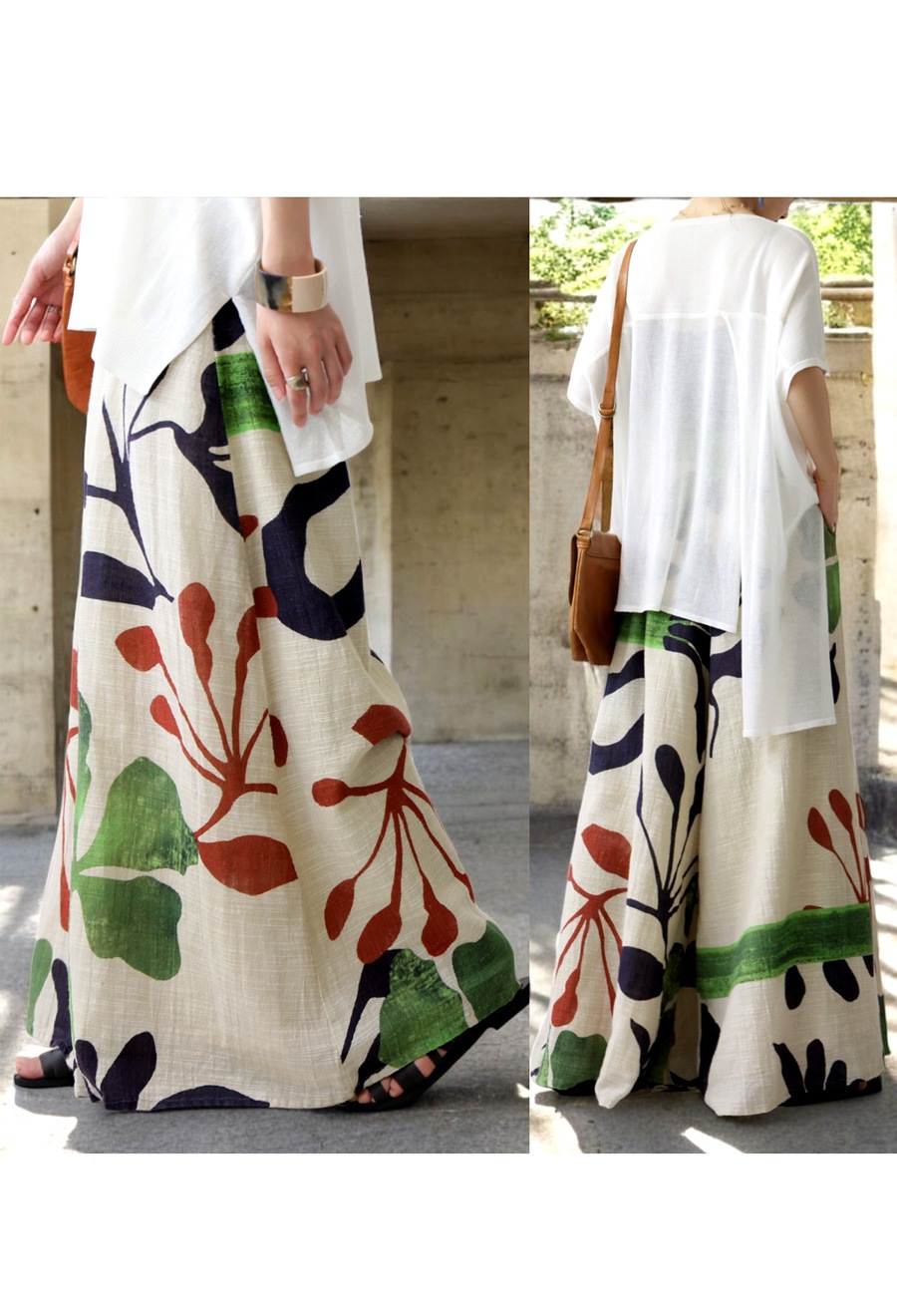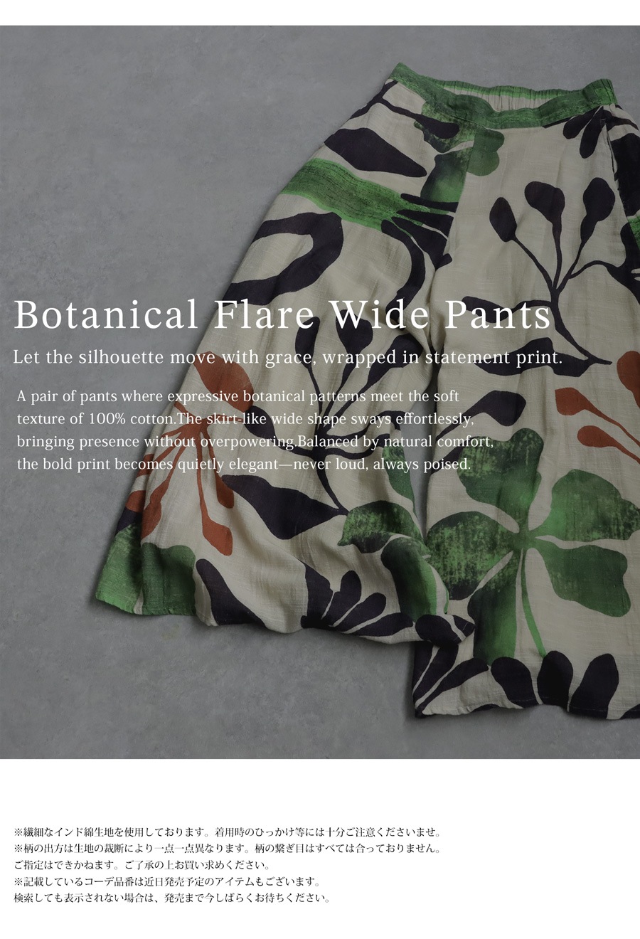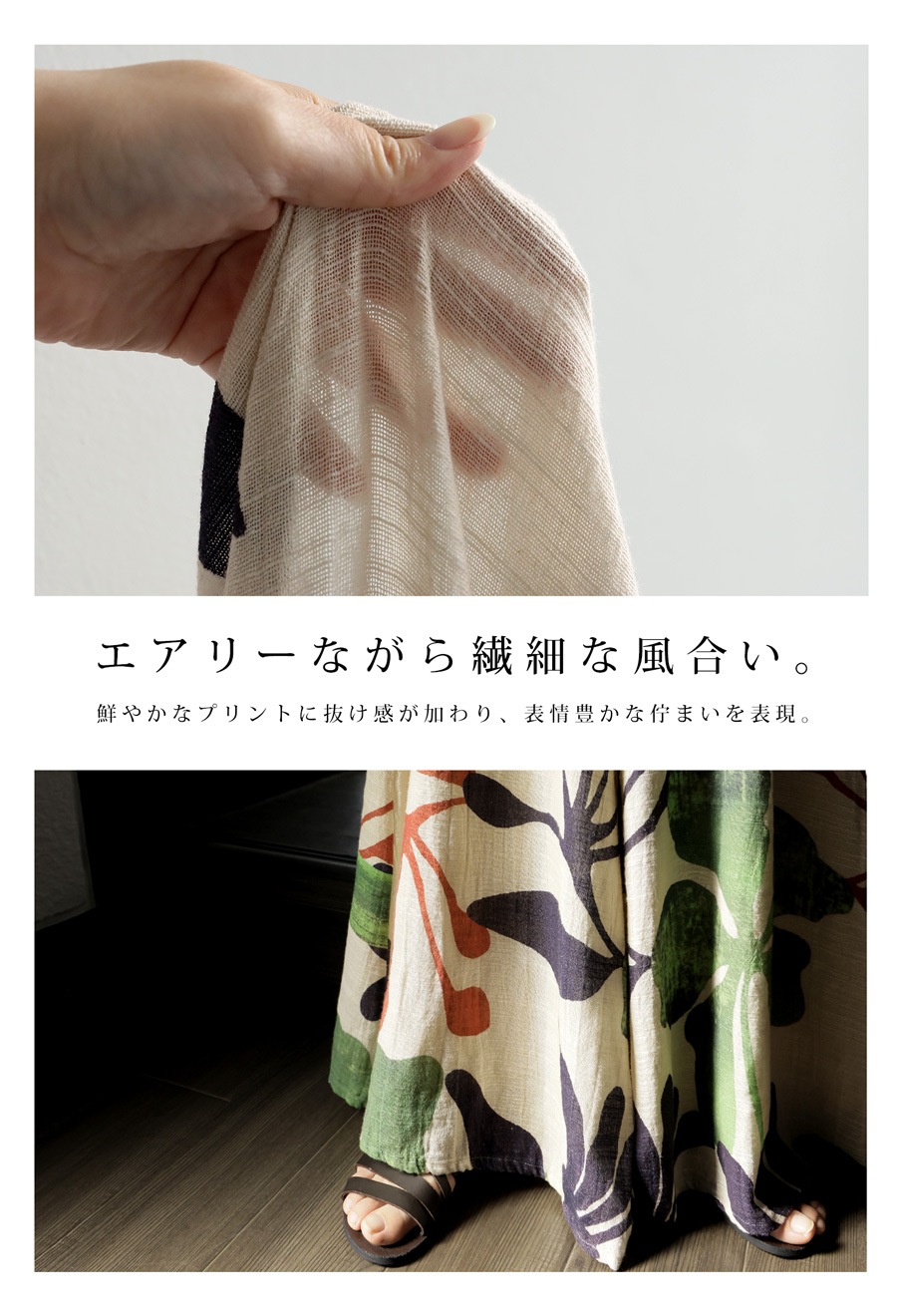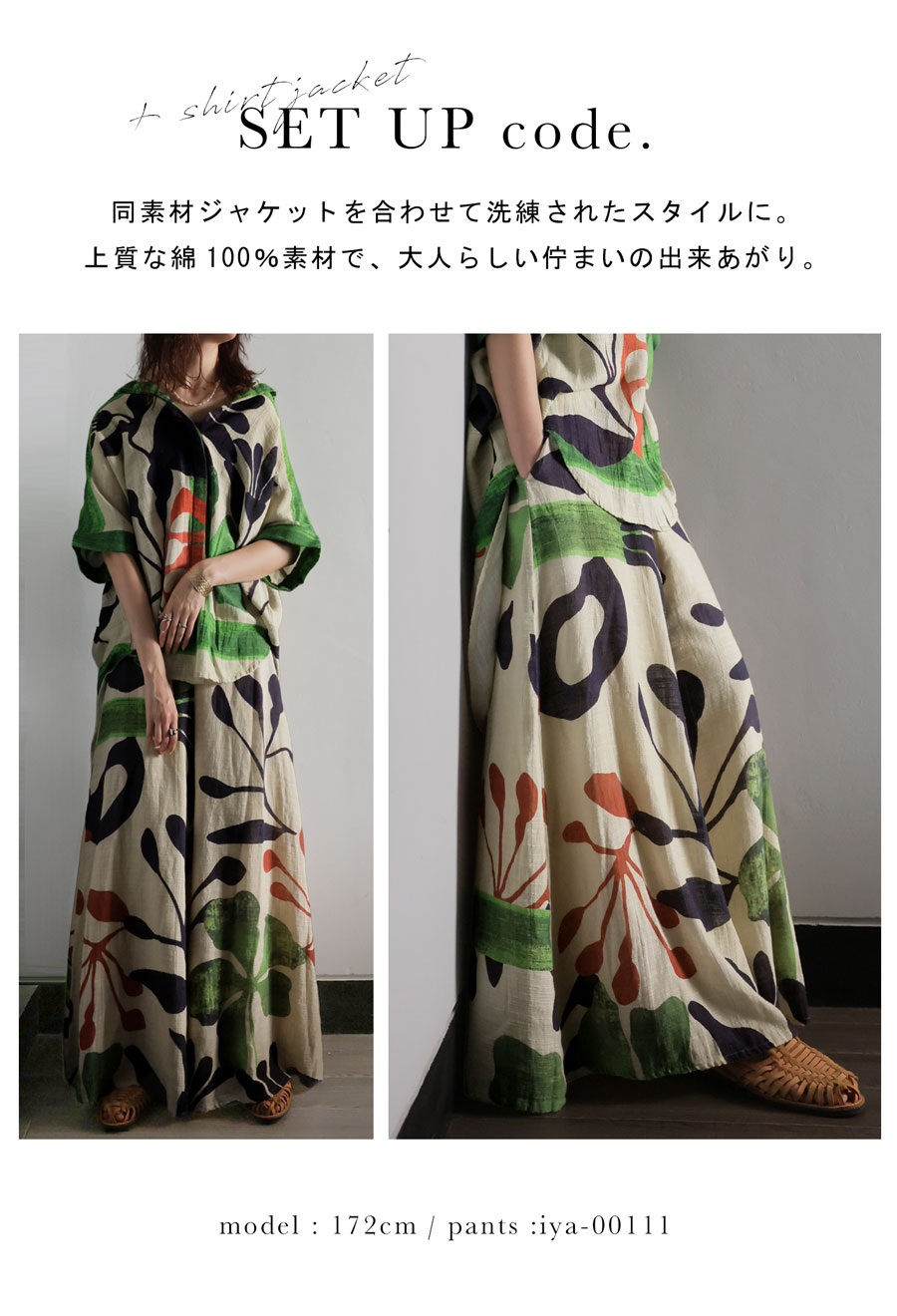 まるでアートピースを纏うような、存在感のあるボタニカル柄が目を惹くワイドパンツ。