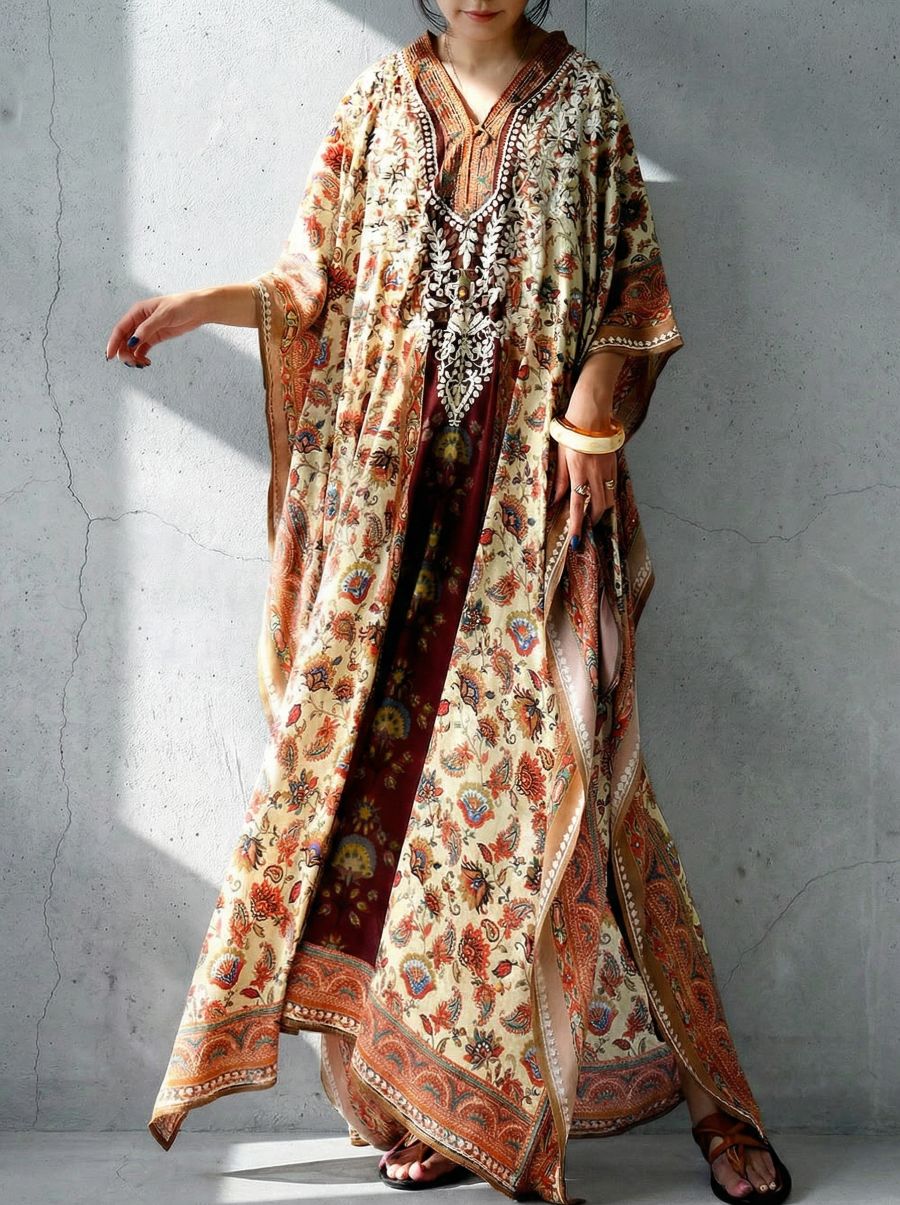 贅沢な刺繍が映えるカフタンワンピース。