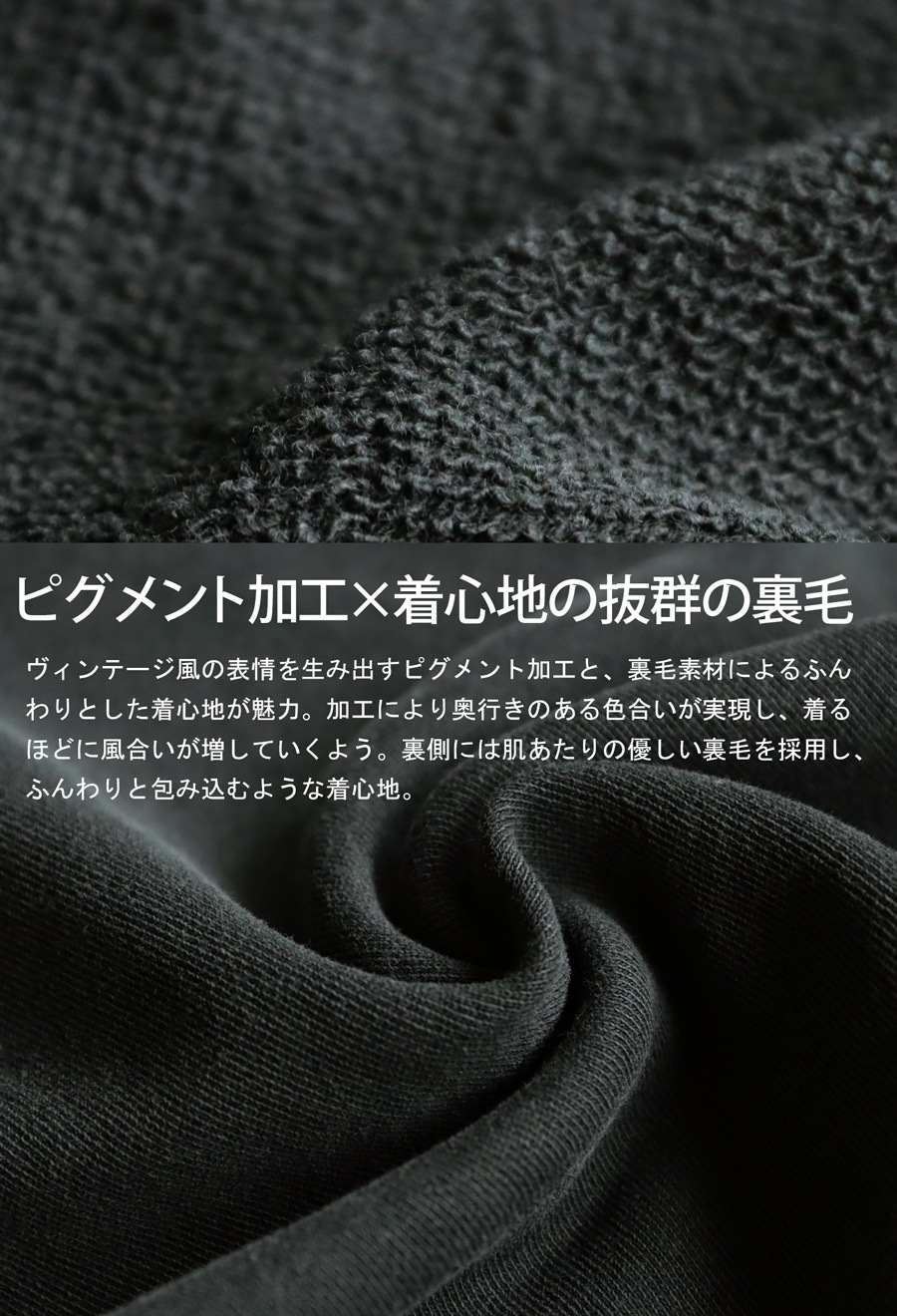 ピグメント加工によって一点一点異なる風合いに仕上げられ、着るほどに味わいが深まります。