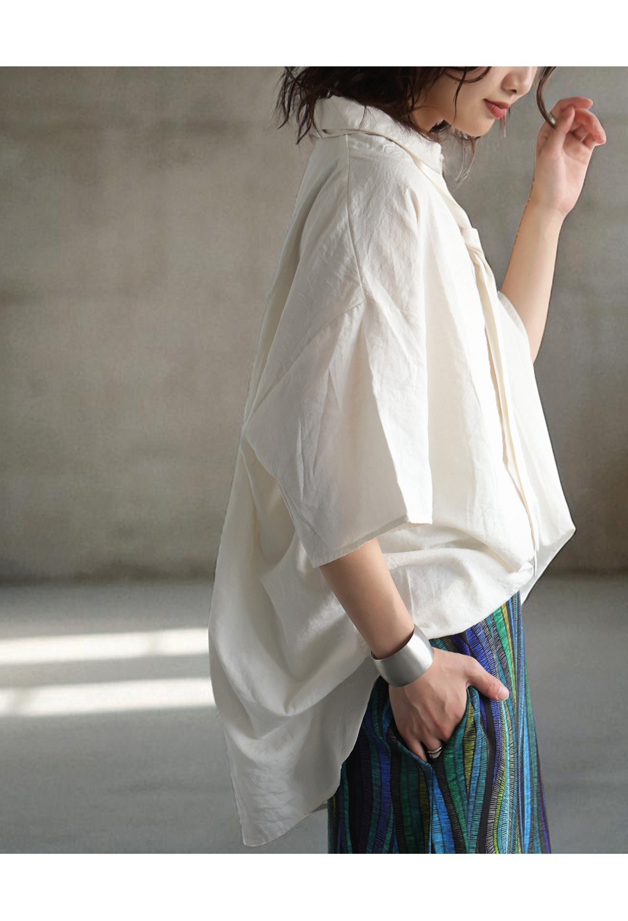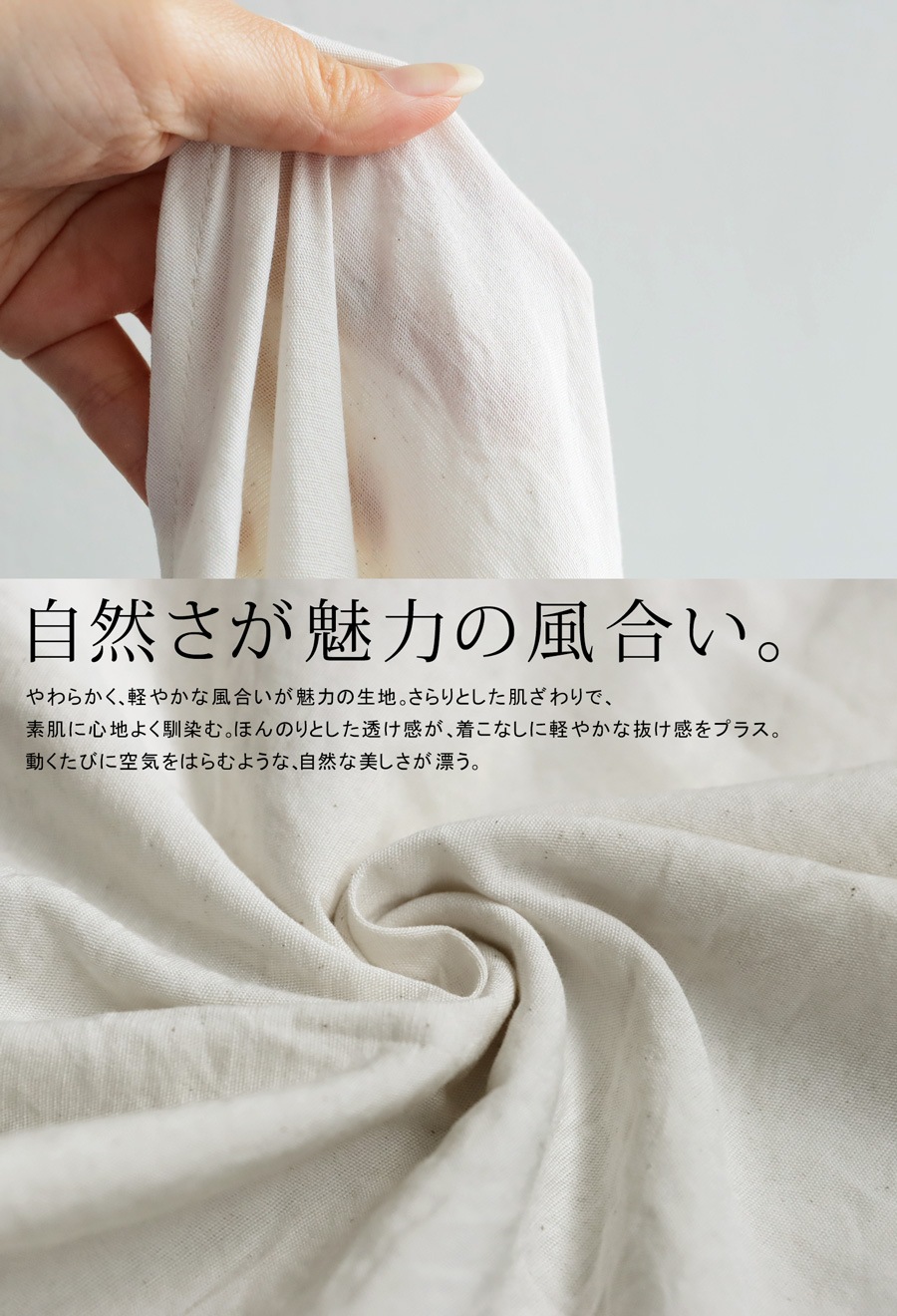 素材にはほんのりとナチュラルなシワ感のある綿混素材を使用し、見た目にも軽やか。