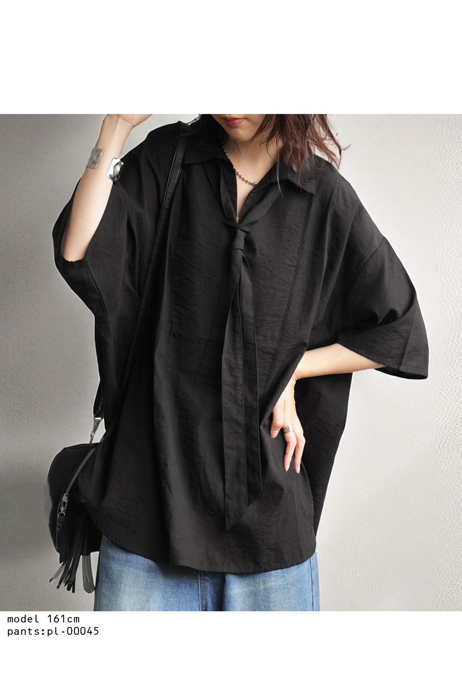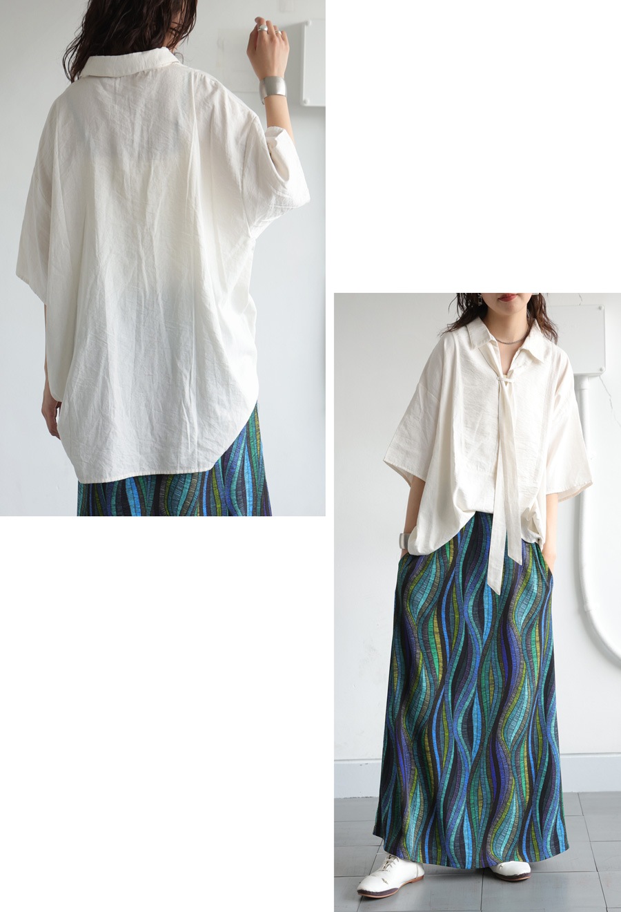 袖は二の腕を自然にカバーしてくれる五分袖寄りのデザインで、涼やかさもありながら安心感のあるシルエットです。