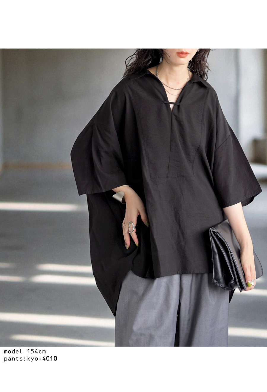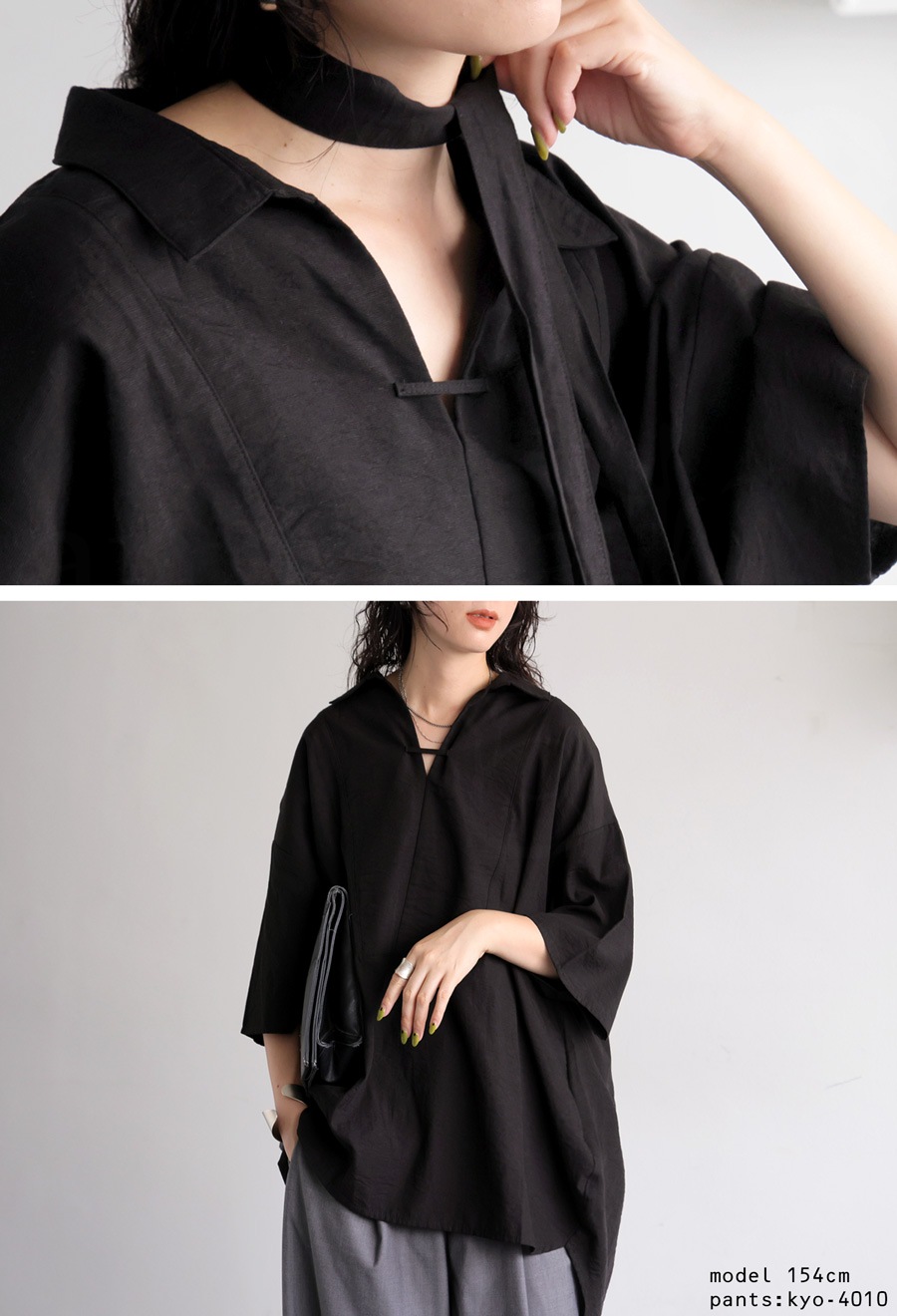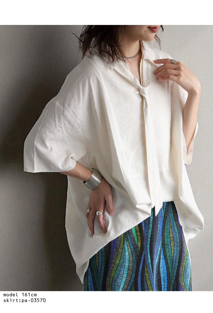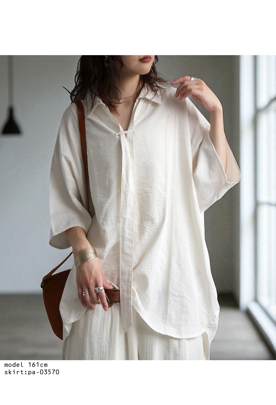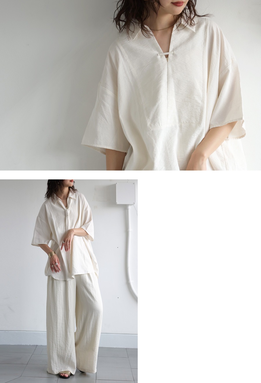 首元は抜け感のあるスキッパーネックデザインで、女性らしさときちんと感を両立。