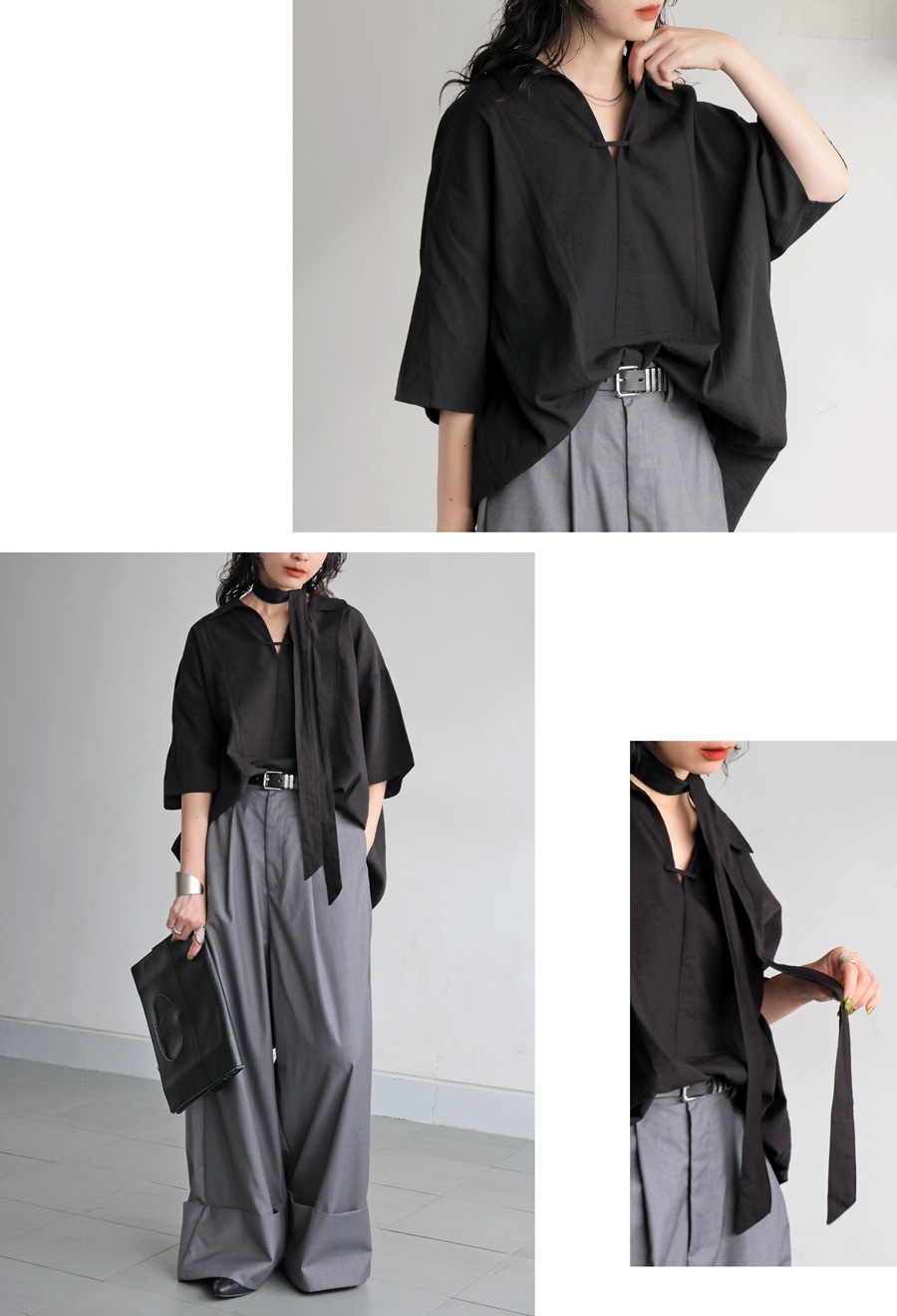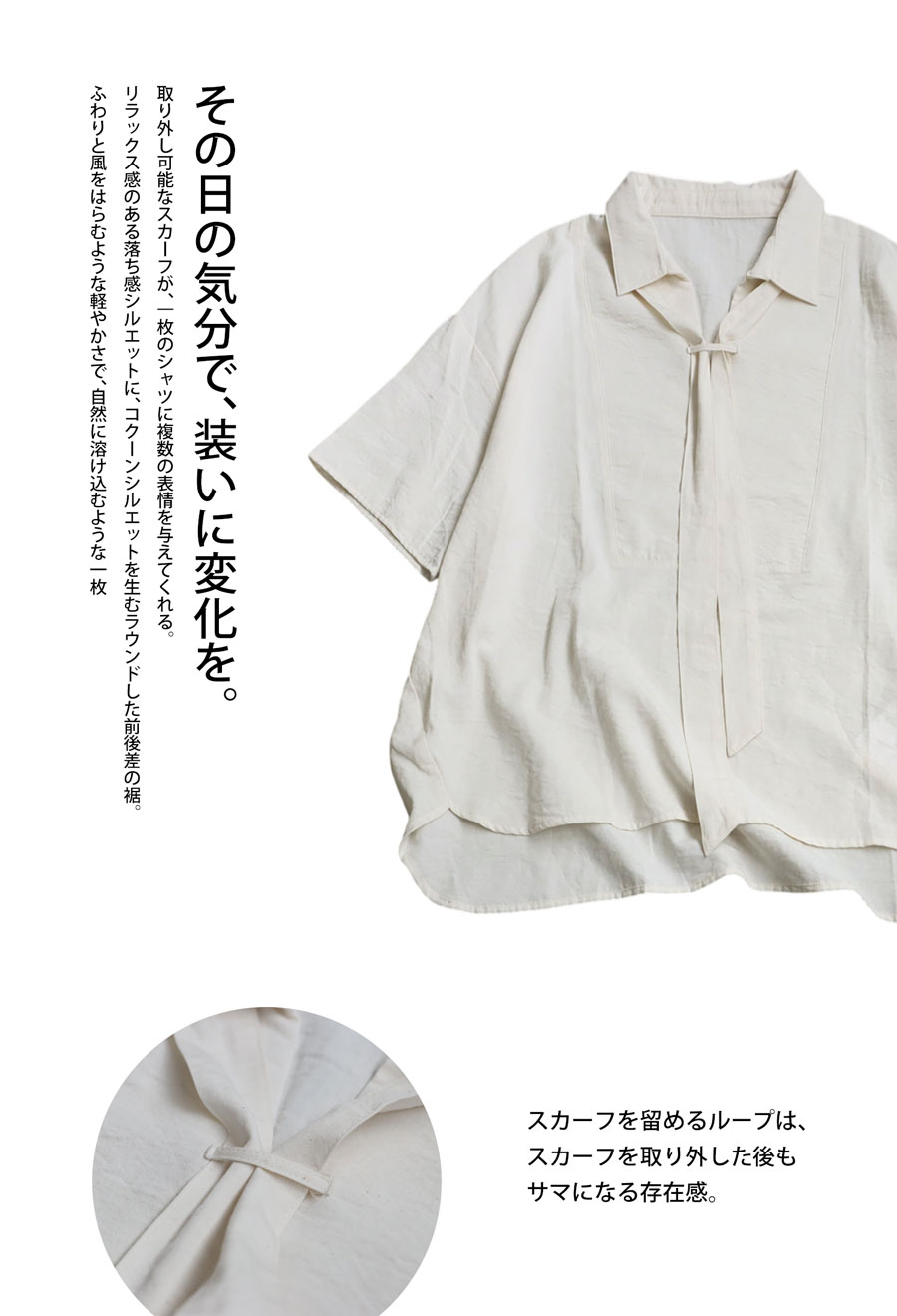 スカーフは取り外しが可能で、その日の気分やスタイリングに合わせて「巻く・外す・つける」のアレンジが楽しめます。